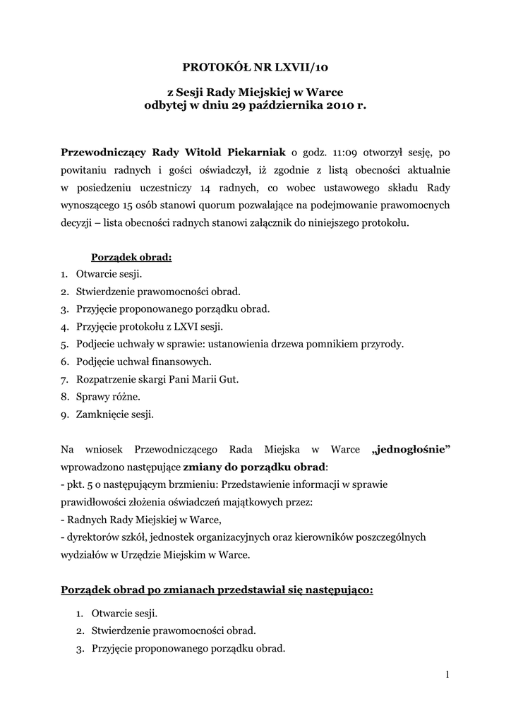 PROTOKÓŁ NR LXVII/10 z Sesji Rady Miejskiej w Warce odbytej w dniu 29 października 2010 r. Przewodniczący Rady Witold Piekarniak o godz. 11:09 otworzył sesję, po powitaniu radnych i gości oświadczył, iż zgodnie z listą obecności aktualnie w posiedzeniu uczestniczy 14 radnych, co wobec ustawowego składu Rady wynoszącego 15 osób stanowi quorum pozwalające na podejmowanie prawomocnych decyzji – lista obecności radnych stanowi załącznik do niniejszego protokołu. Porządek obrad: 1. Otwarcie sesji. 2. Stwierdzenie prawomocności obrad. 3. Przyjęcie proponowanego porządku obrad. 4. Przyjęcie protokołu z LXVI sesji. 5. Podjecie uchwały w sprawie: ustanowienia drzewa pomnikiem przyrody. 6. Podjęcie uchwał finansowych. 7. Rozpatrzenie skargi Pani Marii Gut. 8. Sprawy różne. 9. Zamknięcie sesji. Na wniosek Przewodniczącego Rada Miejska w Warce „jednogłośnie” wprowadzono następujące zmiany do porządku obrad: - pkt. 5 o następującym brzmieniu: Przedstawienie informacji w sprawie prawidłowości złożenia oświadczeń majątkowych przez: - Radnych Rady Miejskiej w Warce, - dyrektorów szkół, jednostek organizacyjnych oraz kierowników poszczególnych wydziałów w Urzędzie Miejskim w Warce. Porządek obrad po zmianach przedstawiał się następująco: 1. Otwarcie sesji. 2. Stwierdzenie prawomocności obrad. 3. Przyjęcie proponowanego porządku obrad. 1 4. Przyjęcie protokołu z LXVI sesji. 5. Przedstawienie informacji w sprawie prawidłowości złożenia oświadczeń majątkowych przez: - Radnych Rady Miejskiej w Warce, - dyrektorów szkół, jednostek organizacyjnych oraz kierowników poszczególnych wydziałów w Urzędzie Miejskim w Warce. 6. Podjecie uchwały w sprawie: ustanowienia drzewa pomnikiem przyrody. 7. Podjęcie uchwał finansowych. 8. Rozpatrzenie skargi Pani Marii Gut. 9. Sprawy różne. 10. Zamknięcie sesji. Ad.4. Przyjęcie protokołu z LXVI sesji. Przewodniczący Rady zapytał radnych, czy wnoszą pytania, uwagi do protokołu Nr LXVI/10 z Sesji Rady Miejskiej w Warce? Ponieważ pytań i uwag nie zgłoszono protokół został poddany pod głosowanie. Protokół Nr LXVI/10 został przyjęty „jednogłośnie”. Ad.5. Przedstawienie informacji w sprawie prawidłowości złożenia oświadczeń majątkowych przez: - Radnych Rady Miejskiej w Warce, - dyrektorów szkół, jednostek organizacyjnych oraz kierowników poszczególnych wydziałów w Urzędzie Miejskim w Warce. Przewodniczący Rady odczytał, pisma w sprawie prawidłowości złożenia oświadczeń majątkowych przez Przewodniczącego Rady Miejskiej, Burmistrza, Radnych Rady Miejskiej oraz dyrektorów szkół, jednostek organizacyjnych oraz kierowników poszczególnych wydziałów w Urzędzie miejskim w Warce. Zgodnie z 2 pismami skierowanymi do Rady Miejskiej oświadczenia majątkowe w/w osób zostały złożone prawidłowo i w terminie, oraz nie zostały wykazane większe niezgodności w treści oświadczeń majątkowych. Ad.6. Podjecie uchwały w sprawie: ustanowienia drzewa pomnikiem przyrody. Przewodniczący Rady przedstawił projekt uchwały druk nr 1 w sprawie: ustanowienia drzewa pomnikiem przyrody. Projekt uchwały stanowi załącznik do niniejszego protokołu. Radny Roman Kulczyk oświadczył, iż Komisje Rolnictwa, Finansów i Zdrowia na wspólnym posiedzeniu zaopiniowały pozytywnie –„jednogłośnie” - projekt uchwały druk nr 1. Następnie Przewodniczący zapytał, czy są pytania, uwagi do przedstawionego projektu uchwały? Ponieważ pytań i uwag nie zgłoszono projekt uchwały został poddany pod głosowanie. Rada Miejska w Rada Miejska w Warce w obecności 14 Radnych „jednogłośnie” – podjęła uchwałę w sprawie: ustanowienia drzewa pomnikiem Przyrody. Ad.7. Podjęcie uchwał finansowych. Przewodniczący Rady przedstawił projekt uchwały druk nr 2 w sprawie: określenia wysokości stawek podatku od środków transportowych na 2011 rok. Projekt uchwały stanowi załącznik do niniejszego protokołu. Radny Roman Kulczyk oświadczył, iż Komisje Rolnictwa, Finansów i Zdrowia na wspólnym posiedzeniu zaopiniowały pozytywnie –11 głosami „za” i 1 głosem „wstrzymującym” - projekt uchwały druk nr 2. 3 Następnie Przewodniczący zapytał, czy są pytania, uwagi do przedstawionego projektu uchwały? Ponieważ pytań i uwag nie zgłoszono projekt uchwały został poddany pod głosowanie. Rada Miejska w Rada Miejska w Warce w obecności 14 Radnych 13 głosami „za” i 1 głosem „wstrzymującym” – podjęła uchwałę w sprawie: określenia wysokości stawek podatku od środków transportowych na 2011 rok. Przewodniczący Rady przedstawił projekt uchwały druk nr 3 w sprawie: gromadzenia dochodów na wydzielonym rachunku przez samorządowe jednostki budżetowe prowadzące działalność określoną w ustawie z dnia 7 września 1991r. o systemie oświaty. Projekt uchwały stanowi załącznik do niniejszego protokołu. Radny Roman Kulczyk oświadczył, iż Komisje Rolnictwa, Finansów i Zdrowia na wspólnym posiedzeniu zaopiniowały pozytywnie –11 głosami „za” i 1 głosem „wstrzymującym” - projekt uchwały druk nr 3. Następnie Przewodniczący zapytał, czy są pytania, uwagi do przedstawionego projektu uchwały? Ponieważ pytań i uwag nie zgłoszono projekt uchwały został poddany pod głosowanie. Rada Miejska w Rada Miejska w Warce w obecności 14 Radnych „jednogłośnie” – podjęła uchwałę w sprawie: gromadzenia dochodów na wydzielonym rachunku przez samorządowe jednostki budżetowe prowadzące działalność określoną w ustawie z dnia 7 września 1991r. o systemie oświaty. 4 Przewodniczący Rady przedstawił projekt uchwały druk nr w sprawie: wprowadzenia zmian w uchwale budżetowej na rok 2011. Projekt uchwały stanowi załącznik do niniejszego protokołu. Radny Roman Kulczyk oświadczył, iż Komisje Rolnictwa, Finansów i Zdrowia na wspólnym posiedzeniu zaopiniowały pozytywnie –10 głosami „za