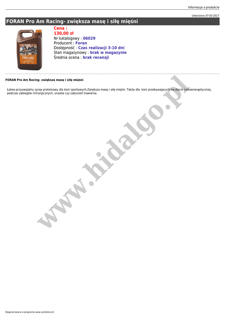 Informacje o produkcie Utworzono 07-03-2017 FORAN Pro Am Racing- zwiększa masę i siłę mięśni Cena : 130,00 zł Nr katalogowy : 06029 Producent : Foran Dostępność : Czas realizacji 3-10 dni Stan magazynowy : brak w magazynie Średnia ocena : brak recenzji l FORAN Pro Am Racing- zwiększa masę i siłę mięśni w w w .h id al go .p Łatwo przyswajalny syrop proteinowy dla koni sportowych.Zwiększa masę i siłę mięśni. Także dla koni przebywających na diecie niskoenergetycznej, podczas zabiegów chirurgicznych, urazów czy zaburzeń trawienia. Wygenerowano w programie www.oscGold.com Zastosowanie Łatwo przyswajany syrop proteinowy dla koni wyścigowych i sportowych. Zawiera niezbędne aminokwasy w najbardziej efektywnej postaci: di- i tripeptydów. Pozwala szybko uzupełniać zapotrzebowanie na białko podczas intensywnej pracy, a tym samym utrzymać konia w maksymalnej kondycji. Wskazania Skraca czas regeneracji po treningu, pomaga odbudowywać tkankę mięśniową. Preparat jest pomocny również w utrzymaniu kondycji koni przebywających na diecie niskoenergetycznej podczas zabiegów chirurgicznych, urazów czy zaburzeń trawienia. Zwiększa masę i siłę mięśni. Dawkowanie PRO-AM RACING jest bardzo szybko rozprowadzany w organizmie, może więc być podany w ciągu 1-2 godzin przed startem (jeśli to możliwe) oraz z pierwszym posiłkiem po zawodach. Podawać bezpośrednio do pyska lub z niewielka ilością paszy. Przed użyciem wstrząsnąć. Dorosłe konie (450-550 kg) - 100ml dziennie przez 5 dni przed zawodami i 5 dni po starcie. Rekonwalescencja – 100-150ml dwa razy dziennie przez pierwsze 10 dni, a następnie 100ml dziennie przez 20 dni. Nie zawiera substancji niedozwolonych. Okres stosowania PRO AM RACING może być różny w zależności od indywidualnych potrzeb i zaleceń lekarza weterynarii lub dietetyka. w .h • arginina • kwas aspartamowy • leucyna • glicyna • fenyloalanina • walina • prolina • lizyna • izoleucyna • tyrozyna • tryptofan • seryna • alanina • treonina • histydyna • metionina • cysteina • kwas glutaminowy • podstawoweaminokwasy id Zawiera głównie di- i tri-peptydy następujących aminokwasów: al go .p l Skład Białko surowe 38,9% Tłuszcz surowy 0% Włókno surowe 0% Węglowodany ogółem 18,3% Wilgotność 33,5% Popiół surowy 9,3% w Opakowanie 1000 ml lub 5000 ml w Przechowywanie Chronić przed mrozem. Przechowywać szczelnie zamknięte w chłodnym, suchym miejscu, niedostępnym dla dzieci. Dostępne opcje FORAN Pro Am Racing- zwiększa masę i siłę mięśni » Pojemność: 1000 ml, 5000 ml (+390,00 zł).