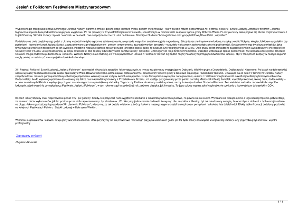 Jesień z Folklorem Festiwalem Międzynarodowym Wypełniona po brzegi sala kinowa Gminnego Ośrodka Kultury, ogromne emocje, piękne stroje i bardzo wysoki poziom wykonawców – tak w skrócie można podsumować XIII Festiwal Folkloru i Sztuki Ludowej „Jesień z Folklorem”. Jednak tegoroczna impreza była pod wieloma względami wyjątkowa. Po raz pierwszy w trzynastoletniej historii Festiwalu, uczestniczyło w nim tak wiele zespołów spoza gminy Dobrzeń Wielki. Po raz pierwszy także pojawił się akcent międzynarodowy. I to jaki! Gminny Ośrodek Kultury zaprosił do udziału w Festiwalu dwa zespoły taneczne z Łucka na Ukrainie: Dziecięce Studium Choreograficzne oraz grupę baletową Show-Balet „Inspiration”. Podzielony na dwie części występ gości z Ukrainy wzbudził nie tylko ogromne zainteresowanie, ale przede wszystkim został owacyjnie nagrodzony. Etiudy taneczne inspirowane ludową muzyką z okolic Wołynia, Węgier, folklorem cygańskim czy podaniami i legendami znad Jeziora Świteź, zaprezentowane z profesjonalizmem i pełnym temperamentu zaangażowaniem tancerek – wzbudziły niekłamany zachwyt dobrzeńskiej publiczności. Świadectwem tego była burza oklasków, jaka towarzyszyła ukraińskim tancerkom po ich występie. Podobnie niezwykle gorąco zostały przyjęte taneczne popisy dzieci ze Studium Choreograficznego w Łucku. Obie grupy od lat prowadzone są pod kierunkiem wykładowczyni choreografii na Uniwersytecie w Łucku Lesię Kosakowską. W ciągu ostatnich lat oba zespoły odwiedziły wiele państw Europy: od Serbii i Czarnogóry po kraje Śródziemnomorskie, wszędzie wzbudzając aplauz publiczności. 15 listopada umiejętności taneczne Ukrainek mogła podziwiać publiczność w Dobrzeniu Wielkim. Należy mieć nadzieję, że w kolejnych latach „Jesień z Folklorem” stawać się będzie międzynarodowym przeglądem twórczości ludowej, aby w ten sposób zespoły w naszym regionie mogły pełniej uczestniczyć w europejskim dorobku kulturalnym. XIII Festiwal Folkloru i Sztuki Ludowej „Jesień z Folklorem” zgromadził kilkanaście zespołów folklorystycznych, w tym po raz pierwszy występujące w Dobrzeniu Wielkim grupy z Dobrodzienia, Dobieszowic i Kosorowic. Po latach na dobrzeńskiej scenie wystąpiły Siołkowiczanki oraz zespół śpiewaczy z Walc. Barwne widowisko, pełne ciepła i profesjonalizmu, zafundowały widowni grupy z Gorzowa Śląskiego i Rudnik koło Wielunia. Działające na co dzień w Gminnym Ośrodku Kultury zespoły ludowe, niesione gorącą atmosferą sobotniego popołudnia, wzniosły się na wyżyny swoich umiejętności. Dzięki temu poziom występów na tegorocznej „Jesieni z Folklorem” mógł zadowolić nawet najbardziej wybrednych odbiorców. Dodać należy, że do wysokiego poziomu dostosowały się także nasi najmłodsi wykonawcy z Przedszkola w Brzeziu. Ich występ, przygotowany przez panie: Kornelię Macioszek i Beatę Zamelek, wywołał prawdziwą lawinę braw, dodać należy – w pełni zasłużonych! Każda z występujących grup została nagrodzona pamiątkową statuetką. Tegoroczny Festiwal okraszony został wystawą rzeźby ludowej autorstwa Norberta Klemana. Ten wieloletni instruktor dobrzeńskich zespołów ludowych, a jednocześnie pomysłodawca Festiwalu „Jesień z Folklorem”, w tym roku wystąpił w podwójnej roli: zarówno plastyka, jak i muzyka. To jego solowy występ zakończył sobotnie spotkanie z ludowością w dobrzeńskim GOK. Koncert folklorystyczny trwał nieprzerwanie ponad trzy i pół godziny. Każdy, kto przyszedł na to wyjątkowe spotkanie z amatorską twórczością ludową, na pewno się nie nudził. Wyrażane na bieżąco opinie o tegorocznej imprezie, potwierdzają, że zarówno dobór wykonawców, jak też poziom przez nich zaprezentowany, był strzałem w „10”. Wszyscy jednocześnie dodawali, że występ obu zespołów z Ukrainy, był tak naładowany energią, że w każdym z nich coś z tych emocji zostanie na długo. Jako organizatorzy i gospodarze XIII „Jesieni z Folklorem”, wierzymy, że tak będzie w istocie, a twórcy ludowi z naszego regionu zostali zainspirowani pomysłami na kolejne lata działalności. Efekty tej konfrontacji będziemy podziwiać na kolejnych Festiwalach Folkloru i Sztuki Ludowej w Dobrzeniu Wielkim. W imieniu organizatorów Festiwalu dziękujemy wszystkim osobom, które przyczyniły się do prawdziwie rodzinnego przyjęcia ukraińskich gości, jak też tych, którzy nas wsparli w organizacji imprezy, aby jej przebieg był sprawny i w pełni profesjonalny. Zapraszamy do Galerii Zbigniew Janowski 1/1