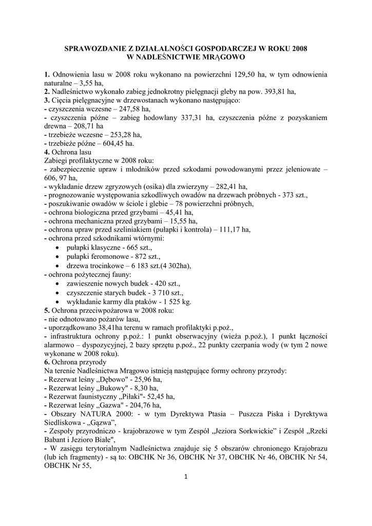 SPRAWOZDANIE Z DZIAŁALNOŚCI GOSPODARCZEJ W ROKU 2008 W NADLEŚNICTWIE MRĄGOWO 1. Odnowienia lasu w 2008 roku wykonano na powierzchni 129,50 ha, w tym odnowienia naturalne – 3,55 ha, 2. Nadleśnictwo wykonało zabieg jednokrotny pielęgnacji gleby na pow. 393,81 ha, 3. Cięcia pielęgnacyjne w drzewostanach wykonano następująco: - czyszczenia wczesne – 247,58 ha, - czyszczenia późne – zabieg hodowlany 337,31 ha, czyszczenia późne z pozyskaniem drewna – 208,71 ha - trzebieże wczesne – 253,28 ha, - trzebieże późne – 604,45 ha. 4. Ochrona lasu Zabiegi profilaktyczne w 2008 roku: - zabezpieczenie upraw i młodników przed szkodami powodowanymi przez jeleniowate – 606, 97 ha, - wykładanie drzew zgryzowych (osika) dla zwierzyny – 282,41 ha, - prognozowanie występowania szkodliwych owadów na drzewach próbnych - 373 szt., - poszukiwanie owadów w ściole i glebie – 78 powierzchni próbnych, - ochrona biologiczna przed grzybami – 45,41 ha, - ochrona mechaniczna przed grzybami – 15,55 ha, - ochrona upraw przed szeliniakiem (pułapki i kontrola) – 111,17 ha, - ochrona przed szkodnikami wtórnymi: pułapki klasyczne - 665 szt., pułapki feromonowe - 872 szt., drzewa trocinkowe – 6 183 szt.(4 302ha), - ochrona pożytecznej fauny: zawieszenie nowych budek - 420 szt., czyszczenie starych budek - 3 710 szt., wykładanie karmy dla ptaków - 1 525 kg. 5. Ochrona przeciwpożarowa w 2008 roku: - nie odnotowano pożarów lasu, - uporządkowano 38,41ha terenu w ramach profilaktyki p.poż., - infrastruktura ochrony p.poż.: 1 punkt obserwacyjny (wieża p.poż.), 1 punkt łączności alarmowo – dyspozycyjnej, 2 bazy sprzętu p.poż., 22 punkty czerpania wody (w tym 2 nowe wykonane w 2008 roku). 6. Ochrona przyrody Na terenie Nadleśnictwa Mrągowo istnieją następujące formy ochrony przyrody: - Rezerwat leśny „Dębowo" - 25,96 ha, - Rezerwat leśny „Bukowy" - 8,30 ha, - Rezerwat faunistyczny „Piłaki"- 52,45 ha, - Rezerwat leśny „Gazwa" - 204,76 ha, - Obszary NATURA 2000: - w tym Dyrektywa Ptasia – Puszcza Piska i Dyrektywa Siedliskowa - „Gązwa”, - Zespoły przyrodniczo - krajobrazowe w tym Zespół „Jeziora Sorkwickie” i Zespół „Rzeki Babant i Jezioro Białe", - W zasięgu terytorialnym Nadleśnictwa znajduje się 5 obszarów chronionego Krajobrazu (lub ich fragmenty) - są to: OBCHK Nr 36, OBCHK Nr 37, OBCHK Nr 46, OBCHK Nr 54, OBCHK Nr 55, 1 - Leśny Kompleks Promocyjny „Lasy Mazurskie" w jego skład wchodzi cały obręb Mrągowo, - Pomniki przyrody jako pojedyncze twory przyrody żywej i nieożywionej lub ich skupiska o szczególnej wartości przyrodniczej występują w ilości 31 szt. - są to głównie drzewa i głazy narzutowe, - W lasach nadleśnictwa znajdują się wraz z wyznaczonymi wokół gniazd strefami ochronnymi stanowiska orła bielika, orlika krzykliwego i puchacza, - Drzewostany wodochronne na powierzchni 1494,93ha. 7. Łowiectwo: Nadleśnictwo nadzoruje, by stan zwierzyny w łowiskach był utrzymywany na poziomie, przy którym występują szkody w drzewostanach gospodarczo znośne. Celowi temu służy m.in. coroczne, wspólne z Kołami Łowieckimi, przeprowadzanie inwentaryzacji zwierzyny bytującej na administrowanych przez nadleśnictwo terenach. Ilość zwierzyny według stanu na 10.03.2008 (dane z inwentaryzacji), przedstawia się następująco: ŁOWNE OBJĘTE MORATORIUM OBJĘTE OCHRONĄ - jeleń - 741 - łoś - 51 - wilki – 16 - sarna – 1 787 - rysie – 2 - dzik – 871 - bobry st. rodz. – 63 - lis – 707 - wydry 233 - jenot – 289 krukowate: 3481 - borsuk – 220 - kruk – 708 - kuna domowa – 149 - sroka – 1516 - kuna leśna – 214 - wrona - 1256 - norka amerykańska – 531 - tchórz – 195 - piżmak – 28 - zając – 1652 - dziki królik – 125 - jarząbek – 132 - bażant - 69 - kuropatwa - 393 Koła łowieckie w okresie zimowym mają za zadanie dokarmiać zwierzynę oraz w celu zmniejszenia szkód w uprawach rolnych utrzymywać poletka łowieckie, pasy zaporowe i łąki śródleśne jako bazę żerową. Dokarmianie w minionym okresie na terenie Nadleśnictwa Mrągowo przedstawiało się to następująco: Karma i sól Wykonanie zadań Plan na rok gosp. planowanych w roku gosp. 2008/2009 2007/2008 Objętościowa sucha 22,7 ton 33,2 ton Objętościowa soczysta 196,7 ton 235 ton Treściwa 74,7 ton 90 ton Sól 4 tony 4,4 ton Poletka łowieckie stanowiące 70 ha 85,5 ha żer dla zwierzyny Pasy zaporowe 17 szt. o długości 3,25 km 16 szt. o długości 4,65 km Zagospodarowane łąki 22,85 ha 23,85 ha śródleśne i przyleśne 2 8. Wykonanie inwestycji i remontów: W roku 2008 wyremontowano i zmodernizowano 7 osad funkcyjnych oraz 7 budynków gospodarczych, zbudowano dwa budynki gospodarcze, przebudowano 1 drogę leśną o długości 0,8 km oraz wykonano remontowany na 90 km dróg leśnych. W roku 2008 rozpoczęto budowę osady leśnej, przygotowano projekt „Małej retencji” w nadleśnictwie, projekt przebudowy drogi w Leśnictwie Kromnice. 9. Pozyskanie i sprzedaż drewna: W roku 2008 Nadleśnictwo Mrągowo pozyskało następującą ilość drewna: - Grubizna: iglasta – 57 476,64m3, liściasta – 32 109,57m3, - Drobnica (iglasta i liściasta) – 2 613,67 m3. Sprzedaż drewna: - odbiorcom na umowy sprzedaży: 76 924 m3, - sprzedaż detaliczna 13 457 m3. 10. Szkodnictwo leśne. W roku 2008 zarejestrowano: - zwalczanie szkodnictwa leśnego: 36 przypadków bezprawnego korzystania z lasu (mandaty i pouczenia), - kradzież drewna w nadleśnictwie: zarejestrowano 12 kradzieży drewna o masie 35 m3 z tego w przypadku 12 kradzieży wykryto sprawców, - postępowanie w sprawie o wykroczenia: upoważnionych pracowników Służby Leśnej do stosowania postępowania mandatowego jest w nadleśnictwie 30 osób, w tym 2 strażników leśnych. 3