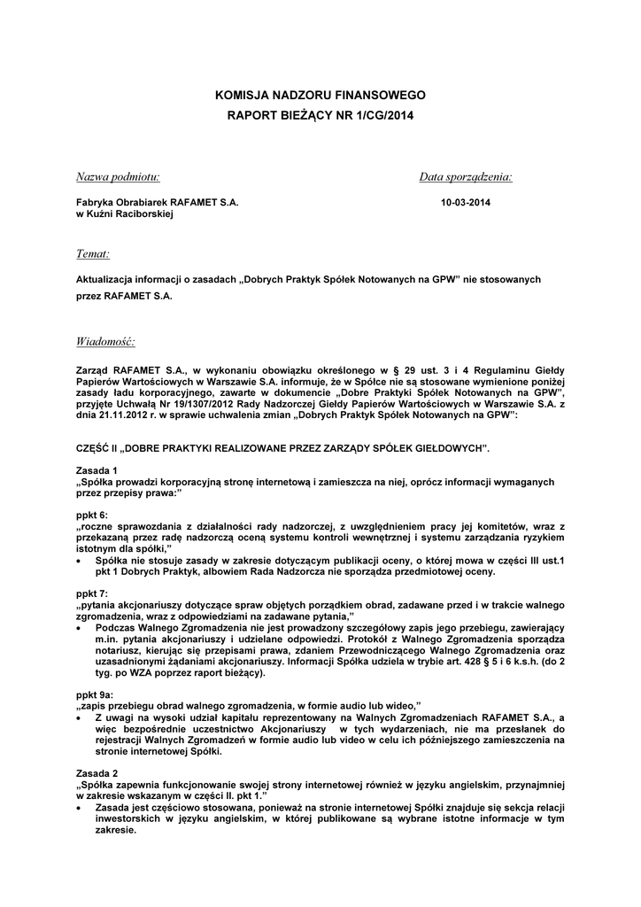 KOMISJA NADZORU FINANSOWEGO RAPORT BIEŻĄCY NR 1/CG/2014 Nazwa podmiotu: Fabryka Obrabiarek RAFAMET S.A. w Kuźni Raciborskiej Data sporządzenia: 10-03-2014 Temat: Aktualizacja informacji o zasadach „Dobrych Praktyk Spółek Notowanych na GPW” nie stosowanych przez RAFAMET S.A. Wiadomość: Zarząd RAFAMET S.A., w wykonaniu obowiązku określonego w § 29 ust. 3 i 4 Regulaminu Giełdy Papierów Wartościowych w Warszawie S.A. informuje, że w Spółce nie są stosowane wymienione poniżej zasady ładu korporacyjnego, zawarte w dokumencie „Dobre Praktyki Spółek Notowanych na GPW”, przyjęte Uchwałą Nr 19/1307/2012 Rady Nadzorczej Giełdy Papierów Wartościowych w Warszawie S.A. z dnia 21.11.2012 r. w sprawie uchwalenia zmian „Dobrych Praktyk Spółek Notowanych na GPW”: CZĘŚĆ II „DOBRE PRAKTYKI REALIZOWANE PRZEZ ZARZĄDY SPÓŁEK GIEŁDOWYCH”. Zasada 1 „Spółka prowadzi korporacyjną stronę internetową i zamieszcza na niej, oprócz informacji wymaganych przez przepisy prawa:” ppkt 6: „roczne sprawozdania z działalności rady nadzorczej, z uwzględnieniem pracy jej komitetów, wraz z przekazaną przez radę nadzorczą oceną systemu kontroli wewnętrznej i systemu zarządzania ryzykiem istotnym dla spółki,” • Spółka nie stosuje zasady w zakresie dotyczącym publikacji oceny, o której mowa w części III ust.1 pkt 1 Dobrych Praktyk, albowiem Rada Nadzorcza nie sporządza przedmiotowej oceny. ppkt 7: „pytania akcjonariuszy dotyczące spraw objętych porządkiem obrad, zadawane przed i w trakcie walnego zgromadzenia, wraz z odpowiedziami na zadawane pytania,” • Podczas Walnego Zgromadzenia nie jest prowadzony szczegółowy zapis jego przebiegu, zawierający m.in. pytania akcjonariuszy i udzielane odpowiedzi. Protokół z Walnego Zgromadzenia sporządza notariusz, kierując się przepisami prawa, zdaniem Przewodniczącego Walnego Zgromadzenia oraz uzasadnionymi żądaniami akcjonariuszy. Informacji Spółka udziela w trybie art. 428 § 5 i 6 k.s.h. (do 2 tyg. po WZA poprzez raport bieżący). ppkt 9a: „zapis przebiegu obrad walnego zgromadzenia, w formie audio lub wideo,” • Z uwagi na wysoki udział kapitału reprezentowany na Walnych Zgromadzeniach RAFAMET S.A., a więc bezpośrednie uczestnictwo Akcjonariuszy w tych wydarzeniach, nie ma przesłanek do rejestracji Walnych Zgromadzeń w formie audio lub video w celu ich późniejszego zamieszczenia na stronie internetowej Spółki. Zasada 2 „Spółka zapewnia funkcjonowanie swojej strony internetowej również w języku angielskim, przynajmniej w zakresie wskazanym w części II. pkt 1.” • Zasada jest częściowo stosowana, ponieważ na stronie internetowej Spółki znajduje się sekcja relacji inwestorskich w języku angielskim, w której publikowane są wybrane istotne informacje w tym zakresie. CZĘŚĆ III „DOBRE PRAKTYKI STOSOWANE PRZEZ CZŁONKÓW RAD NADZORCZYCH.” Zasada 1 „Poza czynnościami wymienionymi w przepisach prawa rada nadzorcza powinna:” ppkt 1: „raz w roku sporządzać i przedstawiać zwyczajnemu walnemu zgromadzeniu zwięzłą ocenę sytuacji spółki, z uwzględnieniem systemu kontroli wewnętrznej i systemu zarządzania ryzykiem istotnym dla spółki,” • Rada Nadzorcza nie sporządza zwięzłej oceny sytuacji Spółki w zakresie opisanym w niniejszej zasadzie. Sporządzana corocznie ocena sprawozdania Zarządu i sprawozdania finansowego Spółki, w ocenie Rady Nadzorczej, zawiera elementy umożliwiające dokonanie przez Walne Zgromadzenie prawidłowej oceny sytuacji Spółki. Zasada 6 „Przynajmniej dwóch członków rady nadzorczej powinno spełniać kryteria niezależności od spółki i podmiotów pozostających w istotnym powiązaniu ze spółką. W zakresie kryteriów niezależności członków rady nadzorczej powinien być stosowany Załącznik II do Zalecenia Komisji Europejskiej z dnia 15 lutego 2005 r. dotyczącego roli dyrektorów niewykonawczych lub będących członkami rady nadzorczej spółek giełdowych i komisji rady (nadzorczej). Niezależnie od postanowień pkt b) wyżej wymienionego Załącznika osoba będąca pracownikiem spółki, podmiotu zależnego lub podmiotu stowarzyszonego nie może być uznana za spełniającą kryteria niezależności, o których mowa w tym Załączniku. Ponadto za powiązanie z akcjonariuszem wykluczające przymiot niezależności członka rady nadzorczej w rozumieniu niniejszej zasady rozumie się rzeczywiste i istotne powiązanie z akcjonariuszem mającym prawo do wykonywania 5 % i więcej ogólnej liczby głosów na walnym zgromadzeniu.” • Zgodnie z obowiązującymi przepisami prawa, członkowie Rady Nadzorczej powoływani są w sposób suwerenny przez Walne Zgromadzenie Spółki, zatem nie ma podstaw do ograniczania swobody w wyborze członków Rady Nadzorczej. Zasada 8 „W zakresie zadań i funkcjonowania komitetów działających w radzie nadzorczej powinien być stosowany Załącznik I do Zalecenia Komisji Europejskiej z dnia 15 lutego 2005 r. dotyczącego roli dyrektorów niewykonawczych (T).” • W Radzie Nadzorczej funkcjonuje jedynie Komitet Audytu, w którym na podstawie ustawy o biegłych rewidentach zasiada jeden członek niezależny, zaś załącznik I do Zalecenia Komisji Europejskiej zakłada dwie osoby niezależne. CZĘŚĆ IV „DOBRE PRAKTYKI STOSOWANE PRZEZ AKCJONARIUSZY.” Zasada 1 „Przedstawicielom mediów powinno się umożliwiać obecność na walnych zgromadzeniach.” • W walnych zgromadzeniach akcjonariuszy Spółki udział biorą osoby uprawnione i obsługujące WZA. Spółka nie widzi potrzeby wprowadzania dodatkowych zobowiązań dla akcjonariuszy dotyczących szczególnego umożliwiania obecności na WZA przedstawicielom mediów. Obowiązujące przepisy prawa, w tym dotyczące raportów bieżących i okresowych przekazywanych przez emitentów papierów wartościowych, w wystarczający sposób regulują wykonanie nałożonych na spółki publiczne obowiązk