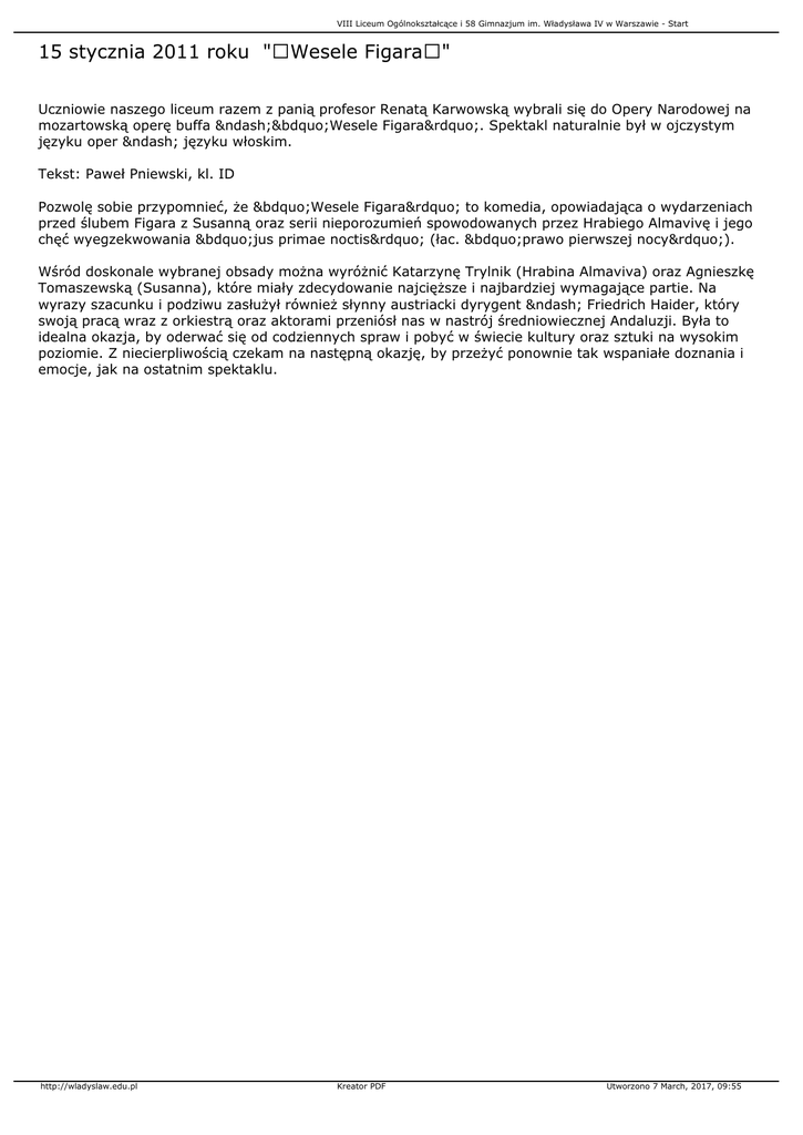 VIII Liceum Ogólnokształcące i 58 Gimnazjum im. Władysława IV w Warszawie - Start 15 stycznia 2011 roku "Wesele Figara" Uczniowie naszego liceum razem z panią profesor Renatą Karwowską wybrali się do Opery Narodowej na mozartowską operę buffa –„Wesele Figara”. Spektakl naturalnie był w ojczystym języku oper – języku włoskim. Tekst: Paweł Pniewski, kl. ID Pozwolę sobie przypomnieć, że „Wesele Figara” to komedia, opowiadająca o wydarzeniach przed ślubem Figara z Susanną oraz serii nieporozumień spowodowanych przez Hrabiego Almavivę i jego chęć wyegzekwowania „jus primae noctis” (łac. „prawo pierwszej nocy”). Wśród doskonale wybranej obsady można wyróżnić Katarzynę Trylnik (Hrabina Almaviva) oraz Agnieszkę Tomaszewską (Susanna), które miały zdecydowanie najcięższe i najbardziej wymagające partie. Na wyrazy szacunku i podziwu zasłużył również słynny austriacki dyrygent – Friedrich Haider, który swoją pracą wraz z orkiestrą oraz aktorami przeniósł nas w nastrój średniowiecznej Andaluzji. Była to idealna okazja, by oderwać się od codziennych spraw i pobyć w świecie kultury oraz sztuki na wysokim poziomie. Z niecierpliwością czekam na następną okazję, by przeżyć ponownie tak wspaniałe doznania i emocje, jak na ostatnim spektaklu. http://wladyslaw.edu.pl Kreator PDF Utworzono 7 March, 2017, 09:55