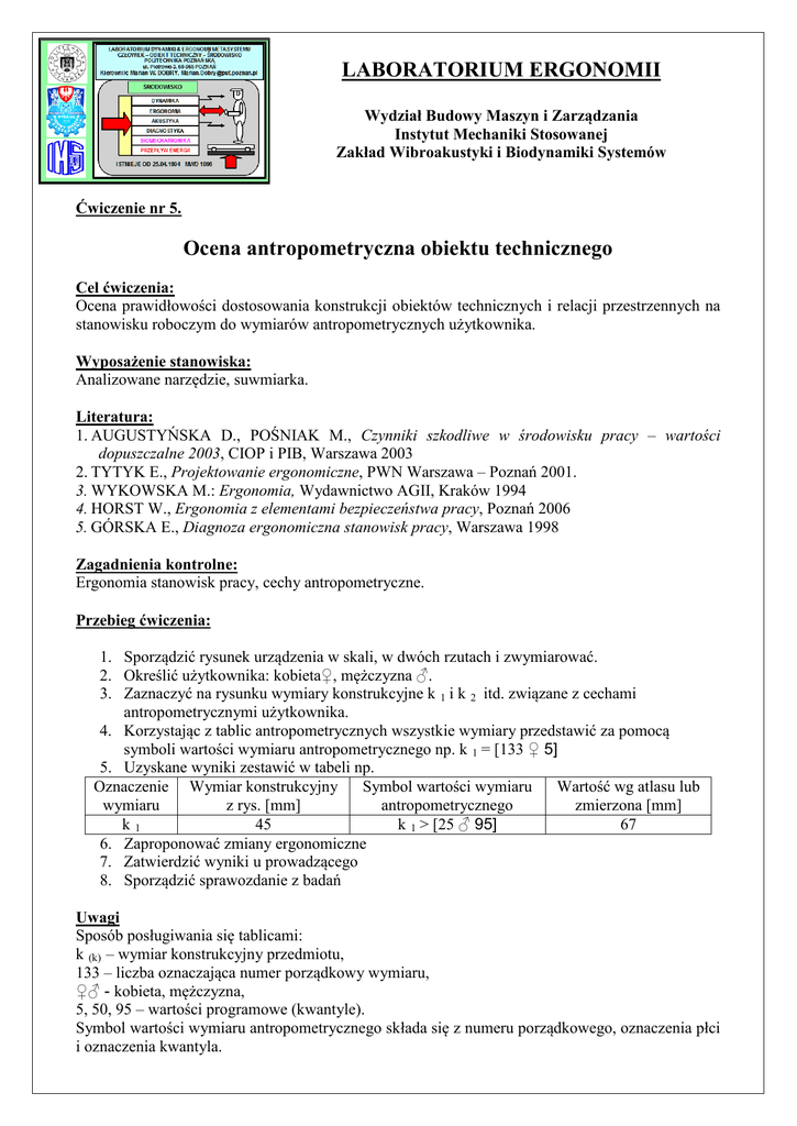 LABORATORIUM ERGONOMII Wydział Budowy Maszyn i Zarządzania Instytut Mechaniki Stosowanej Zakład Wibroakustyki i Biodynamiki Systemów Ćwiczenie nr 5. Ocena antropometryczna obiektu technicznego Cel ćwiczenia: Ocena prawidłowości dostosowania konstrukcji obiektów technicznych i relacji przestrzennych na stanowisku roboczym do wymiarów antropometrycznych użytkownika. Wyposażenie stanowiska: Analizowane narzędzie, suwmiarka. Literatura: 1. AUGUSTYŃSKA D., POŚNIAK M., Czynniki szkodliwe w środowisku pracy – wartości dopuszczalne 2003, CIOP i PIB, Warszawa 2003 2. TYTYK E., Projektowanie ergonomiczne, PWN Warszawa – Poznań 2001. 3. WYKOWSKA M.: Ergonomia, Wydawnictwo AGII, Kraków 1994 4. HORST W., Ergonomia z elementami bezpieczeństwa pracy, Poznań 2006 5. GÓRSKA E., Diagnoza ergonomiczna stanowisk pracy, Warszawa 1998 Zagadnienia kontrolne: Ergonomia stanowisk pracy, cechy antropometryczne. Przebieg ćwiczenia: 1. Sporządzić rysunek urządzenia w skali, w dwóch rzutach i zwymiarować. 2. Określić użytkownika: kobieta♀, mężczyzna ♂. 3. Zaznaczyć na rysunku wymiary konstrukcyjne k 1 i k 2 itd. związane z cechami antropometrycznymi użytkownika. 4. Korzystając z tablic antropometrycznych wszystkie wymiary przedstawić za pomocą symboli wartości wymiaru antropometrycznego np. k 1 = [133 ♀ 5] 5. Uzyskane wyniki zestawić w tabeli np. Oznaczenie Wymiar konstrukcyjny Symbol wartości wymiaru Wartość wg atlasu lub wymiaru z rys. [mm] antropometrycznego zmierzona [mm] k1 45 67 k 1 > [25 ♂ 95] 6. Zaproponować zmiany ergonomiczne 7. Zatwierdzić wyniki u prowadzącego 8. Sporządzić sprawozdanie z badań Uwagi Sposób posługiwania się tablicami: k (k) – wymiar konstrukcyjny przedmiotu, 133 – liczba oznaczająca numer porządkowy wymiaru, ♀♂ - kobieta, mężczyzna, 5, 50, 95 – wartości programowe (kwantyle). Symbol wartości wymiaru antropometrycznego składa się z numeru porządkowego, oznaczenia płci i oznaczenia kwantyla.