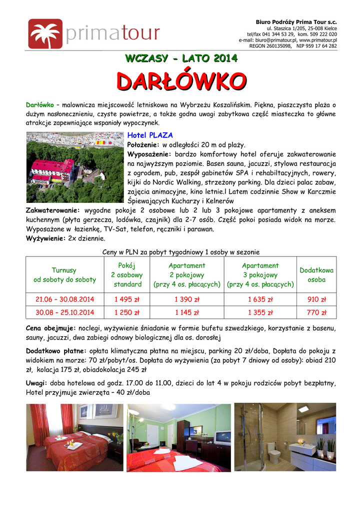 Biuro Podróży Prima Tour s.c. ul. Staszica 1/205, 25-008 Kielce tel/fax 041 344 53 29, kom. 509 222 020 e-mail: [email protected], www.primatour.pl REGON 260135098, NIP 959 17 64 282 WCZASY - LATO 2014 DARŁÓWKO Darłówko – malownicza miejscowość letniskowa na Wybrzeżu Koszalińskim. Piękna, piaszczysta plaża o dużym nasłonecznieniu, czyste powietrze, a także godna uwagi zabytkowa część miasteczka to główne atrakcje zapewniające wspaniały wypoczynek. Hotel PLAZA Położenie: w odległości 20 m od plaży. Wyposażenie: bardzo komfortowy hotel oferuje zakwaterowanie na najwyższym poziomie. Basen sauna, jacuzzi, stylowa restauracja z ogrodem, pub, zespół gabinetów SPA i rehabiltacyjnych, rowery, kijki do Nordic Walking, strzeżony parking. Dla dzieci palac zabaw, zajęcia animacyjne, kino letnie.l Latem codzinnie Show w Karczmie Śpiewających Kucharzy i Kelnerów Zakwaterowanie: wygodne pokoje 2 osobowe lub 2 lub 3 pokojowe apartamenty z aneksem kuchennym (płyta gerzecza, lodówka, czajnik) dla 2-7 osób. Część pokoi posiada widok na morze. Wyposażone w łazienkę, TV-Sat, telefon, ręczniki i parawan. Wyżywienie: 2x dziennie. Ceny w PLN za pobyt tygodniowy 1 osoby w sezonie Turnusy od soboty do soboty Pokój 2 osobowy standard Apartament Apartament Dodatkowa 2 pokojowy 3 pokojowy osoba (przy 4 os. płacących) (przy 4 os. płacących) 21.06 – 30.08.2014 1 495 zł 1 390 zł 1 635 zł 910 zł 30.08 – 25.10.2014 1 250 zł 1 145 zł 1 355 zł 770 zł Cena obejmuje: noclegi, wyżywienie śniadanie w formie bufetu szwedzkiego, korzystanie z basenu, sauny, jacuzzi, dwa zabiegi odnowy biologicznej dla os. dorosłej Dodatkowo płatne: opłata klimatyczna płatna na miejscu, parking 20 zł/doba, Dopłata do pokoju z widokiem na morze: 70 zł/pobyt/os. Dopłata do wyżywienia (za pobyt 7 dniowy od osoby): obiad 210 zł, kolacja 175 zł, obiadokolacja 245 zł Uwagi: doba hotelowa od godz. 17.00 do 11.00, dzieci do lat 4 w pokoju rodziców pobyt bezpłatny, Hotel przyjmuje zwierzęta – 40 zł/doba