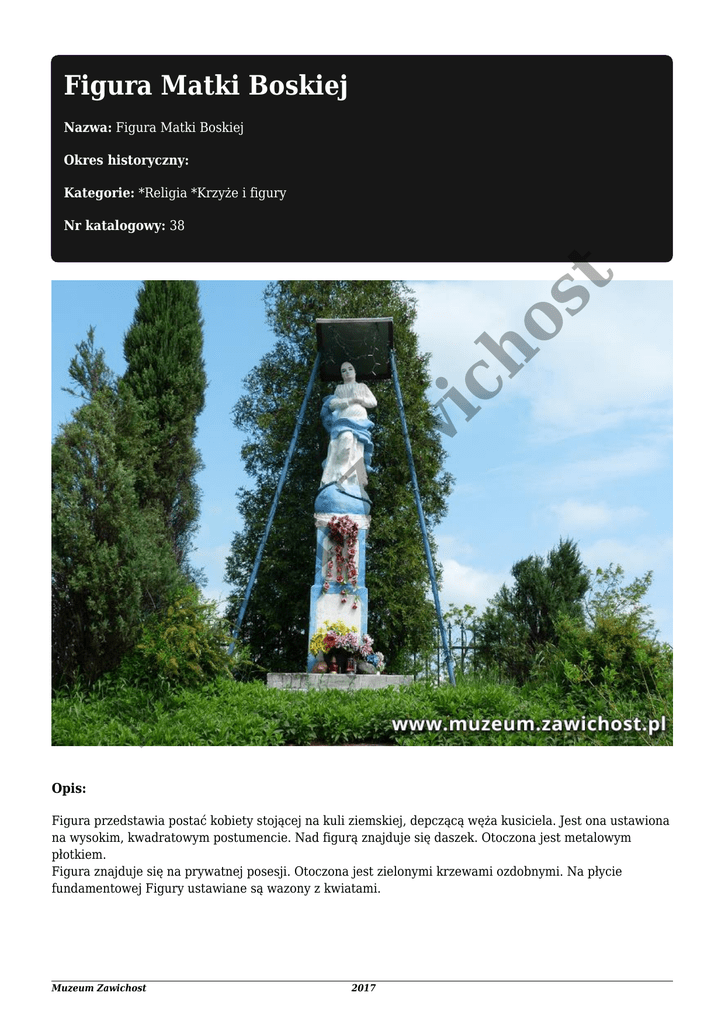 Figura Matki Boskiej Nazwa: Figura Matki Boskiej Okres historyczny: Kategorie: *Religia *Krzyże i figury M uz eu m Za w ic ho s t Nr katalogowy: 38 Opis: Figura przedstawia postać kobiety stojącej na kuli ziemskiej, depczącą węża kusiciela. Jest ona ustawiona na wysokim, kwadratowym postumencie. Nad figurą znajduje się daszek. Otoczona jest metalowym płotkiem. Figura znajduje się na prywatnej posesji. Otoczona jest zielonymi krzewami ozdobnymi. Na płycie fundamentowej Figury ustawiane są wazony z kwiatami. Muzeum Zawichost 2017