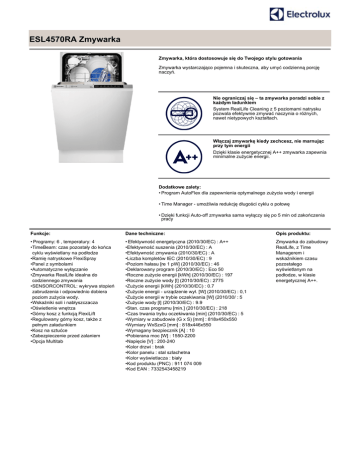 ESL4570RA Zmywarka Zmywarka, która dostosowuje się do Twojego stylu gotowania Zmywarka wystarczająco pojemna i skuteczna, aby umyć codzienną porcję naczyń. Nie ograniczaj się – ta zmywarka poradzi sobie z każdym ładunkiem System RealLife Cleaning z 5 poziomami natrysku pozwala efektywnie zmywać naczynia o różnych, nawet nietypowych kształtach. Włączaj zmywarkę kiedy zechcesz, nie marnując przy tym energii Dzięki klasie energetycznej A++ zmywarka zapewnia minimalne zużycie energii. Dodatkowe zalety: • Program AutoFlex dla zapewnienia optymalnego zużycia wody i energii • Time Manager - umożliwia redukcję długości cyklu o połowę • Dzięki funkcji Auto-off zmywarka sama wyłączy się po 5 min od zakończenia pracy Funkcje: Dane techniczne: Opis produktu: • Programy: 6 , temperatury: 4 •TimeBeam: czas pozostały do końca cyklu wyświetlany na podłodze •Ramię natryskowe FlexiSpray •Panel z symbolami •Automatyczne wyłączanie •Zmywarka RealLife idealna do codziennego zmywania •SENSORCONTROL: wykrywa stopień zabrudzenia i odpowiednio dobiera poziom zużycia wody. •Wskaźniki soli i nabłyszczacza •Oświetlenie wnętrza •Górny kosz z funkcją FlexiLift •Regulowany górny kosz, także z pełnym załadunkiem •Kosz na sztućce •Zabezpieczenie przed zalaniem •Opcja Multitab • Efektywność energetyczna (2010/30/EC) : A++ •Efektywność suszenia (2010/30/EC) : A •Efektywność zmywania (2010/30/EC) : A •Liczba kompletów IEC (2010/30/EC) : 9 •Poziom hałasu [re 1 pW] (2010/30/EC) : 46 •Deklarowany program (2010/30/EC) : Eco 50 •Roczne zużycie energii [kWh] (2010/30/EC) : 197 •Roczne zużycie wody [l] (2010/30/EC) : 2775 •Zużycie energii [kWh] (2010/30/EC) : 0.7 •Zużycie energii - urządzenie wył. [W] (2010/30/EC) : 0,1 •Zużycie energii w trybie oczekiwania [W] (2010/30/ : 5 •Zużycie wody [l] (2010/30/EC) : 9.9 •Stan. czas programu [min.] (2010/30/EC) : 218 •Czas trwania trybu oczekiwania [min] (2010/30/EC) : 5 •Wymiary w zabudowie (G x S) [mm] : 818x450x550 •Wymiary WxSzxG [mm] : 818x446x550 •Wymagany bezpiecznik [A] : 10 •Pobierana moc [W] : 1550-2200 •Napięcie [V] : 200-240 •Kolor drzwi : brak •Kolor panelu : stal szlachetna •Kolor wyświetlacza : biały •Kod produktu (PNC) : 911 074 009 •Kod EAN : 7332543458219 Zmywarka do zabudowy RealLife, z Time Managerem i wskaźnikiem czasu pozostałego wyświetlanym na podłodze, w klasie energetycznej A++. ESL4570RA Zmywarka