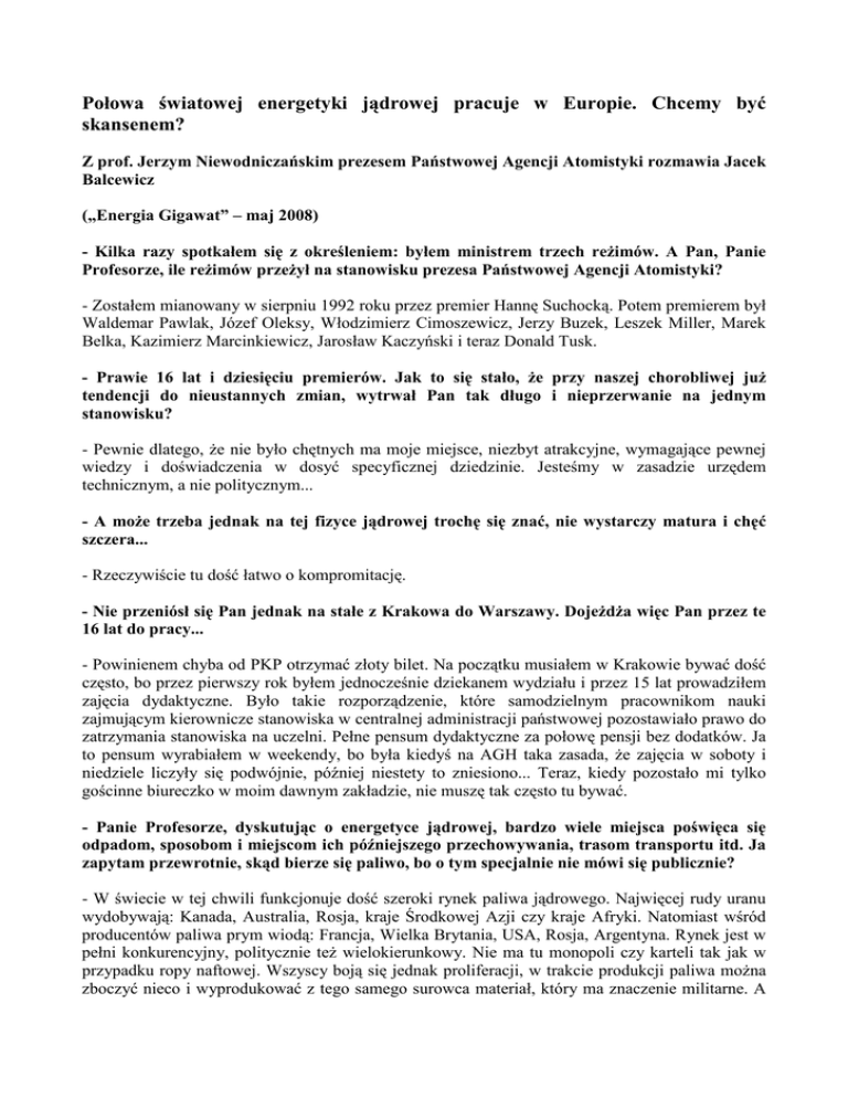 Połowa światowej energetyki jądrowej pracuje w Europie. Chcemy być skansenem? Z prof. Jerzym Niewodniczańskim prezesem Państwowej Agencji Atomistyki rozmawia Jacek Balcewicz („Energia Gigawat” – maj 2008) - Kilka razy spotkałem się z określeniem: byłem ministrem trzech reŜimów. A Pan, Panie Profesorze, ile reŜimów przeŜył na stanowisku prezesa Państwowej Agencji Atomistyki? - Zostałem mianowany w sierpniu 1992 roku przez premier Hannę Suchocką. Potem premierem był Waldemar Pawlak, Józef Oleksy, Włodzimierz Cimoszewicz, Jerzy Buzek, Leszek Miller, Marek Belka, Kazimierz Marcinkiewicz, Jarosław Kaczyński i teraz Donald Tusk. - Prawie 16 lat i dziesięciu premierów. Jak to się stało, Ŝe przy naszej chorobliwej juŜ tendencji do nieustannych zmian, wytrwał Pan tak długo i nieprzerwanie na jednym stanowisku? - Pewnie dlatego, Ŝe nie było chętnych ma moje miejsce, niezbyt atrakcyjne, wymagające pewnej wiedzy i doświadczenia w dosyć specyficznej dziedzinie. Jesteśmy w zasadzie urzędem technicznym, a nie politycznym... - A moŜe trzeba jednak na tej fizyce jądrowej trochę się znać, nie wystarczy matura i chęć szczera... - Rzeczywiście tu dość łatwo o kompromitację. - Nie przeniósł się Pan jednak na stałe z Krakowa do Warszawy. DojeŜdŜa więc Pan przez te 16 lat do pracy... - Powinienem chyba od PKP otrzymać złoty bilet. Na początku musiałem w Krakowie bywać dość często, bo przez pierwszy rok byłem jednocześnie dziekanem wydziału i przez 15 lat prowadziłem zajęcia dydaktyczne. Było takie rozporządzenie, które samodzielnym pracownikom nauki zajmującym kierownicze stanowiska w centralnej administracji państwowej pozostawiało prawo do zatrzymania stanowiska na uczelni. Pełne pensum dydaktyczne za połowę pensji bez dodatków. Ja to pensum wyrabiałem w weekendy, bo była kiedyś na AGH taka zasada, Ŝe zajęcia w soboty i niedziele liczyły się podwójnie, później niestety to zniesiono... Teraz, kiedy pozostało mi tylko gościnne biureczko w moim dawnym zakładzie, nie muszę tak często tu bywać. - Panie Profesorze, dyskutując o energetyce jądrowej, bardzo wiele miejsca poświęca się odpadom, sposobom i miejscom ich późniejszego przechowywania, trasom transportu itd. Ja zapytam przewrotnie, skąd bierze się paliwo, bo o tym specjalnie nie mówi się publicznie? - W świecie w tej chwili funkcjonuje dość szeroki rynek paliwa jądrowego. Najwięcej rudy uranu wydobywają: Kanada, Australia, Rosja, kraje Środkowej Azji czy kraje Afryki. Natomiast wśród producentów paliwa prym wiodą: Francja, Wielka Brytania, USA, Rosja, Argentyna. Rynek jest w pełni konkurencyjny, politycznie teŜ wielokierunkowy. Nie ma tu monopoli czy karteli tak jak w przypadku ropy naftowej. Wszyscy boją się jednak proliferacji, w trakcie produkcji paliwa moŜna zboczyć nieco i wyprodukować z tego samego surowca materiał, który ma znaczenie militarne. A jakikolwiek akt terrorystyczny z uŜyciem ładunku jądrowego niewielkiej nawet mocy moŜe nie tylko wywołać konflikt o znaczeniu globalnym, ale takŜe zburzyć zaufanie do całego przemysłu jądrowego. Proliferacja jest więc takim czarnym ludem, którego wszyscy się obawiają, nie tylko politycy, równieŜ energetycy jądrowi. Stąd więc tendencja by „zmonopolizować” produkcję paliwa jądrowego w ten sposób, aby producent odbierał od nabywcy takŜe wypalone paliwo jądrowe, tworząc swoisty zamknięty obieg. Niektórzy wręcz mówią obrazowo o leasingu paliwa. Takich projektowanych programów na świecie jest w tej chwili bodaj sześć. Polska w ubiegłym roku przystąpiła do amerykańskiego programu GNEP. Rosjanie chcą zorganizować „wyspę jądrową” na Syberii, gdzie będą produkować i później utylizować wypalone paliwo. My teŜ w Polsce mamy problem z paliwem jądrowym. Wprawdzie nie mamy elektrowni jądrowej, ale mamy funkcjonujące od lat pięćdziesiątych reaktory badawcze. I kraj, który ma reaktory badawcze, a nie ma elektrowni jądrowych, paradoksalnie ma większy problem z wypalonym paliwem niŜ kraj, który posiada energetykę jądrową. Bo nie ma funduszy na składowanie czy przerób tego paliwa. Przy energetyce jądrowej koszty zagospodarowania wypalonego paliwa doliczane są do kaŜdej kilowatogodziny. I stanowią ułamkowe wielkości centa. U nas powinniśmy to finansować z budŜetu nauki, który nie jest za wielki. - Na ile praca w kopalniach wydobywających rudy uranowe jest szkodliwa dla zatrudnionych tam górników? - Nie moŜe być bardziej szkodliwa niŜ w kopalniach innych surowców. Tak się steruje czasem pracy, aby dawki promieniowania nie przekraczały dopuszczalnych norm. Zresztą niejednokrotnie zdarza się, Ŝe moc dawki promieniowania w kopalniach węglowych, z uwagi na obecność radu, jest większa niŜ w kopalniach wydobywających rudy uranowe. - Pytam o to, bo mam w pamięci opowieści o ludziach pracujących w kopalni w Kowarach... - W Kowarach zatrzymano wydobycie na początku lat sześćdziesiątych, bo skończyła się ruda. Uran jest w tej chwili relatywnie tani więc eksploatacja tego, co tam jeszcze pozostało, nie bardzo się opłaca. Aczkolwiek są firmy australijskie, które deklarują chęć prowadzenia poszukiwań nowych złóŜ uranu w Karkonoszach. - I mają szansę? - Na razie poszli na Węgry i tam budują nowa kopalnię, pomimo tego Ŝe Węgrzy pozamykali swoje stare kopalnie. - Podczas niedawnej konferencji na temat czystych technologii węglowych, jaka miała miejsce w AGH w Krakowie i na Politechnice Śląskiej w Gliwicach, padło stwierdzenie, Ŝe światowe złoŜa uranu wyczerpią się za trzydzieści lat. - W przypadku złóŜ uranu jest nieco inne podejście niŜ do złóŜ ropy naftowej, gazu czy węgla. Mówi się o złoŜach uranu w cenie do... i określa się pułap cenowy. W tej chwili udokumentowanych złóŜ uranu w cenie dzisiejszej wystarczy na 85 lat. A nie są to wszystkie rozp