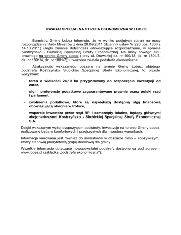 UWAGA! SPECJALNA STREFA EKONOMICZNA W ŁOBZIE Burmistrz Gminy Łobez informuje, że w wyniku podjętych starań na mocy rozporządzenia Rady Ministrów z dnia 28.09.2011 (dziennik ustaw Nr 220 poz. 1300 z 14.10.2011) uległo zmianie dotychczas obowiązujące rozporządzenie, w sprawie Kostrzyńsko - Słubickiej Specjalnej Strefy Ekonomicznej. Na mocy nowego aktu prawnego na terenie Gminy Łobez ( przy ul. Drawskiej dz. nr 190/13, dz. nr 1801/3, dz. nr 1801/4, dz. nr 1801/7)) utworzona została podstrefa ekonomiczna . Atrakcyjność wskazanego obszaru na terenie Gminy Łobez, objętego podstrefą Kostrzyńsko Słubickiej Specjalnej Strefy Ekonomicznej, to przede wszystkim: - teren o wielkości 24,19 ha przygotowany do rozpoczęcia Inwestycji od zaraz, - ulgi i preferencje podatkowe zagwarantowane prawnie przez polski rząd i parlament, - zwolnienia podatkowe, które są największą dostępną ulgą finansową obowiązującą obecnie w Polsce, - wsparcie inwestora przez rząd RP i samorządy lokalne, będący głównymi akcjonariuszami Kostrzyńsko - Słubickiej Specjalnej Strefy Ekonomicznej S.A. Dzięki wskazanym wyżej dyspozycjom podstrefy, inwestycje na terenie Gminy Łobez realizowane będą w komfortowych i przejrzystych dla inwestora warunkach. Informacja kierowana jest również do inwestorów w obszarze rolno – spożywczym, którzy stanowią priorytetową grupę docelową dla gminy. Wszelkie informacje dotyczące nowopowstałej podstrefy dostępne są pod adresem www.lobez.pl (zakładka „podstrefa ekonomiczna").