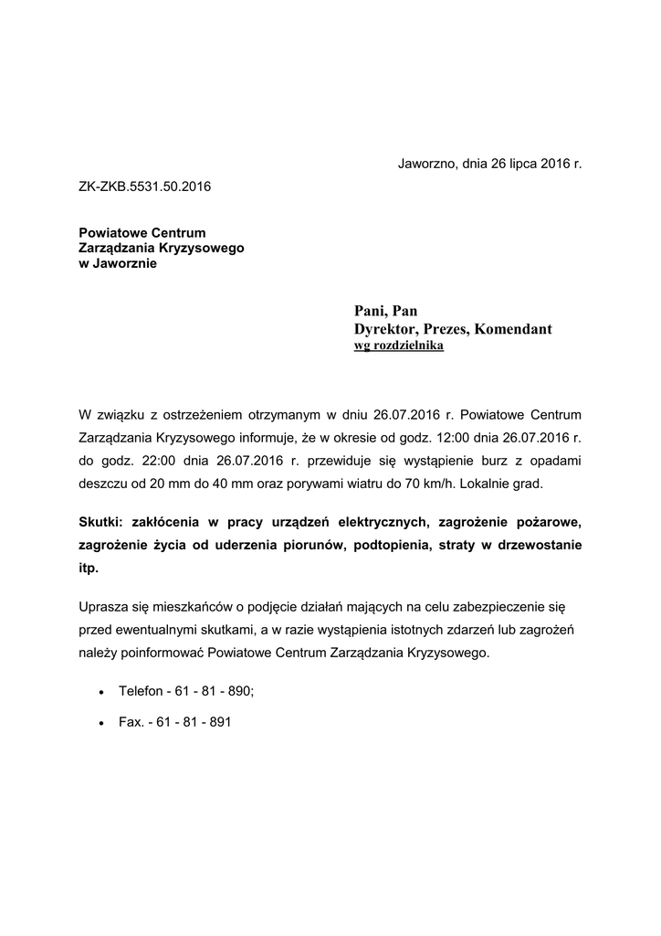 Jaworzno, dnia 26 lipca 2016 r. ZK-ZKB.5531.50.2016 Powiatowe Centrum Zarządzania Kryzysowego w Jaworznie Pani, Pan Dyrektor, Prezes, Komendant wg rozdzielnika W związku z ostrzeżeniem otrzymanym w dniu 26.07.2016 r. Powiatowe Centrum Zarządzania Kryzysowego informuje, że w okresie od godz. 12:00 dnia 26.07.2016 r. do godz. 22:00 dnia 26.07.2016 r. przewiduje się wystąpienie burz z opadami deszczu od 20 mm do 40 mm oraz porywami wiatru do 70 km/h. Lokalnie grad. Skutki: zakłócenia w pracy urządzeń elektrycznych, zagrożenie pożarowe, zagrożenie życia od uderzenia piorunów, podtopienia, straty w drzewostanie itp. Uprasza się mieszkańców o podjęcie działań mających na celu zabezpieczenie się przed ewentualnymi skutkami, a w razie wystąpienia istotnych zdarzeń lub zagrożeń należy poinformować Powiatowe Centrum Zarządzania Kryzysowego. Telefon - 61 - 81 - 890; Fax. - 61 - 81 - 891