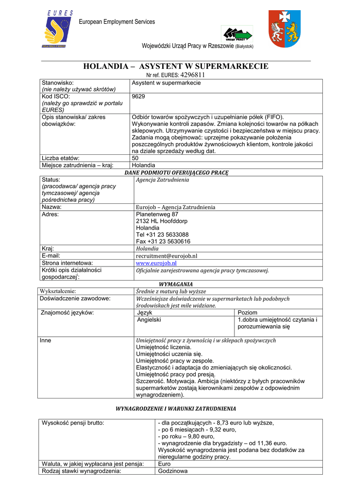 European Employment Services Wojewódzki Urząd Pracy w Rzeszowie (Białystok) HOLANDIA – ASYSTENT W SUPERMARKECIE Stanowisko: (nie należy używać skrótów) Kod ISCO: (należy go sprawdzić w portalu EURES) Opis stanowiska/ zakres obowiązków: Liczba etatów: Miejsce zatrudnienia – kraj: Status: (pracodawca/ agencja pracy tymczasowej/ agencja pośrednictwa pracy) Nazwa: Adres: Kraj: E-mail: Strona internetowa: Krótki opis działalności i gospodarczej : Wykształcenie: Doświadczenie zawodowe: Znajomość języków: Inne Nr ref. EURES: 4296811 Asystent w supermarkecie 9629 Odbiór towarów spożywczych i uzupełnianie półek (FIFO). Wykonywanie kontroli zapasów. Zmiana kolejności towarów na półkach sklepowych. Utrzymywanie czystości i bezpieczeństwa w miejscu pracy. Zadania mogą obejmować: uprzejme pokazywanie położenia poszczególnych produktów żywnościowych klientom, kontrole jakości na dziale sprzedaży według dat. 50 Holandia DANE PODMIOTU OFERUJĄCEGO PRACĘ Agencja Zatrudnienia Eurojob – Agencja Zatrudnienia Planetenweg 87 2132 HL Hoofddorp Holandia Tel +31 23 5633088 Fax +31 23 5630616 Holandia [email protected] www.eurojob.nl Oficjalnie zarejestrowana agencja pracy tymczasowej. WYMAGANIA Średnie z maturą lub wyższe Wcześniejsze doświadczenie w supermarketach lub podobnych środowiskach jest mile widziane. Język Poziom Angielski 1.dobra umiejętność czytania i porozumiewania się Umiejętność pracy z żywnością i w sklepach spożywczych Umiejętność liczenia. Umiejętności uczenia się. Umiejętność pracy w zespole. Elastyczność i adaptacja do zmieniających się okoliczności. Umiejętność pracy pod presją. Szczerość. Motywacja. Ambicja (niektórzy z byłych pracowników supermarketów zostają kierownikami zespołów z odpowiednim wynagrodzeniem). WYNAGRODZENIE I WARUNKI ZATRUDNIENIA Wysokość pensji brutto: Waluta, w jakiej wypłacana jest pensja: Rodzaj stawki wynagrodzenia: - dla początkujących - 8,73 euro lub wyższe, - po 6 miesiącach - 9,32 euro, - po roku – 9,80 euro, - wynagrodzenie dla brygadzisty – od 11,36 euro. Wysokość wynagrodzenia jest podana bez dodatków za nieregularne godziny pracy. Euro Godzinowa (godzinowa/ tygodniowa/ miesięczna/ roczna/ inna) Dodatkowe świadczenia (zakwaterowanie, wyżywienie, koszty związane ze zmianą miejsca zamieszkania, koszty podróży itp.): Rodzaj umowy: (umowa o pracę, umowa zlecenia, wolontariat, praktyka zawodowa/ staż, praca zdalna, agencja pracy tymczasowej, inne): Wymiar czasu pracy (praca na pełen etat/ część etatu): Czas trwania umowy: (nieokreślony/ określony) Liczba godzin tygodniowo: - zakwaterowanie zapewnione na koszt pracownika – 82,40 euro tygodniowo, - koszt ubezpieczenia zdrowotnego opłacanego przez pracownika – 19,72 euro tygodniowo, - transport z Polski do Holandii organizuje pracodawca – koszt transportu jest potrącany z pierwszego wynagrodzenia, - koszty wyjazdów i przyjazdów z urlopów pokrywa w całości pracownik, - kiedy pracownik kończy kontrakt – koszt powrotu do kraju pokrywa pracodawca do wysokości max. 65 euro. Umowa o pracę na czas określony Pełen etat 6 miesięcy Druga umowa na 6 miesięcy lub 1 rok Trzecia umowa na 6 miesięcy lub 1 rok. Możliwość umowy na czas nieokreślony. 32 – 38 godzin Godziny pracy są zmienne i różne w zależności od supermarketu. Wszystkie godziny pracy będą zgodne z Układem Zbiorowym Pracy dla Supermarketów (VGL lub CAO Levensmiddelenbedrijf). SPOSÓB SKŁADANIA WNIOSKU Wymagane dokumenty CV w języku polskim lub angielskim z dopiskiem „Asystent (list motywacyjny, CV itp.): w supermarkecie – Holandia” Język, w którym muszą być sporządzone Polski przedkładane dokumenty: Do kogo należy wysłać dokumenty: Do Doradcy EURES w Wojewódzkim Urzędzie Pracy (do pracodawcy/ doradcy EURES) w Białymstoku Gdzie należy wysłać dokumenty: [email protected] (adres, adres e-mail, nr faksu z kodem kraju itp.) Wojewódzki Urząd Pracy w Białymstoku, ul. Pogodna 22, p.12, tel. 085 Dane teleadresowe doradcy EURES lub 74-97-235/8 przedstawiciela pracodawcy: (nazwisko, adres, telefon, fax, e-mail itp.) WAŻNOŚĆ Data publikacji: 18.10.2011r. Zmiany i praca w dni wolne: Termin przedkładania podań o pracę / zakończenia ważności oferty: Do odwołania Uprzejmie informujemy, że skontaktujemy się wyłącznie z wybranymi kandydatami. UWAGA: 1. Umowa z zagranicznym pracodawcą zostanie zawarta zgodnie z prawem kraju zatrudnienia. Oznacza to, że wszystkie roszczenia odnośnie do warunków, które obejmuje umowa, można kierować wyłącznie do odpowiedniego sądu w kraju zatrudnienia. Publiczne służby zatrudnienia (EURES) nie mogą pośredniczyć ani reprezentować pracownika w sądzie kraju zatrudnienia w przypadku sporu z pracodawcą. 2. Publiczne służby zatrudnienia (EURES) dokładają wszelkich starań, aby zapewnić rzetelność i wiarygodność ofert pracy zgłoszonych w lokalnym urzędzie pracy. Należy wyjaśnić, że oferta pracy została zgłoszona przez stronę trzecią i EURES nie odpowiada za ewentualne rozbieżności między warunkami pracy określonymi w ofercie pracy i warunkami oferowanymi przez potencjalnego pracodawcę. 3. Publiczne służby zatrudnienia (EURES) informują, że będą zbierać, przetwarzać i przekazywać potencjalnym pracodawcom zgodnie z przepisami dotyczącymi ochrony danych osobowych wszystkie dane osobowe dostarczone przez osoby poszukujące pracy.