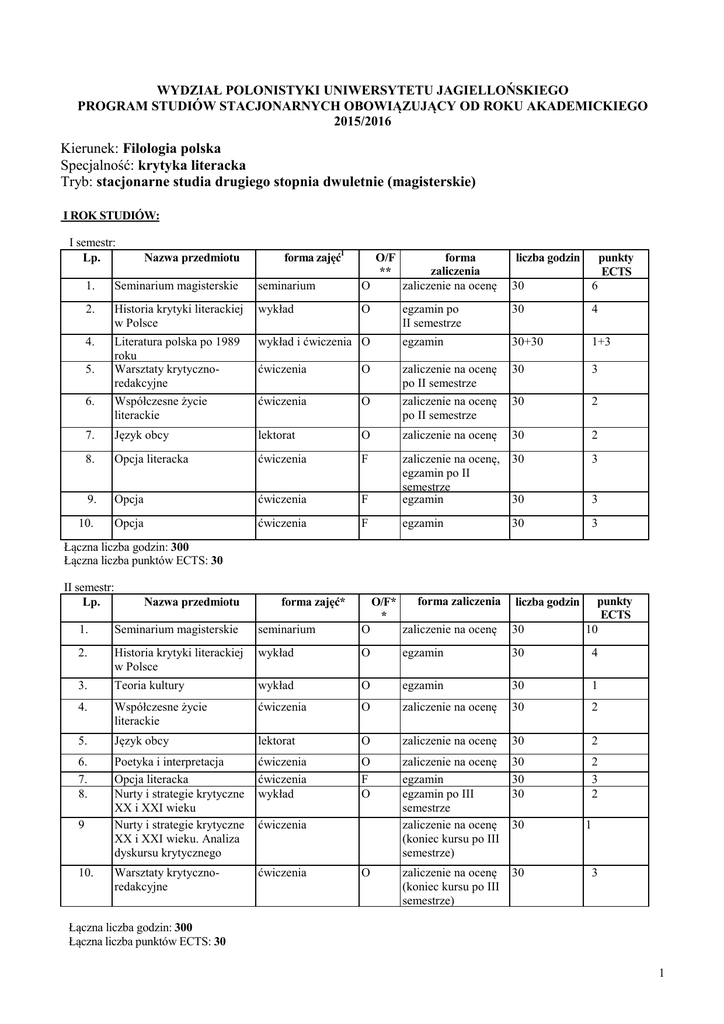 WYDZIAŁ POLONISTYKI UNIWERSYTETU JAGIELLOŃSKIEGO PROGRAM STUDIÓW STACJONARNYCH OBOWIĄZUJĄCY OD ROKU AKADEMICKIEGO 2015/2016 Kierunek: Filologia polska Specjalność: krytyka literacka Tryb: stacjonarne studia drugiego stopnia dwuletnie (magisterskie) I ROK STUDIÓW: I semestr: Lp. Nazwa przedmiotu forma zajęć1 O/F ** 1. Seminarium magisterskie seminarium O 2. Historia krytyki literackiej w Polsce wykład O 4. Literatura polska po 1989 roku Warsztaty krytycznoredakcyjne wykład i ćwiczenia O ćwiczenia 6. Współczesne życie literackie 7. forma zaliczenia zaliczenie na ocenę punkty ECTS liczba godzin 30 6 egzamin po II semestrze 30 4 egzamin 30+30 1+3 O zaliczenie na ocenę po II semestrze 30 3 ćwiczenia O zaliczenie na ocenę po II semestrze 30 2 Język obcy lektorat O zaliczenie na ocenę 30 2 8. Opcja literacka ćwiczenia F 3 9. Opcja ćwiczenia F zaliczenie na ocenę, 30 egzamin po II semestrze egzamin 30 10. Opcja ćwiczenia F egzamin 3 5. 3 30 Łączna liczba godzin: 300 Łączna liczba punktów ECTS: 30 II semestr: Lp. Nazwa przedmiotu forma zajęć* O/F* * forma zaliczenia liczba godzin punkty ECTS 10 1. Seminarium magisterskie seminarium O zaliczenie na ocenę 30 2. Historia krytyki literackiej w Polsce wykład O egzamin 30 4 3. Teoria kultury wykład O egzamin 30 1 4. Współczesne życie literackie ćwiczenia O zaliczenie na ocenę 30 2 5. Język obcy lektorat O zaliczenie na ocenę 30 2 6. 7. 8. Poetyka i interpretacja Opcja literacka Nurty i strategie krytyczne XX i XXI wieku Nurty i strategie krytyczne XX i XXI wieku. Analiza dyskursu krytycznego ćwiczenia ćwiczenia wykład O F O zaliczenie na ocenę egzamin egzamin po III semestrze zaliczenie na ocenę (koniec kursu po III semestrze) 30 30 30 2 3 2 Warsztaty krytycznoredakcyjne ćwiczenia zaliczenie na ocenę (koniec kursu po III semestrze) 30 9 10. ćwiczenia O 30 1 3 Łączna liczba godzin: 300 Łączna liczba punktów ECTS: 30 1 II ROK STUDIÓW: III semestr: Lp. Nazwa przedmiotu 1. Seminarium magisterskie 2. forma zajęć* liczba godzin Punkty ECTS O zaliczenie na ocenę; 30 egzamin magisterski po IV semestrze Nurty i strategie krytyczne wykład XX i XXI wieku Współczesna literatura ćwiczenia światowa O egzamin 30 6 O zaliczenie na ocenę 30 3 4. Nurty i strategie krytyczne ćwiczenia XX i XXI wieku. Analiza dyskursu krytycznego O zaliczenie na ocenę 30 3 5. Warsztaty krytycznoredakcyjne ćwiczenia O zaliczenie na ocenę (ocena końcowa) 30 6. Opcja Ćwiczenia F egzamin 30 3 7. Opcja ćwiczenia F egzamin 30 3 3. seminarium forma zaliczenia O/F* * 12 3 Łączna liczba godzin: 210 Łączna liczba punktów ECTS: 33 IV semestr: Lp. Nazwa przedmiotu 30 punkty ECTS 16 30 3 zaliczenie na ocenę 30 2 F egzamin 30 3 ćwiczenia F egzamin 30 3 praktyki O zaliczenie 20 2 forma zajęć* O/F** 1. Seminarium magisterskie seminarium O 2. Opcja literacka ćwiczenia F 3. Retoryka mediów ćwiczenia O 4. Opcja literacka ćwiczenia 5. Kurs w języku obcym 6. Praktyki forma zaliczenia egzamin magisterski egzamin liczba godzin Łączna liczba godzin: 170 Łączna liczba punktów ECTS: 29 OPCJE : Na I roku i na II roku do zrealizowania po 120 godzin, w tym jedna opcja z „wybranych zagadnień krytyki” do zrealizowania na każdym roku: 1. 2. 3. 4. Wybrane zagadnienia krytyki muzycznej (30 godzin) Wybrane zagadnienia krytyki teatralnej (30 godzin) Wybrane zagadnienia krytyki filmowej (30 godzin) Wybrane zagadnienia krytyki plastycznej (30 godzin) PRAKTYKA W LOKALNYCH INSTYTUCJACH KULTURY, WYDAWNICTWACH, REDAKCJACH CZASOPISM (20 godzin do zrealizowania do końca II roku studiów) 1 wykład/ćwiczenia/laboratoria/seminarium/inne ** „O” – przedmiot obowiązkowy do zaliczenia danego semestru/roku studiów, „F” – przedmiot fakultatywny (do wyboru). 2