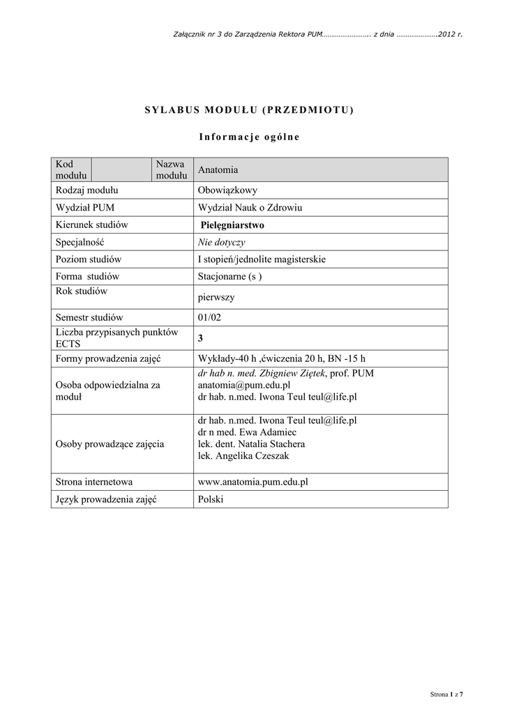 Załącznik nr 3 do Zarządzenia Rektora PUM…………………….. z dnia ………………….2012 r. SYLABUS MODUŁU (PRZEDMIOTU) Informacje ogólne Kod modułu Rodzaj modułu Nazwa modułu Anatomia Obowiązkowy Wydział PUM Wydział Nauk o Zdrowiu Kierunek studiów Pielęgniarstwo Specjalność Nie dotyczy Poziom studiów I stopień/jednolite magisterskie Forma studiów Rok studiów Stacjonarne (s ) Semestr studiów Liczba przypisanych punktów ECTS Formy prowadzenia zajęć Osoba odpowiedzialna za moduł Osoby prowadzące zajęcia pierwszy 01/02 3 Wykłady-40 h ,ćwiczenia 20 h, BN -15 h dr hab n. med. Zbigniew Ziętek, prof. PUM [email protected] dr hab. n.med. Iwona Teul [email protected] dr hab. n.med. Iwona Teul [email protected] dr n med. Ewa Adamiec lek. dent. Natalia Stachera lek. Angelika Czeszak Strona internetowa www.anatomia.pum.edu.pl Język prowadzenia zajęć Polski Strona 1 z 7 Załącznik nr 3 do Zarządzenia Rektora PUM…………………….. z dnia ………………….2012 r. Informacje szczegółowe Cele modułu Wiedzy Wymagania wstępne w zakresie Umiejętności Celem przedmiotu jest zaznajomienie studenta z podstawowymi pojęciami z zakresu anatomii człowieka Wyjaśnienie podstawowych pojęć z zakresu anatomii topograficznej. Poznanie mianownictwa anatomicznego w języku polskim Poznanie budowy, funkcji i topografii poszczególnych okolic ciała, układów i narządów z uwzględnieniem wieku ontogenetycznego. Poznanie podstawowych pojęć anatomii klinicznej przydatnych do nauki anatomii prawidłowej człowieka Zastosowanie pozyskanej wiedzy dotyczącej budowy, topografii, czynności układów i narządów dla potrzeb poszczególnych dyscyplin klinicznych Znajomość podstawowych wiadomości z zakresu anatomii budowy człowieka. Zna mianownictwo anatomiczne w języku polskim. Opisze budowę człowieka z uwzględnieniem poszczególnych układów i narządów, ich topografię. Wyróżni i opisze wybrane okolice ciała. Zna i wyjaśni zależność pomiędzy budową, umiejscowieniem a funkcją układów i narządów. Posiada wiedzę z zakresu podstawowych pojęć mechanizmów kontrolnych, integracyjnych i regulacyjnych poznanych układów i narządów na homeostazę człowieka. Zna fazy etapów rozwojowych człowieka. Wyjaśni ich główne cechy charakterystyczne związane z budową układów, narządów dla potrzeb dyscyplin klinicznych. Posiada wiedzę anatomiczną i wskaże położenie topograficzne wszystkich układów w budowie człowieka oraz przynależnych do nich narządów. Potrafi omówić ich budowę i powiązać z ich funkcją. Rozpozna budowę anatomiczną, wskaże poszczególne cechy narządów i potrafi je wskazać na preparacie. Rozpoznaje główne naczynia krwionośne i nerwy, ich przebieg, obszar ich zaopatrzenia. Pokazuje miejsca badania tętna na naczyniach i potrafi omówić objawy ich uszkodzeń. Umie określić miejsca uszkodzeń neurologicznych i ich objawy. Potrafi wyjaśnić anatomiczne podstawy badania przedmiotowego człowieka Potrafi wykorzystać nabyte wiadomości z zakresu anatomii prawidłowej, topograficznej i klinicznej, jako bazę do Strona 2 z 7 Załącznik nr 3 do Zarządzenia Rektora PUM…………………….. z dnia ………………….2012 r. zdobywania wiedzy z przedmiotów klinicznych. Posługuje się mianownictwem anatomicznym. Sposoby i kryteria oceniania. Kolokwium ustne: wiedza (50%) i umiejętności (50%). Kompetencji społecznych Wykazuje szacunek do ciała ludzkiego podczas zajęć prosektoryjnych w odniesieniu do szczątków kostnych i zwłok ludzkich. Cechuje się właściwą postawą wobec nauczycieli akademickich, wykładowców oraz społeczności studenckiej. Kształtuje umiejętność współpracy w grupie studenckiej. Wykazuje postawy aktywnego zaangażowania w zdobywaniu wiedzy i samokształceniu. Ma świadomość odpowiedzialności akademickiej i dąży do kształtowania świadomości zawodowej. Opis efektów kształcenia dla modułu (przedmiotu) numer efektu kształcenia Student, który zaliczył moduł (przedmiot) wie/umie/potrafi: SYMBOL (odniesienie do) EKK Sposób weryfikacji efektów kształcenia (forma zaliczeń) W01 Zna mianownictwo anatomiczne, histologiczne K_W01 i embriologiczne w języku polskim test W02 Opisze budowę organizmu człowieka z uwzględnieniem poszczególnych układów anatomicznych, narządów oraz topografii wybranych okolic ciała K_W01 test W03 opisuje stosunki i korelacje topograficzne między poszczególnymi narządami K_W03 test W04 Wnioskuje o relacjach między strukturami anatomicznymi na podstawie przyżyciowych badań diagnostycznych, w szczególności z zakresu radiologii (zdjęcia przeglądowe, badania z użyciem środków kontrastowych, tomografia komputerowa oraz magnetyczny rezonans jądrowy) K_W18 test U01 Posługuje się w mowie i piśmie mianownictwem anatomicznym, K_W01 test Strona 3 z 7 Załącznik nr 3 do Zarządzenia Rektora PUM…………………….. z dnia ………………….2012 r. U02 U03 histologicznym oraz embriologicznym Potrafi powiązać budowę narządów z ich funkcją K_W03 Potrafi wykorzystać zdobyte wiadomości z zakresu anatomii prawidłowej i klinicznej oraz topograficznej, jako bazę do nauki przedmiotów klinicznych M2_U15 test test Rozumie potrzebę uczenia się i ciągłego pogłębiania oraz aktualizowania swojej wiedzy M2_K01 przez całe życie, potrafi inspirować i organizować proces uczenia się innych osób Potrafi dbać o bezpieczeństwo własne, K02 M2_K07 otoczenia i współpracowników Macierz efektów kształcenia dla modułu (przedmiotu) w odniesieniu do form zajęć K01 W01 W02 Symbol modułu lub Student, który zaliczył moduł (przedmiot) wie/umie/potrafi: Zna mianownictwo anatomiczne, histologiczne i embriologiczne w języku polskim X Zna budowę ciała ludzkiego w ujęciu topograficznym (kończyna górna i dolna, klatka piersiowa, brzuch, miednica, grzbiet, szyja, głowa) oraz czynnościowym (układ 