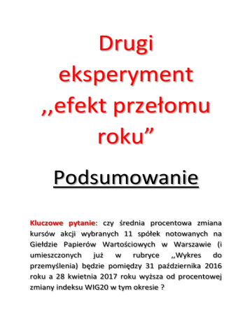 Drugi eksperyment ,,efekt przełomu roku” Podsumowanie Kluczowe pytanie: czy średnia procentowa zmiana kursów akcji wybranych 11 spółek notowanych na Giełdzie Papierów Wartościowych w Warszawie (i umieszczonych już w rubryce ,,Wykres do przemyślenia) będzie pomiędzy 31 października 2016 roku a 28 kwietnia 2017 roku wyższa od procentowej zmiany indeksu WIG20 w tym okresie ? Sezonowośd na polskim rynku akcji w przypadku indeksu WIG20 Na rynku akcji w wielu krajach świata mamy do czynienia ze zjawiskiem sezonowości. Jednym z jej przejawów jest to, że zachowanie kursów akcji spółek jest o wiele lepsze w okresie pomiędzy koocem października roku T a koocem kwietnia roku T+1, niż pomiędzy koocem kwietnia roku T a koocem października roku T. Jednym z najważniejszych indeksów opisujących sytuację na polskim rynku akcji jest indeks WIG20. Jest to indeks giełdowy 20 największych spółek akcyjnych notowanych na warszawskiej Giełdzie Papierów Wartościowych. W poniższej tabeli przedstawiłem zachowanie indeksu WIG20 obejmującego 20 dużych spółek, których akcje notowane są na Giełdzie Papierów Wartościowym w Warszawie pomiędzy koocem kwietnia roku T a koocem października roku T w poszczególnych latach okresu 1994-2016. Tabela: Procentowa zmiana indeksu WIG20 pomiędzy koocem kwietnia a koocem października w poszczególnych latach okresu 1994-2016 Okres Od kooca kwietnia do kooca października 1994 roku Od kooca kwietnia do kooca października 1995 roku Od kooca kwietnia do kooca października 1996 roku Od kooca kwietnia do kooca października 1997 roku Od kooca kwietnia do kooca października 1998 roku Od kooca kwietnia do kooca października 1999 roku Od kooca kwietnia do kooca października 2000 roku Od kooca kwietnia do kooca października 2001 roku Od kooca kwietnia do kooca października 2002 roku Od kooca kwietnia do kooca października 2003 roku Od kooca kwietnia do kooca października 2004 roku Od kooca kwietnia do kooca października 2005 roku Od kooca kwietnia do kooca października 2006 roku Od kooca kwietnia do kooca października 2007 roku Od kooca kwietnia do kooca października 2008 roku Od kooca kwietnia do kooca października 2009 roku Od kooca kwietnia do kooca października 2010 roku Od kooca kwietnia do kooca października 2011 roku Od kooca kwietnia do kooca października 2012 roku Od kooca kwietnia do kooca października 2013 roku Od kooca kwietnia do kooca października 2014 roku Od kooca kwietnia do kooca października 2015 roku Od kooca kwietnia do kooca października 2016 roku Zmiana indeksu WIG20 w % Średnio -3,4 2 -30,3 -6,5 6,4 -5,2 -34,7 -3,4 -23,2 -14,2 -10,7 42,3 3,5 25,8 -2,7 8,0 -37,5 26,5 4,1 -18,6 3,4 9,0 1,0 -18,1 -4,2 W kolejnej tabeli przedstawiłem zachowanie indeksu WIG20 obejmującego 20 dużych spółek, których akcje notowane są na Giełdzie Papierów Wartościowym w Warszawie pomiędzy koocem października roku T a koocem kwietnia roku T+1 w poszczególnych latach okresu 1994-2016. Tabela: Procentowa zmiana indeksu WIG20 pomiędzy koocem października danego roku o koocem kwietnia roku następnego w okresie 1994-2016 Okres Od kooca października 1994 roku do kooca kwietnia 1995 roku Od kooca października 1995 roku do kooca kwietnia 1996 roku Od kooca października 1996 roku do kooca kwietnia 1997 roku Od kooca października 1997 roku do kooca kwietnia 1998 roku Od kooca października 1998 roku do kooca kwietnia 1999 roku Od kooca października 1999 roku do kooca kwietnia 2000 roku Od kooca października 2000 roku do kooca kwietnia 2001 roku Od kooca października 2001 roku do kooca kwietnia 2002 roku Od kooca października 2002 roku do kooca kwietnia 2003 roku Od kooca października 2003 roku do kooca kwietnia 2004 roku Od kooca października 2004 roku do kooca kwietnia 2005 roku Od kooca października 2005 roku do kooca kwietnia 2006 roku Od kooca października 2006 roku do kooca kwietnia 2007 roku Od kooca października 2007 roku do kooca kwietnia 2008 roku Od kooca października 2008 roku do kooca kwietnia 2009 roku Od kooca października 2009 roku do kooca kwietnia 2010 roku Od kooca października 2010 roku do kooca kwietnia 2011 roku Od kooca października 2011 roku do kooca kwietnia 2012 roku Od kooca października 2012 roku do kooca kwietnia 2013 roku Od kooca października 2013 roku do kooca kwietnia 2014 roku Od kooca października 2014 roku do kooca kwietnia 2015 roku Od kooca października 2015 roku do kooca kwietnia 2016 roku Zmiana indeksu WIG20 w % Średnio 9,8 11,7 62,9 17,8 21,4 20,7 43,0 -8,1 6,9 -5,8 11,1 2,2 36,5 15,6 -24,6 -1,5 12,0 9,9 -5,5 0,1 -3,6 2,1 -7,9 Z pierwszej tabeli wynika, że okres pomiędzy koocem kwietnia a koocem października 2016 roku był dla posiadaczy polskich akcji największych spółek slaby. WIG20 spadł o 4,2 %. Ze statystycznego punktu widzenia dla posiadaczy polskich akcji największych spółek teraz rozpoczyna się okres lepszy. Po co przeprowadzam eksperymenty ? Prowadząc stronę internetową http://analizy-rynkowe.pl/ przeprowadzam rożne eksperymenty. Może powstad pytanie: ,,po co właściwie przeprowadzam te eksperymenty ? mówiąc wprost, aby skonfrontowad teorię z praktyką. 3 Na podstawie pewnej zdobytej wiedzy (w tym tej z literatury) stawiam pewną hipotezę, która sprowadza się mówiąc ogólnie do tego, że stawiam pewną prognozę typu ,,przewiduję, że średnia procentowa zmiana kursów akcji spółek z danej grupy (stworzonej na podstawie wiedzy teoretycznej) powinna byd wyższa niż pewien punkt odniesienia (na przykład procentowa zmiana indeksu WIG20) w określonym okresie”. Potem monitoruje przebieg eksperymentu, publikuję sprawozdania z jego przebiegu. Dzięki temu (niejako na oczach moich Czytelników) poddaje się pewnej weryfikacji jako analityk. Czytelnicy mogą się przekonad czy postawiona na początku eksperymentu hipoteza sprawdziła się, czy też nie…Byd może dzięki temu zachęcę inne osoby do przeprowadzania 