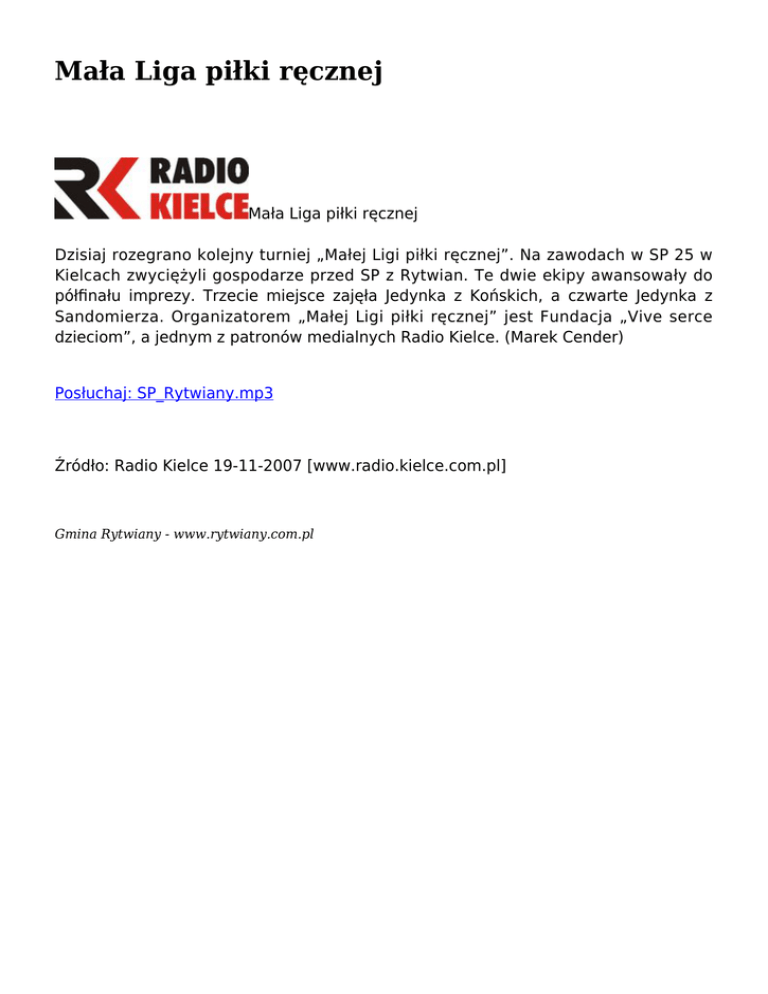 Mała Liga piłki ręcznej Mała Liga piłki ręcznej Dzisiaj rozegrano kolejny turniej „Małej Ligi piłki ręcznej”. Na zawodach w SP 25 w Kielcach zwyciężyli gospodarze przed SP z Rytwian. Te dwie ekipy awansowały do półfinału imprezy. Trzecie miejsce zajęła Jedynka z Końskich, a czwarte Jedynka z Sandomierza. Organizatorem „Małej Ligi piłki ręcznej” jest Fundacja „Vive serce dzieciom”, a jednym z patronów medialnych Radio Kielce. (Marek Cender) Posłuchaj: SP_Rytwiany.mp3 Źródło: Radio Kielce 19-11-2007 [www.radio.kielce.com.pl] Gmina Rytwiany - www.rytwiany.com.pl