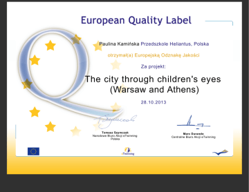 Paulina Kamińska Przedszkole Heliantus, Polska otrzymał(a) Europejską Odznakę Jakości Za projekt: The city through children's eyes (Warsaw and Athens) 28.10.2013 Tomasz Szymczak Narodowe Biuro Akcji eTwinning Polska Marc Durando Centralne Biuro Akcji eTwinning