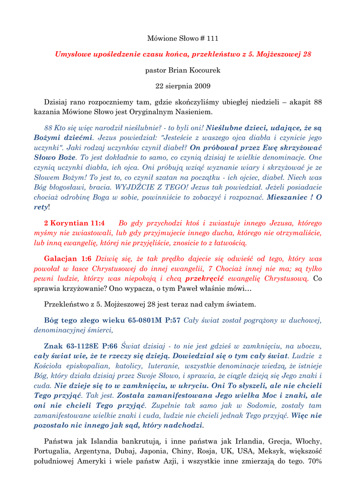 Mówione Słowo # 111 Umysłowe upośledzenie czasu końca, przekleństwo z 5. Mojżeszowej 28 pastor Brian Kocourek 22 sierpnia 2009 Dzisiaj rano rozpoczniemy tam, gdzie skończyliśmy ubiegłej niedzieli – akapit 88 kazania Mówione Słowo jest Oryginalnym Nasieniem. 88 Kto się więc narodził nieślubnie? - to byli oni! Nieślubne dzieci, udające, że są Bożymi dziećmi. Jezus powiedział: "Jesteście z waszego ojca diabła i czynicie jego uczynki". Jaki rodzaj uczynków czynił diabeł? On próbował przez Ewę skrzyżować Słowo Boże. To jest dokładnie to samo, co czynią dzisiaj te wielkie denominacje. One czynią uczynki diabła, ich ojca. Oni próbują wziąć wyznanie wiary i skrzyżować je ze Słowem Bożym! To jest to, co czynił szatan na początku - ich ojciec, diabeł. Niech was Bóg błogosławi, bracia. WYJDŹCIE Z TEGO! Jezus tak powiedział. Jeżeli posiadacie chociaż odrobinę Boga w sobie, powinniście to zobaczyć i rozpoznać. Mieszaniec ! O rety! 2 Koryntian 11:4 Bo gdy przychodzi ktoś i zwiastuje innego Jezusa, którego myśmy nie zwiastowali, lub gdy przyjmujecie innego ducha, którego nie otrzymaliście, lub inną ewangelię, której nie przyjęliście, znosicie to z łatwością. Galacjan 1:6 Dziwię się, że tak prędko dajecie się odwieść od tego, który was powołał w łasce Chrystusowej do innej ewangelii, 7 Chociaż innej nie ma; są tylko pewni ludzie, którzy was niepokoją i chcą przekręcić ewangelię Chrystusową. Co sprawia krzyżowanie? Ono wypacza, o tym Paweł właśnie mówi… Przekleństwo z 5. Mojżeszowej 28 jest teraz nad całym światem. Bóg tego złego wieku 65-0801M P:57 Cały świat został pogrążony w duchowej, denominacyjnej śmierci, Znak 63-1128E P:66 Świat dzisiaj - to nie jest gdzieś w zamknięciu, na uboczu, cały świat wie, że te rzeczy się dzieją. Dowiedział się o tym cały świat. Ludzie z Kościoła episkopalian, katolicy, luteranie, wszystkie denominacje wiedzą, że istnieje Bóg, który działa dzisiaj przez Swoje Słowo, i sprawia, że ciągle dzieją się Jego znaki i cuda. Nie dzieje się to w zamknięciu, w ukryciu. Oni To słyszeli, ale nie chcieli Tego przyjąć. Tak jest. Została zamanifestowana Jego wielka Moc i znaki, ale oni nie chcieli Tego przyjąć. Zupełnie tak samo jak w Sodomie, zostały tam zamanifestowane wielkie znaki i cuda, ludzie nie chcieli jednak Tego przyjąć. Więc nie pozostało nic innego jak sąd, który nadchodzi. Państwa jak Islandia bankrutują, i inne państwa jak Irlandia, Grecja, Włochy, Portugalia, Argentyna, Dubaj, Japonia, Chiny, Rosja, UK, USA, Meksyk, większość południowej Ameryki i wiele państw Azji, i wszystkie inne zmierzają do tego. 70% walut, które są wykorzystywane na świecie, to amerykański dolar, a on nie będzie niczego warty, już za niedługo. Obecnie ma wartość 4% z tego, co był wart w 1933 r. A w krótkim czasie utraci dalszych 90% wartości. A kiedy to się stanie, cały świat zbankrutuje, nie mogąc zapłacić za to, co dłuży? A dlaczego tak jest? Oni wszyscy odrzucili Boży Głos. 5 Mojżeszowa 28:12 Otworzy Pan przed tobą swój skarbiec dobra, niebiosa, aby dawać deszcz na twoją ziemię w czasie właściwym i aby błogosławić wszelką pracę twoich rąk tak, że będziesz mógł pożyczać wielu narodom, ale ty sam nie będziesz pożyczał. NIV 12 PAN otworzy niebiosa, magazyn jego hojności, pośle deszcz na twój kraj i pobłogosławi pracę twoich rąk. I będziesz pożyczał wielu narodom, ale sam nie będziesz pożyczał od nikogo. Poselstwo 12 Bóg otworzy drzwi sklepienia niebieskiego i ześle deszcz na twój kraj zgodnie z planem i pobłogosławi pracę, którą będziesz wykonywał. I będziesz pożyczał wielu narodom, a sam nie będziesz musiał mieć długu. Bóg uczyni cię głową, nie ogonem; zawsze będziesz zwycięzcą, nigdy porażonym, kiedy będziesz posłusznie słuchać i pilnie dotrzymywać przykazań Boga, twego Boga, które przykazuję wam dzisiaj. Nie zbaczaj ani cala na prawo albo na lewo od słów, które wam nakazuję dzisiaj przez odchodzenie i czczenie innych bogów. 5 Mojżeszowa 15:6 Gdyż Pan, Bóg twój, błogosławić ci będzie, jak ci obiecał, abyś wielu ludom pożyczał w zastaw, ale ty sam nie będziesz się zapożyczał i dawał zastawu. Będziesz panował nad wielu ludami, ale one nie będą nad tobą panować, NIV 6 Bo Pan, twój Bóg będzie błogosławić cię, jak obiecał, i będziesz pożyczał wielu narodom, ale sam nie będziesz zapożyczał; i będziesz panować nad wieloma narodami, ale oni nie będą panować nad tobą. Poszerzona Biblia (AMP) 6 Bo Pan, twój Bóg błogosławi cię, jak ci obiecał; i ty będziesz pożyczał wielu narodom, lecz nie będziesz pożyczał od nikogo, i będziesz sprawował władzę nad wielu narodami, a nikt nie będzie władnął nad tobą. Poselstwo 4-6 Nie może być biednych wśród was, ponieważ Bóg będzie błogosławić was w kraju, który Bóg, wasz Bóg daje wam jako dziedzictwo, waszą własną ziemię. Lecz jeśli tylko będziecie słuchać Głosu Boga, waszego Boga, pilnie dotrzymując każdego przykazania, które dziś wam daję. O tak – Bóg, wasz Bóg będzie błogosławić was, tak jak przyobiecał. Będziecie pożyczać wielu narodom, ale nie będziecie wypożyczać od nikogo; będziecie panować nad wielu narodami, ale nikt nie będzie panował nad wami. Przypowieści Salomona 22:7 Bogacz panuje nad nędzarzem, lecz dłużnik jest sługą wierzyciela. NIV 7 Bogaty panuje nad biednym, ale dłużnik jest sługą wierzyciela. Poszerzona Biblia (AMP) 7 Bogacz panuje nad nędzarzem, a dłużnik jest sługą wierzyciela. Poselstwo (MSG) 7 Bogacz panuje nad nędzarzem, więc nie zapożyczaj, żeby nie panowali nad tobą. 2 Piotra 2:19 Obiecując im wolność, chociaż sami są niewolnikami zguby; czemu bowiem ktoś ulega, tego niewolnikiem się staje. NIV 19 Obiecują wolność, kiedy sami są niewolnikami deprawac