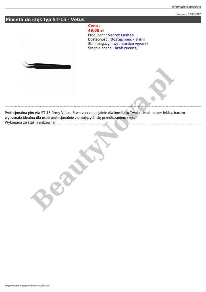 Informacje o produkcie Utworzono 07-03-2017 Pinceta do rzęs typ ST-15 - Vetus Cena : 49,00 zł a. pl Producent : Secret Lashes Dostępność : Dostępność - 3 dni Stan magazynowy : bardzo wysoki Średnia ocena : brak recenzji B ea ut yN ov Profesjonalna pinceta ST-15 firmy Vetus. Stworzona specjalnie dla komfortu Twojej dłoni - super lekka, bardzo wytrzmała idealna dla osób profesjonalnie zajmujących się przedłużaniem rzęs. Wykonana ze stali nierdzewnej. Wygenerowano w programie www.oscGold.com