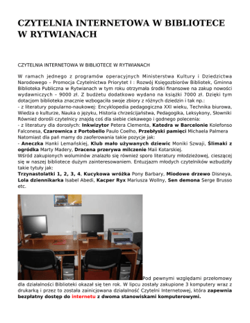 CZYTELNIA INTERNETOWA W BIBLIOTECE W RYTWIANACH CZYTELNIA INTERNETOWA W BIBLIOTECE W RYTWIANACH W ramach jednego z programów operacyjnych Ministerstwa Kultury i Dziedzictwa Narodowego – Promocja Czytelnictwa Priorytet I : Rozwój Księgozbiorów Bibliotek, Gminna Biblioteka Publiczna w Rytwianach w tym roku otrzymała środki finansowe na zakup nowości wydawniczych – 9000 zł. Z budżetu dodatkowo wydano na książki 7000 zł. Dzięki tym dotacjom biblioteka znacznie wzbogaciła swoje zbiory z różnych dziedzin i tak np.: - z literatury popularno-naukowej: Encyklopedia pedagogiczna XXI wieku, Technika biurowa, Wiedza o kulturze, Nauka o języku, Historia chrześcijaństwa, Pedagogika, Leksykony, Słowniki Również dorośli czytelnicy znajdą coś dla siebie ciekawego i godnego polecenia: - z literatury dla dorosłych: Inkwizytor Petera Clementa, Katedra w Barcelonie Kolefonso Falconesa, Czarownica z Portobello Paulo Coelho, Przebłyski pamięci Michaela Palmera Natomiast dla pań mamy do zaoferowania takie pozycje jak: - Aneczka Hanki Lemańskiej, Klub mało używanych dziewic Moniki Szwaji, Ślimaki z ogródka Marty Madery, Dracena przerywa milczenie Maii Kotarskiej. Wśród zakupionych woluminów znalazło się również sporo literatury młodzieżowej, cieszącej się w naszej bibliotece dużym zainteresowaniem. Entuzjazm młodych czytelników wzbudziły takie tytuły jak: Trzynastolatki 1, 2, 3, 4, Kucykowa wróżka Pony Barbary, Miodowe drzewo Disneya, Lola dziennikarka Isabel Abedi, Kacper Ryx Mariusza Wollny, Sen demona Serge Brusso etc. Pod pewnymi względami przełomowy dla działalności Biblioteki okazał się ten rok. W lipcu zostały zakupione 3 komputery wraz z drukarką i przez to została zainicjowana działalność Czytelni Internetowej, która zapewnia bezpłatny dostęp do internetu z dwoma stanowiskami komputerowymi. Biblioteka ma do zaoferowania także czasopisma, które są również udostępniane czytelnikom: Echo Dnia, Dziennik, Newsweek, Wprost, Cogito, Victor, Pani Domu, Twój styl, Dziecko, Biblioteka w szkole, Bibliotekarz, Poradnik bibliotekarza, Przyjaciólka, Poradnik Domowy. Biblioteki dawno już złamały stereotyp wiejskiej biblioteczki, gdzie na półkach królują zakurzone i przestarzałe książki, a między regałami przemyka szara bibliotekarka z koczkiem. Wyzwaniem dla współczesnych bibliotek jest zaspokojenie potrzeb informacyjnych ich użytkowników, marzeniem biblioteki jest stworzenie katalogu centralnego zarówno książek jak i czasopism, chcielibyśmy stworzyć „bibliotekę, która ma wszystko”. Zapraszamy do biblioteki a także do czytelni internetowej, która jest czynna: Poniedziałek 9.00-17.00 Wtorek 9.00-17.00 Środa 7.30-15.30 Czwartek 9.00-17.00 Piątek 9.00-17.00 Dorota Gwizdowska Gmina Rytwiany - www.rytwiany.com.pl