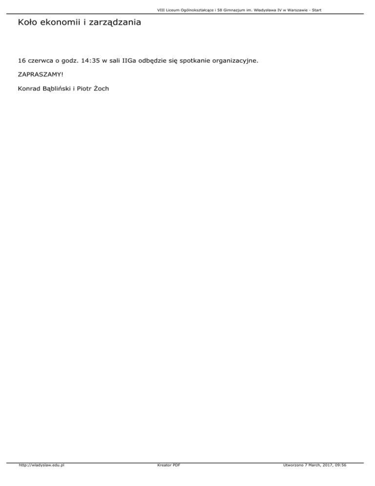 VIII Liceum Ogólnokształcące i 58 Gimnazjum im. Władysława IV w Warszawie - Start Koło ekonomii i zarządzania 16 czerwca o godz. 14:35 w sali IIGa odbędzie się spotkanie organizacyjne. ZAPRASZAMY! Konrad Bąbliński i Piotr Żoch http://wladyslaw.edu.pl Kreator PDF Utworzono 7 March, 2017, 09:56