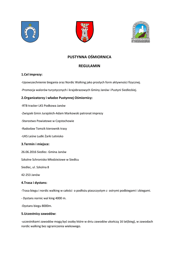 PUSTYNNA OŚMIORNICA REGULAMIN 1.Cel imprezy: -Upowszechnienie biegania oraz Nordic Walking jako prostych form aktywności fizycznej. -Promocja walorów turystycznych i krajobrazowych Gminy Janów i Pustyni Siedleckiej. 2.Organizatorzy i władze Pustynnej Ośmiornicy: -RTB tracker LKS Podkowa Janów -Związek Gmin Jurajskich-Adam Markowski patronat imprezy -Starostwo Powiatowe w Częstochowie -Radosław Tomzik kierownik trasy -UKS Leśne Ludki Żarki Letnisko 3.Termin i miejsce: 26.06.2016 Siedlec- Gmina Janów Szkolne Schronisko Młodzieżowe w Siedlcu Siedlec, ul. Szkolna 8 42-253 Janów 4.Trasa i dystans: -Trasa biegu i nordic walking w całości o podłożu piaszczystym z ostrymi podbiegami i zbiegami. - Dystans nornic wal king 4000 m. -Dystans biegu 8000m. 5.Uczestnicy zawodów: -uczestnikami zawodów mogą być osoby które w dniu zawodów ukończą 16 lat(bieg), w zawodach nordic walking bez ograniczenia wiekowego. -osoby niepełnoletnie muszą posiadać pisemną zgodę rodzica lub opiekuna prawnego wraz z numerem PESEL . Warunkiem dopuszczenia osoby niepełnoletniej jest podpisani przez rodzica lub opiekuna stosownego oświadczenia w BIURZE ZAWODÓW. -W konkurencji biegowej wprowadza się następujące kategorie: -OPEN -16-29 lat -30-45 lat -45 i starsi -W konkurencji nornic walking wprowadza się następujące kategorie: -OPEN -do 40 lat -40 lat i starsi Wprowadza się limity uczestników: -bieg -100 osób -nordic walking – bez limitów 6.Zgłoszenia: -Zgłoszenia zawodników będą przyjmowane drogą elektroniczną poprzez formularz rejestracyjny udostępniony na stronie klubu RTB tracker LKS Podkowa Janów: www.podkowa-janow.pl/osmiornica -Za kompletne zgłoszenie przyjmuje się wypełnienie formularza rejestracyjnego i dokonanie przelewu opłaty startowej na podane konto do dnia 21 czerwca 2016 r. -W dniu zawodów zgłoszenia będą przyjmowane po uiszczeniu opłaty startowej w wysokości 100zł. 7.Opłata startowa: -Wpisowe na start w zawodach płatne przelewem na konto: 47 1140 2004 0000 3202 5102 2130 -Tytuł wpłaty : Pustynna Ośmiornica-Imię nazwisko, konkurencja -Wysokość opłaty startowej: 30 zł do 21czerwca . Po terminie opłata wynosić będzie 100 zł. 8.Nagrody: -W kategorii OPEN pierwsze 3 miejsca -W kategoriach wiekowych pierwsze 3 miejsca -Nagrody się nie dublują 9.Uwagi i informacje: -Zawody zostaną rozegrane bez względu na warunki atmosferyczne -Zawodnicy startują z przypiętymi numerami na piersi -Brak właściwie przymocowanego numeru w jakim kol wiek momencie trasy będzie skutkowało dyskwalifikacją -Zawodnicy w biegu i marszu poruszają się tylko wyznaczoną trasą -Uczestnicy konkurencji NW pokonują trasę marszem, z kijkami -Marsz NW jest to przemieszczanie się ruchem naprzemiennym krokami do przodu, z zachowaniem stałego kontaktu z ziemią, w taki sposób że nie jest widoczna gołym okiem jednoczesna utrata kontaktu obu stóp z podłożem. -Nad bezpieczeństwem uczestników opiekę będą pełnili ratownicy medyczni -Obowiązuje zakaz startu pod wpływem alkoholu i środków odurzających -Organizator ze względu na ekstremalne warunki nie zapewnia szatni i depozytu -Organizator nie ponosi odpowiedzialności za rzeczy pozostawione bez opieki w trakcie trwania imprezy - Uczestnik startuje wyłącznie na własną odpowiedzialność i ponosi związane z tym ryzyko. Wszyscy uczestnicy przyjmują do wiadomości, że udział w marszu lub biegu wiąże się z wysiłkiem fizycznym i pociąga za sobą naturalne ryzyko i zagrożenie wypadkami, możliwość odniesienia obrażeń ciała i urazów fizycznych (w tym śmierci), a także szkód i strat o charakterze materialnym. - Organizator nie zapewnia uczestnikom ubezpieczenia od następstw nieszczęśliwych wypadków. - Zaleca się uczestnikom przeprowadzenie odpowiednich badań lekarskich i ubezpieczenie we własnym zakresie. - Podpisanie zgłoszenia jest równoznaczne z akceptacja niniejszego regulaminu oraz wyrażeniem zgodę na przetwarzanie ich danych osobowych i przetwarzanie ich w przekazach radiowych i telewizyjnych i drukowanych(imię , nazwisko, data urodzenia, adres, klub)w zakresie niezbędnym do przeprowadzenia zawodów - Należy przestrzegać zasad ochrony przyrody i przepisów przeciwpożarowych, dbać o porządek w miejscu zawodów - W sprawach nie ujętych w regulaminie ostateczną decyzję podejmuje organizator -Organizator może skorzystać z prawa dokonywania zmian w regulaminie Dokładne informacje :Tel. 694 593 046 , 724455987