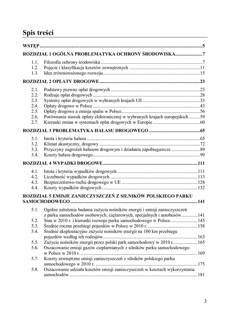Spis treści WSTĘP ...................................................................................................................................5 ROZDZIAŁ 1 OGÓLNA PROBLEMATYKA OCHRONY ŚRODOWISKA......................7 1.1. 1.2. 1.3. Filozofia ochrony środowiska ..................................................................................7 Pojęcie i klasyfikacja kosztów zewnętrznych .........................................................11 Idea zrównoważonego rozwoju..............................................................................15 ROZDZIAŁ 2 OPŁATY DROGOWE.................................................................................23 2.1. 2.2. 2.3. 2.4. 2.5. 2.6. 2.7. Podstawy prawne opłat drogowych ........................................................................23 Rodzaje opłat drogowych ......................................................................................28 Systemy opłat drogowych w wybranych krajach UE ..............................................33 Opłaty drogowe w Polsce ......................................................................................43 Opłaty drogowe a emisja spalin w Polsce...............................................................56 Porównanie stawek opłaty elektronicznej w wybranych krajach europejskich .........59 Kierunki zmian w systemach opłat drogowych w Europie ......................................60 ROZDZIAŁ 3 PROBLEMATYKA HAŁASU DROGOWEGO .........................................65 3.1. 3.2. 3.3. 3.4. Istota i kryteria hałasu ...........................................................................................65 Klimat akustyczny, drogowy .................................................................................72 Przyczyny zagrożeń hałasem drogowym i działania zapobiegawcze .......................89 Koszty hałasu drogowego......................................................................................99 ROZDZIAŁ 4 WYPADKI DROGOWE............................................................................111 4.1. 4.2. 4.3. 4.4. Istota i kryteria wypadków drogowych ................................................................111 Liczebność wypadków drogowych ......................................................................113 Bezpieczeństwo ruchu drogowego w UE .............................................................128 Koszty wypadków drogowych .............................................................................132 ROZDZIAŁ 5 EMISJE ZANIECZYSZCZEŃ Z SILNIKÓW POLSKIEGO PARKU SAMOCHODOWEGO ......................................................................................................141 5.1. 5.2. 5.3. 5.4. 5.5. 5.6. 5.7. 5.8. Ogólne założenia badania zużycia nośników energii i emisji zanieczyszczeń z parku samochodów osobowych, ciężarowych, specjalnych i autobusów.............141 Stan w 2010 r. i kierunki rozwoju parku samochodowego w Polsce......................145 Średnie roczne przebiegi pojazdów w Polsce w 2010 r. ........................................158 Średnie eksploatacyjne zużycie nośników energii na 100 km przebiegu pojazdów według ich rodzajów............................................................................163 Zużycie nośników energii przez polski park samochodowy w 2010 r....................165 Oszacowanie emisji gazów cieplarnianych z silników parku samochodowego w Polsce w 2010 r. ..............................................................................................169 Koszty zewnętrzne emisji zanieczyszczeń z silników polskiego parku samochodowego w 2010 r. ..................................................................................175 Oszacowanie udziału kosztów emisji zanieczyszczeń w kosztach wykorzystania samochodów .......................................................................................................181 3 Spis treści ROZDZIAŁ 6 WYBRANE ZAGADNIENIA KOSZTÓW ZEWNĘTRZNYCH TRANSPORTU SAMOCHODOWEGO W UE.................................................................187 6.1. 6.2. Założenia polityki ochrony środowiska ................................................................187 Koszty zewnętrzne w UE.....................................................................................191 REFLEKSJE KOŃCOWE.................................................................................................221 BIBLIOGRAFIA ................................................................................................................229 4