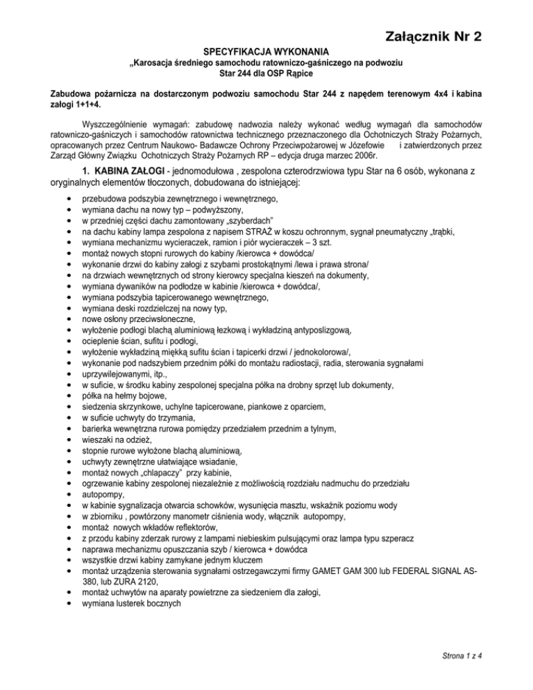 Załącznik Nr 2 SPECYFIKACJA WYKONANIA „Karosacja średniego samochodu ratowniczo-gaśniczego na podwoziu Star 244 dla OSP Rąpice Zabudowa pożarnicza na dostarczonym podwoziu samochodu Star 244 z napędem terenowym 4x4 i kabina załogi 1+1+4. Wyszczególnienie wymagań: zabudowę nadwozia należy wykonać według wymagań dla samochodów ratowniczo-gaśniczych i samochodów ratownictwa technicznego przeznaczonego dla Ochotniczych Straży Pożarnych, opracowanych przez Centrum Naukowo- Badawcze Ochrony Przeciwpożarowej w Józefowie i zatwierdzonych przez Zarząd Główny Związku Ochotniczych Straży Pożarnych RP – edycja druga marzec 2006r. 1. KABINA ZAŁOGI - jednomodułowa , zespolona czterodrzwiowa typu Star na 6 osób, wykonana z oryginalnych elementów tłoczonych, dobudowana do istniejącej: • • • • • • • • • • • • • • • • • • • • • • • • • • • • • • • • • • • • • przebudowa podszybia zewnętrznego i wewnętrznego, wymiana dachu na nowy typ – podwyższony, w przedniej części dachu zamontowany „szyberdach” na dachu kabiny lampa zespolona z napisem STRAŻ w koszu ochronnym, sygnał pneumatyczny „trąbki, wymiana mechanizmu wycieraczek, ramion i piór wycieraczek – 3 szt. montaż nowych stopni rurowych do kabiny /kierowca + dowódca/ wykonanie drzwi do kabiny załogi z szybami prostokątnymi /lewa i prawa strona/ na drzwiach wewnętrznych od strony kierowcy specjalna kieszeń na dokumenty, wymiana dywaników na podłodze w kabinie /kierowca + dowódca/, wymiana podszybia tapicerowanego wewnętrznego, wymiana deski rozdzielczej na nowy typ, nowe osłony przeciwsłoneczne, wyłożenie podłogi blachą aluminiową łezkową i wykładziną antyposlizgową, ocieplenie ścian, sufitu i podłogi, wyłożenie wykładziną miękką sufitu ścian i tapicerki drzwi / jednokolorowa/, wykonanie pod nadszybiem przednim półki do montażu radiostacji, radia, sterowania sygnałami uprzywilejowanymi, itp., w suficie, w środku kabiny zespolonej specjalna półka na drobny sprzęt lub dokumenty, półka na hełmy bojowe, siedzenia skrzynkowe, uchylne tapicerowane, piankowe z oparciem, w suficie uchwyty do trzymania, barierka wewnętrzna rurowa pomiędzy przedziałem przednim a tylnym, wieszaki na odzież, stopnie rurowe wyłożone blachą aluminiową, uchwyty zewnętrzne ułatwiające wsiadanie, montaż nowych „chlapaczy” przy kabinie, ogrzewanie kabiny zespolonej niezależnie z możliwością rozdziału nadmuchu do przedziału autopompy, w kabinie sygnalizacja otwarcia schowków, wysunięcia masztu, wskaźnik poziomu wody w zbiorniku , powtórzony manometr ciśnienia wody, włącznik autopompy, montaż nowych wkładów reflektorów, z przodu kabiny zderzak rurowy z lampami niebieskim pulsującymi oraz lampa typu szperacz naprawa mechanizmu opuszczania szyb / kierowca + dowódca wszystkie drzwi kabiny zamykane jednym kluczem montaż urządzenia sterowania sygnałami ostrzegawczymi firmy GAMET GAM 300 lub FEDERAL SIGNAL AS380, lub ZURA 2120, montaż uchwytów na aparaty powietrzne za siedzeniem dla załogi, wymiana lusterek bocznych Strona 1 z 4 Załącznik Nr 2 2. ZABUDOWA NADWOZIA -ZABUDOWA POŻARNICZA • • • • • • • • • • • • • • • • • • • • • • • • • • • • • • • • konstrukcja wykonana z profili stalowych zamkniętych, zabezpieczonych antykorozyjnie, poszycie zewnętrzne wykonane z blachy aluminiowej, mocowane metodą klejenia po trzy schowki na bokach pojazdu na sprzęt i wyposażenie, zamykane żaluzjami wodoi pyłoszczelnymi ze wspomaganiem otwarcia, systemem sprężynowym, wykluczającym samoczynne opadanie wykonanymi z materiałów odpornych na korozję , wyposażone w zamki na klucz, jeden klucz powinien pasować do wszystkich zamków zamontowanie taśm przy drzwiach żaluzji, ułatwiających zamykanie żaluzji . dostęp do sprzętu z zachowaniem wymagań ergonomii. konstrukcja skrytek zapewniająca odprowadzenie wody z ich wnętrza spody schowków wyłożone blachą aluminiową łezkową ściany schowków wyłożone blachą aluminiową, balustrada ochronna wykonana jako jednolita nierozłączna szuflady i wysuwne tace, automatycznie blokują się w pozycji zamkniętej i całkowicie otwartej, oraz posiadają zabezpieczenie przed całkowitym wypadnięciem, maszt oświetleniowy podnoszony pneumatycznie z tyłu pojazdu, z tyłu pojazdu ogrzewany przedział autopompy, zamykany żaluzją aluminiową, pod przedziałem autopompy podest zamontowany na tylnym zderzaku, schowki przeznaczone na sprzęt wodny, w dolnej części wyposażone w stojaki na węże W-52 – 8 szt. W-75 – 8 szt. Oraz uchwyty na prądownice, smok ssawny, rozdzielacz, kliny pod koła, przełącznik, agregat prądotwórczy i inne wyposażenie standardowe, w lewym dolnym schowku miejsce na mocowanie motopompy pływającej ‘Macximum” na wysuwnym podłożu lub z tyłu nad autopompą, szuflady i palety wyposażone w oznaczenia ostrzegawcze schowki nadwozia oświetlone wewnątrz automatycznie po otwarciu żaluzji, załączanych z kabiny kierowcy, oświetlenie zewnętrzne pola pracy wokół samochodu sterowane ręcznie,/ 5 lamp halogenowych/ konstrukcja skrytek umożliwiający łatwy dostęp do sprzętu, maksymalna wysokość najwyżej położonych półek, szuflad i palet nie może przekraczać 1850 mm od poziomu gruntu, dach pojazdu użytkowy pokryty blachą aluminiową łezkową, na dachu wyjście na działko wodno-pianowe z zaworem 2 ½”, uchwyty do mocowania drabiny DW-10, węży ssawnych Ø 110, hydrantu, klucza hydrantowego oraz skrzynia aluminiowa na sprzęt, zamykana, z tyłu pojazdu lampa LBO, drabina wejściowa na dach – nierdzewna, sygnał cofania z lampą pulsującą oraz belka świetlna „FALA” 6-cio segmentowa oraz 2 lampy diodowe pulsacyjne niebieskie, montaż lampy oświetlenia pola dachu załączanych z kabiny kierowcy oraz o9świetlenie pola pracy