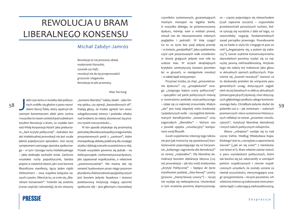 REWOLUCJA U BRAM LIBERALNEGO KONSENSU Michał Zabdyr-Jamróz Rewolucja to nie proszony obiad, wydarzenie literackie, rysunek czy haft; rewolucji nie da się przeprowadzić grzecznie i elegancko. Rewolucja to akt przemocy. Mao Tse-tung 58 J akiś czas temu w światku idei politycznych zrobiło się głośno o panu nazwiskiem Slavoj Žižek, który opatrzył obszernym komentarzem zbiór pism Lenina i wszystko to razem umieścił pod subtelnym tytułem Rewolucja u bram, co wydała nam nad Wisłą Korporacja Ha!art1 jako prekursora „Serii krytyki politycznej”. Jednakże ten akt intelektualnej prowokacji nie jest wcale jakimś pojedynczym epizodem. Jest raczej symptomem szerszego zjawiska społecznego – w tym i żywego nurtu intelektualnego – jakie dotknęło zachodni świat. Zarówno wszelakie ruchy populistycznie, bardzo prężne w ostatnich latach, jak i owe barwne filozoficzne manifesty, łączy jeden ciężki Weltschmerz – owa wspólna bolączka naszych czasów. Mierzi je to, co zwie się „liberalnym konsensem”. Twierdzi się ostatnio (coraz częściej i odważniej), że ów straszny „konsens liberalny” należy obalić – jako formę spisku, czy opresji „bezosobowych sił”. Padają głosy, że trzeba zgnieść ten owoc zalegalizowanej zmowy i podziału władzy nad światem; że należy zbuntować się przeciw tyranii rzeczywistości… W ten sposób artykułuje się przemożną potrzebę zlikwidowania politycznego kartelu prosystemowych partii z „centrum”, które monopolizują debatę publiczną dla swojego użytku i dyktują warunki uczestnictwa w niej. Przede wszystkim powinno się jednak – na dobry początek – rozhermetyzować dyskurs, jaki zapanował współcześnie, a właściwie „postnowocześnie”. Nie można dać się omamić budowanym przez niego pozorom pluralizmu. Różnorodność opcji politycznych jest bowiem jedynie fasadowa i stanowi podstawową instytucję mającą ujarzmić społeczne siły – jest głównym z konstelacji czynników systemowych, gwarantujących możnym monopol na legalne berło. A wszystko dlatego, że postnowoczesny dyskurs, mówiąc nam o wielości prawd, zmusił nas do nieuszanowania własnych poglądów i potrzeb2. W imię czego? Co to za życie bez pasji jedynej prawdy – w świecie „postpolityki”, jaka z parlamentu czyni cyrk pozorowanych walk wrestlerów: ce – często pojawiające się mimochodem (czyli zapewne szczere) – wypowiedzi przedstawicieli powyższych ruchów, które sytuują się wyraźnie z dala od tego, co stanowiłoby negację fundamentalnych zasad porządku prawnego. Powoływanie się na hasła w stylu On s’engage et puis on voit3 („Angażujemy się, a potem się zobaczy”), nawet wybitnie konserwatywnemu w istocie grających jedynie swe role ku uciesze mas. W oczach skrajniejszych krytyków centrystyczny konsens powinien lec w gruzach, w następstwie rewolucji – w takiej bądź innej postaci. Przyznać trzeba, że chęć „przewietrzenia dyskursu” czy „przepłukania” owego „stojącego bajora sceny politycznej” – specjaliści od partii politycznych mówią o rozmrożeniu podziału socjo-politycznego – zdaje się co najmniej zrozumiała. Małym „ale” jest tutaj niepokój wielu środowisk i pojedynczych osób – szczególnie domniemanych beneficjentów „konsensu” oraz zagorzałych „liberałów” – którym sen z powiek spędza „rewolucyjny” komponent owej filozofii. Gwoli wyjaśnienia: intencją tego tekstu nie jest (jak można by się spodziewać) kontestowanie pojawiającego się na horyzoncie „kolejnego zagrożenia dla demokracji” ze strony „radykałów”. Dla liberalnej demokracji bowiem deklaracja ideowa (czy też prowokacja – jak kto woli) środowiska „Krytyki Politycznej” – będąca de facto manifestem polskiej „Neo-Nowej” Lewicy (przeciw „Starej-Nowej Lewicy”) – raczej nie wydaje się niebezpieczna. Utwierdzać w tym wrażeniu powinny doprecyzowują- obywatelowi powinny wydać się co najwyżej pewną niefrasobliwością. Artykułu tego nie należy też traktować jako głosu w aktualnych sporach politycznych. Pojawienie się „kwestii rewolucji” stanowi za to doskonały pretekst do wtrącenia paru generalnych uwag, dotyczących zagadnień raczej banalnych w obliczu aktualnych (emancypacyjnych) dyskusji, choć dotyczących głębokiego podłoża całego kontestowanego ładu. Chciałbym jedynie dodać do polemiki coś o – jak mniemam – walorach poznawczych: nieco systemowo-historycznych refleksji na temat „przemian rewolucyjnych”, instytucji liberalnej demokracji i innych takich politycznych wihajstrów. Słowo „wihajster” wydaje się tu nad wyraz trafne. Według Władysława Kopalińskiego4 jest to „narzędzie o zapomnianej nazwie” („jak on się zwie?” z niemiecka: wie heisst er?). Mam właśnie zamiar mówić o paru wynalazkach politycznych, które tak bardzo się już zakorzeniły w ustrojach państw współczesnych i równie współczesnych umysłach, że zostały uznane za niemal oczywistości, niewymagające uwagi i przypomnienia – niczym powietrze. Ich właściwe imiona są traktowane instrumentalnie bądź z uderzającą niefrasobliwością, Ekspressje 59 i w efekcie często bywają przenoszone na przedmioty zupełnie inne. Czasem jednak warto przypomnieć, jakim „powietrzem politycznym” oddychamy. Wracając do rzeczy: mówienie o rewolu- z lat fundamentalistów 70., neonazistów, islamskich i wielu innych – można odnieść wrażenie, że nawet niektórych „neocons” z wczesnego okresu wojny w Iraku. cji – gwałtownej zmianie mającej obalić sta- W moim odczuciu tym, co ich łączy, jest tus quo, wprowadzić „nowy, sprawiedliw- swoisty prymitywizm. Nie ma znaczenia, szy ład” i uczynić świat lepszym – zdaje się w dyskursie postnowoczesnym pewną retorycznie dopuszczalną hiperbolą. Nie jest to nic specjalnie nowego – podobne na- 60 terrorystów stroje nawiedzają po