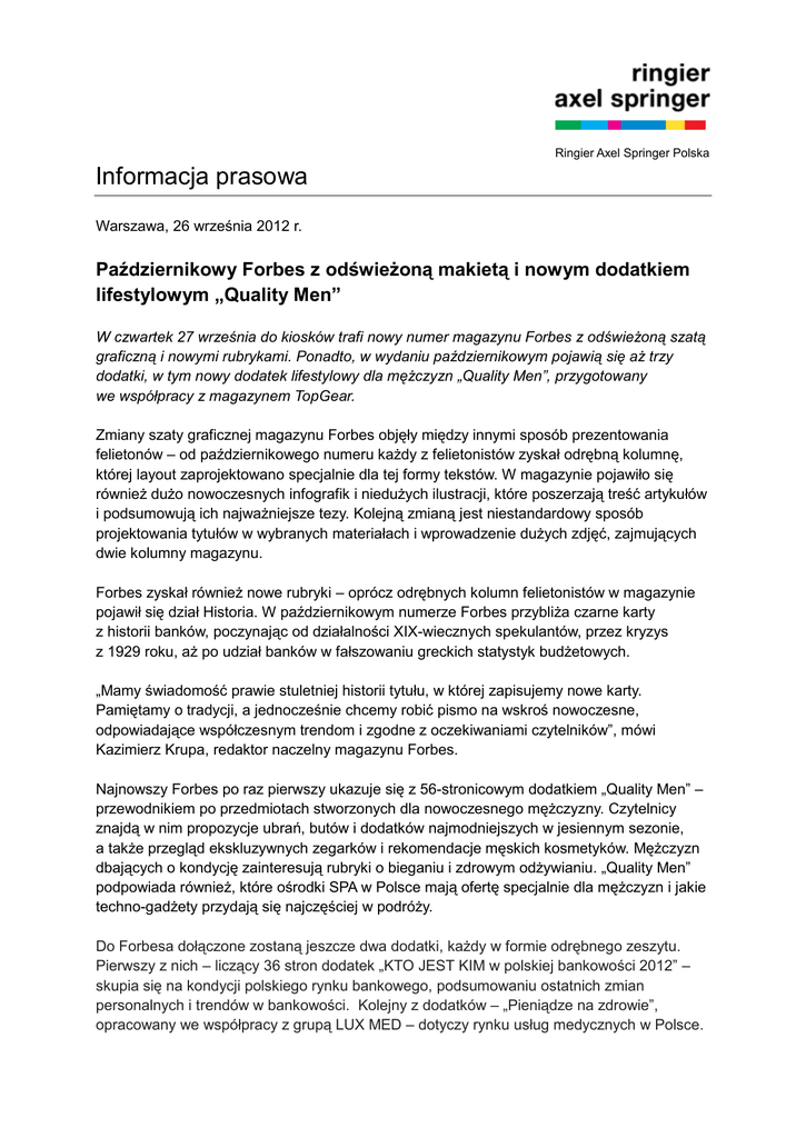 Ringier Axel Springer Polska Informacja prasowa Warszawa, 26 września 2012 r. Październikowy Forbes z odświeżoną makietą i nowym dodatkiem lifestylowym „Quality Men” W czwartek 27 września do kiosków trafi nowy numer magazynu Forbes z odświeżoną szatą graficzną i nowymi rubrykami. Ponadto, w wydaniu październikowym pojawią się aż trzy dodatki, w tym nowy dodatek lifestylowy dla mężczyzn „Quality Men”, przygotowany we współpracy z magazynem TopGear. Zmiany szaty graficznej magazynu Forbes objęły między innymi sposób prezentowania felietonów – od październikowego numeru każdy z felietonistów zyskał odrębną kolumnę, której layout zaprojektowano specjalnie dla tej formy tekstów. W magazynie pojawiło się również dużo nowoczesnych infografik i niedużych ilustracji, które poszerzają treść artykułów i podsumowują ich najważniejsze tezy. Kolejną zmianą jest niestandardowy sposób projektowania tytułów w wybranych materiałach i wprowadzenie dużych zdjęć, zajmujących dwie kolumny magazynu. Forbes zyskał również nowe rubryki – oprócz odrębnych kolumn felietonistów w magazynie pojawił się dział Historia. W październikowym numerze Forbes przybliża czarne karty z historii banków, poczynając od działalności XIX-wiecznych spekulantów, przez kryzys z 1929 roku, aż po udział banków w fałszowaniu greckich statystyk budżetowych. „Mamy świadomość prawie stuletniej historii tytułu, w której zapisujemy nowe karty. Pamiętamy o tradycji, a jednocześnie chcemy robić pismo na wskroś nowoczesne, odpowiadające współczesnym trendom i zgodne z oczekiwaniami czytelników”, mówi Kazimierz Krupa, redaktor naczelny magazynu Forbes. Najnowszy Forbes po raz pierwszy ukazuje się z 56-stronicowym dodatkiem „Quality Men” – przewodnikiem po przedmiotach stworzonych dla nowoczesnego mężczyzny. Czytelnicy znajdą w nim propozycje ubrań, butów i dodatków najmodniejszych w jesiennym sezonie, a także przegląd ekskluzywnych zegarków i rekomendacje męskich kosmetyków. Mężczyzn dbających o kondycję zainteresują rubryki o bieganiu i zdrowym odżywianiu. „Quality Men” podpowiada również, które ośrodki SPA w Polsce mają ofertę specjalnie dla mężczyzn i jakie techno-gadżety przydają się najczęściej w podróży. Do Forbesa dołączone zostaną jeszcze dwa dodatki, każdy w formie odrębnego zeszytu. Pierwszy z nich – liczący 36 stron dodatek „KTO JEST KIM w polskiej bankowości 2012” – skupia się na kondycji polskiego rynku bankowego, podsumowaniu ostatnich zmian personalnych i trendów w bankowości. Kolejny z dodatków – „Pieniądze na zdrowie”, opracowany we współpracy z grupą LUX MED – dotyczy rynku usług medycznych w Polsce. W raporcie znalazły się artykuły o nowych inwestycjach w sektorze medycznym, ubezpieczeniach zdrowotnych, prywatyzacji szpitali i publicznym systemie ochrony zdrowia. Dodatek zawiera 16 stron. Październikowy Forbes z trzema dodatkami kosztować będzie 11,90 zł. Kontakt: Anna Gancarz-Luboń rzecznik prasowy Tel. +48 22 232 14 03 Kom. +48 500 121 967 [email protected] *** Ringier Axel Springer Polska istnieje na rynku od 1994 roku. Od 2010 roku firma jest częścią międzynarodowej spółki medialnej Ringier Axel Springer Media AG, która działa również w Czechach, na Słowacji i w Serbii. Portfolio wydawcy obejmuje FAKT, największą pod względem sprzedaży gazetę w Polsce, dwa dzienniki sportowe – ogólnopolski Przegląd Sportowy i regionalny Sport, a także tygodnik Newsweek Polska, miesięcznik biznesowy Forbes, czasopisma komputerowe (m.in. Komputer Świat) i motoryzacyjne (m.in. Auto Świat, Top Gear). Spółka posiada również ponad 20 serwisów internetowych, a wśród nich portale informacyjne, serwisy sportowe, lifestylowe, motoryzacyjne, komputerowe i e-commerce. Ringier Axel Springer Polska posiada także 49 proc. udziałów w spółce INFOR Biznes, wydawcy Dziennika Gazety Prawnej.