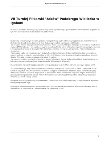 Igołomia-Wawrzeńczyce VII Turniej Piłkarski "żaków" Podokręgu Wieliczka w Igołomi W dniu 21.02.2016 r. zakończył się już VII Halowy turniej o puchar Wójta gminy Igołomia-Wawrzeńczyce w Igołomi. W tym roku rywalizowało 6 drużyn z rocznika 2008 i młodsi. Najbardziej emocjonującym meczem, podczas którego trybuny ożyły i kibicowały najgłośniej był mecz Wiarusów z Nadwiślanką Nowe Brzesko, bowiem te dwie drużyny zgromadziły największą ilość kibiców. Od początku pewnie po zwycięstwo kroczyła drużyna Piasta Łapanów, której na drodze po puchar stanąć mogła tylko drużyna SF Staniątki, ale i ten pojedynek wygrali zawodnicy Piasta, którzy z kompletem punktów zwyciężyli w turnieju. II miejsce zajęła drużyna SF Staniątki, która do końca walczyła o zwycięstwo, ale porażka z Piastem okazała się decydująca. Fascynującą walkę o III miejsce stoczyły drużyny Nadwiślanki, Wiarusów I i Gwarka Wieliczka. Lost tej rywalizacji rozstrzygnęły się w ostatnim meczu turnieju, w którym to Wiarusy mimo iż przegrywały pierwszą połowę, pokonały Gwarka Wieliczkę, tym samym zapewniając sobie III miejsce. Na czwartym miejscu po równie pasjonującej walce z Wiarusami, stanęła drużyna Nadwiślanki Nowe Brzesko, a na kolejnych miejscach uplasowały się drużyny Gwarka Wieliczka oraz Wiarusy II. Na wyróżnienie dla najmłodszego uczestnika turnieju zasłużyła Sara Rachtan, która nie skończyła jeszcze 5 lat! Tuż przed dekoracją, Wójt Gminy Igołomia-Wawrzeńczyce podziękował zawodnikom za udział i zaprosił ich na VIII turniej w przyszłym roku. Prezes Strumiński zwrócił uwagę na trud rodziców, dziadków, babci, którzy towarzyszą chłopcom w każdych zawodach dziękując im za poświęcenie. Przed ceremoniom wręczenia nagród miała miejsce jeszcze jedna niespodzianka, bardzo miła dla Prezesa Wiarusów Pawła Żabickiego, który od działaczy klubowych otrzymał upominek z okazji urodzin. Następnie wręczono pamiątkowy medal każdemu zawodnikowi oraz wręczono puchary za zajęte miejsca, wykonano masę pamiątkowych zdjęć. Dziękujemy współorganizatorom turnieju za włożony trud w organizację wydarzenia, kibicom za kulturalny doping, zawodnikom za piękne mecze i zaangażowanie. Do zobaczenia za rok! 1