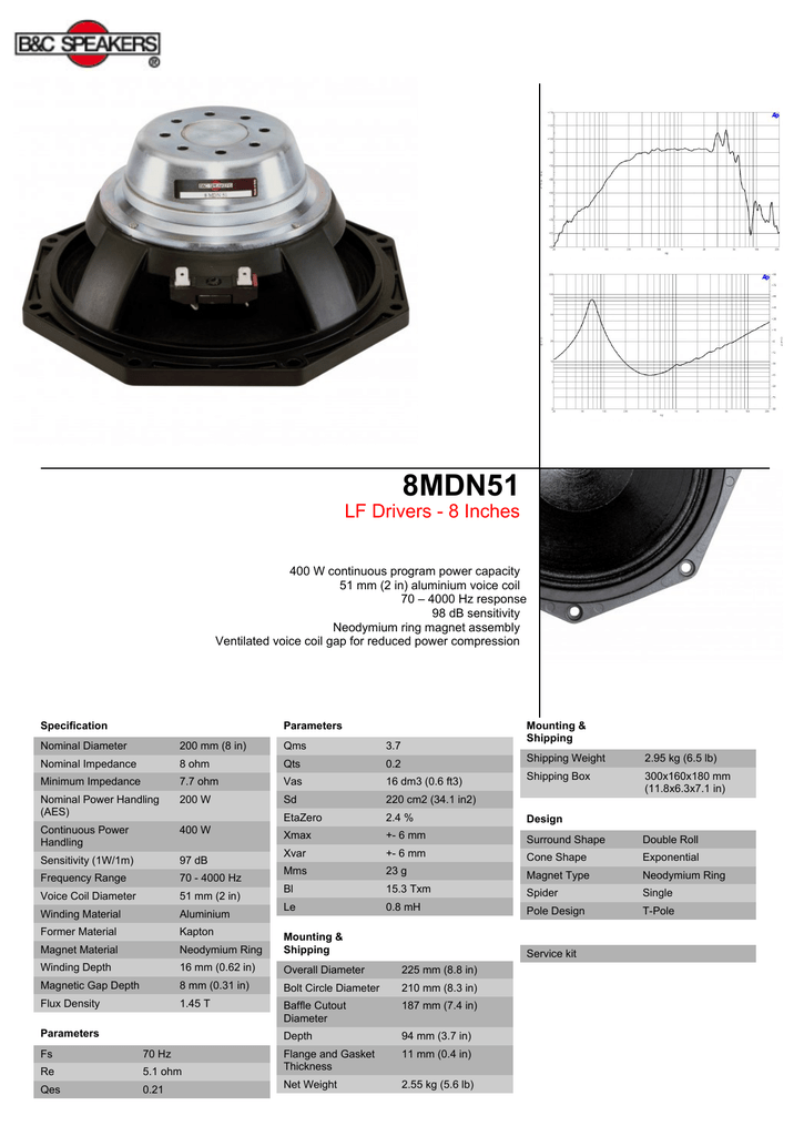 8MDN51 LF Drivers - 8 Inches 400 W continuous program power capacity 51 mm (2 in) aluminium voice coil 70 – 4000 Hz response 98 dB sensitivity Neodymium ring magnet assembly Ventilated voice coil gap for reduced power compression Specification Parameters Mounting & Shipping Nominal Diameter 200 mm (8 in) Qms 3.7 Nominal Impedance 8 ohm Qts 0.2 Shipping Weight 2.95 kg (6.5 lb) Shipping Box 300x160x180 mm (11.8x6.3x7.1 in) Minimum Impedance 7.7 ohm Vas 16 dm3 (0.6 ft3) Nominal Power Handling (AES) 200 W Sd 220 cm2 (34.1 in2) EtaZero 2.4 % Design Continuous Power Handling 400 W Xmax +- 6 mm Surround Shape Double Roll Xvar +- 6 mm Cone Shape Exponential Mms 23 g Magnet Type Neodymium Ring Bl 15.3 Txm Spider Single Le 0.8 mH Pole Design T-Pole Sensitivity (1W/1m) 97 dB Frequency Range 70 - 4000 Hz Voice Coil Diameter 51 mm (2 in) Winding Material Aluminium Former Material Kapton Magnet Material Neodymium Ring Mounting & Shipping Winding Depth 16 mm (0.62 in) Overall Diameter 225 mm (8.8 in) Magnetic Gap Depth 8 mm (0.31 in) Bolt Circle Diameter 210 mm (8.3 in) Flux Density 1.45 T Baffle Cutout Diameter 187 mm (7.4 in) Depth 94 mm (3.7 in) 11 mm (0.4 in) 2.55 kg (5.6 lb) Parameters Fs 70 Hz Re 5.1 ohm Flange and Gasket Thickness Qes 0.21 Net Weight Service kit
