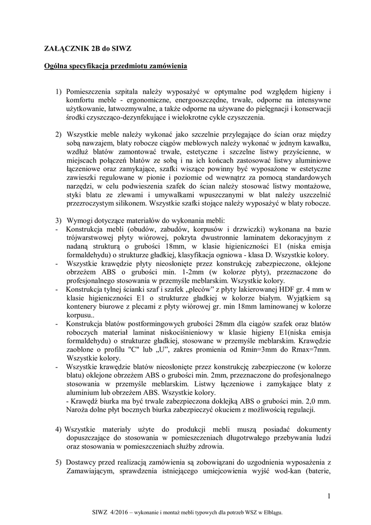 ZAŁĄCZNIK 2B do SIWZ Ogólna specyfikacja przedmiotu zamówienia 1) Pomieszczenia szpitala należy wyposażyć w optymalne pod względem higieny i komfortu meble - ergonomiczne, energooszczędne, trwałe, odporne na intensywne użytkowanie, łatwozmywalne, a także odporne na używane do pielęgnacji i konserwacji środki czyszcząco-dezynfekujące i wielokrotne cykle czyszczenia. 2) Wszystkie meble należy wykonać jako szczelnie przylegające do ścian oraz między sobą nawzajem, blaty robocze ciągów meblowych należy wykonać w jednym kawałku, wzdłuż blatów zamontować trwałe, estetyczne i szczelne listwy przyścienne, w miejscach połączeń blatów ze sobą i na ich końcach zastosować listwy aluminiowe łączeniowe oraz zamykające, szafki wiszące powinny być wyposażone w estetyczne zawieszki regulowane w pionie i poziomie od wewnątrz za pomocą standardowych narzędzi, w celu podwieszenia szafek do ścian należy stosować listwy montażowe, styki blatu ze zlewami i umywalkami wpuszczanymi w blat należy uszczelnić przezroczystym silikonem. Wszystkie szafki stojące należy wyposażyć w blaty robocze. 3) Wymogi dotyczące materiałów do wykonania mebli: - Konstrukcja mebli (obudów, zabudów, korpusów i drzwiczki) wykonana na bazie trójwarstwowej płyty wiórowej, pokryta dwustronnie laminatem dekoracyjnym z nadaną strukturą o grubości 18mm, w klasie higieniczności E1 (niska emisja formaldehydu) o strukturze gładkiej, klasyfikacja ogniowa - klasa D. Wszystkie kolory. - Wszystkie krawędzie płyty nieosłonięte przez konstrukcję zabezpieczone, oklejone obrzeżem ABS o grubości min. 1-2mm (w kolorze płyty), przeznaczone do profesjonalnego stosowania w przemyśle meblarskim. Wszystkie kolory. - Konstrukcja tylnej ścianki szaf i szafek „pleców” z płyty lakierowanej HDF gr. 4 mm w klasie higieniczności E1 o strukturze gładkiej w kolorze białym. Wyjątkiem są kontenery biurowe z plecami z płyty wiórowej gr. min 18mm laminowanej w kolorze korpusu.. - Konstrukcja blatów postformingowych grubości 28mm dla ciągów szafek oraz blatów roboczych materiał laminat niskociśnieniowy w klasie higieny E1(niska emisja formaldehydu) o strukturze gładkiej, stosowane w przemyśle meblarskim. Krawędzie zaoblone o profilu "C" lub „U”, zakres promienia od Rmin=3mm do Rmax=7mm. Wszystkie kolory. - Wszystkie krawędzie blatów nieosłonięte przez konstrukcję zabezpieczone (w kolorze blatu) oklejone obrzeżem ABS o grubości min. 2mm, przeznaczone do profesjonalnego stosowania w przemyśle meblarskim. Listwy łączeniowe i zamykające blaty z aluminium lub obrzeżem ABS. Wszystkie kolory. - Krawędź biurka ma być trwale zabezpieczona doklejką ABS o grubości min. 2,0 mm. Naroża dolne płyt bocznych biurka zabezpieczyć okuciem z możliwością regulacji. 4) Wszystkie materiały użyte do produkcji mebli muszą posiadać dokumenty dopuszczające do stosowania w pomieszczeniach długotrwałego przebywania ludzi oraz stosowania w pomieszczeniach służby zdrowia. 5) Dostawcy przed realizacją zamówienia są zobowiązani do uzgodnienia wyposażenia z Zamawiającym, sprawdzenia istniejącego umiejcowienia wyjść wod-kan (baterie, 1 SIWZ 4/2016 – wykonanie i montaż mebli typowych dla potrzeb WSZ w Elblągu. odpływy, umywalki itp.), oraz sprawdzenia realnych wymiarów w poszczególnych pomieszczeniach, pod kątem możliwości prawidłowego i precyzyjnego wykonania mebli. 6) Meble w pomieszczeniach szpitalnych należy wykonać na nóżkach umożliwiających mycie i dezynfekcję podłóg. Nóżki meblowe o wysokości 100mm/150mm ± 10mm powinny być zabezpieczone przed wilgocią oraz środkami używanymi do dezynfekcji podłóg. Zamawiający przewiduje nóżki regulowane metalowe o przekroju okrągłym min. Ø 50mm. 7) Zgodnie z zaleceniami Zamawiającego na połączeniu (zlicowaniu), płyt frontów, boków i blatów nie może występować uskok – rant, tzn. płyta na wszystkich w/w elementach musi licować, z uwagi na zachowanie czystości powierzchnie mebli powinny być gładkie i jednolite, nie dopuszcza się najmniejszych uszczerbków w płycie. 8) W pomieszczeniach należy wykonać ciągi zabudowy meblowej i blaty zgodnie z rysunkiem (rzutem pomieszczeń) wykonanym przez Zamawiającego i dołączonym każdorazowo do pojedynczego (etapowego) zlecenia. 9) Wymogi dotyczące sposobu wykonania mebli: - Biurka i stoły powinny być przystosowane do zastosowania pionowego i/lub poziomego systemu prowadzenia okablowania strukturalnego. Stosować na życzenie Zamawiającego. - Boki szaf oraz szafek stojących na nóżkach należy ustawiać na płycie dna (wieniec), nie dopuszcza się połączenia do boku płyty dna. - Biurka i stoły wykonać w zakresie wysokości wynoszącej 65-85cm w zależności od potrzeb użytkownika. - Blaty robocze i blaty biurek należy dodatowo wyposażyć w listwę ograniczającą wysokości h=10cm z płyty laminowanej w kolorze montowanych mebli umiejscowioną pod kątem prostym do blatu i ciągłą w długości blatu, metalowe kratki wentylacyjne (satynowe lub inox) do zamontowania w blatach nad lodówką podblatową, grzejnikiem itp., metalowe przepusty kablowe (satynowe lub inox) – montaż wyposażenia w/w na życzenie Zamawiającego. - Wymagane listwy przyblatowe w kolorze blatu uszczelniające blat ze ścianą z trwałym łączeniem (klejeniem) naroży i zakończeń. - Szafki wiszące powinny być wyposażone w estetyczne zawieszki umożliwiające regulację w pionie i poziomie od wewnątrz za pomocą standartowych narzędzi. Zawieszenie szafek wiszących na ścianach za pośrednictwem listew montażowych. - Wszystkie zastosowane elementy muszą być fabrycznie nowe, nieuszkodzone, sprawne - Zastosowana płyta wiórowa musi spełniać wymogi klasy higieniczności E1,pozostałe wymagania według normy PN-EN-438, oraz posiadać atest Państwowego Zakładu Higieny. Powierzchnia blatów musi wykazywać odporność na ściera
