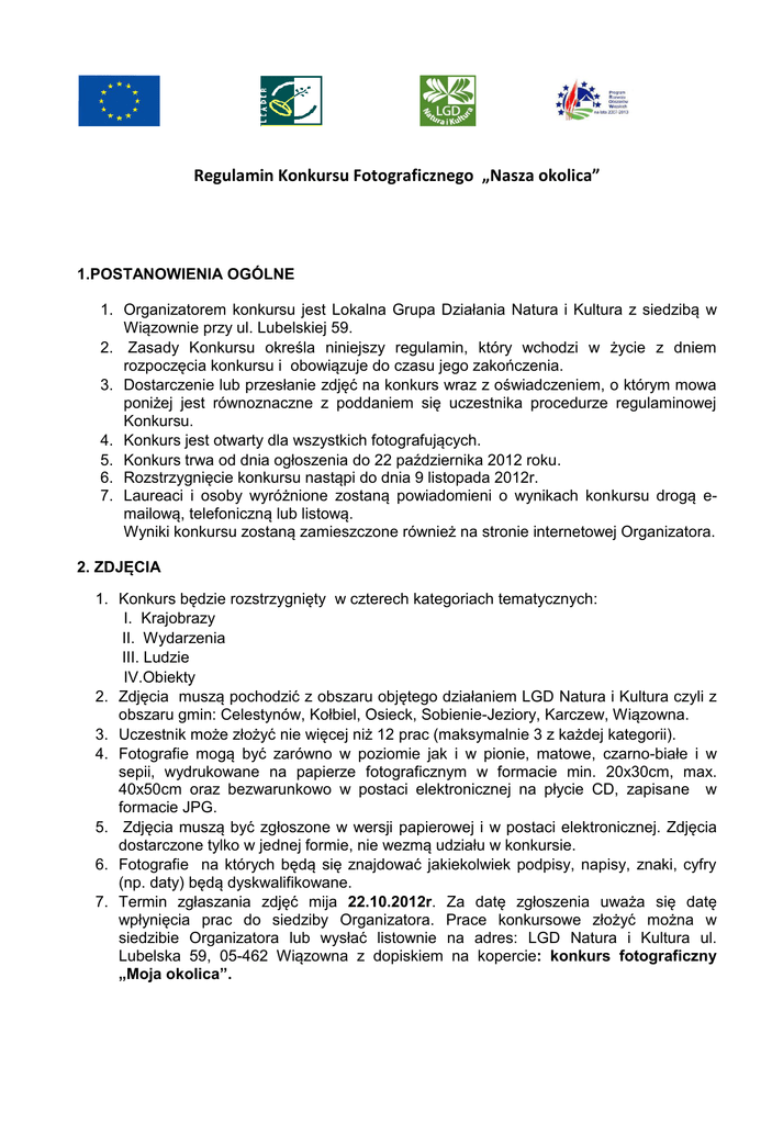 Regulamin Konkursu Fotograficznego „Nasza okolica” 1.POSTANOWIENIA OGÓLNE 1. Organizatorem konkursu jest Lokalna Grupa Działania Natura i Kultura z siedzibą w Wiązownie przy ul. Lubelskiej 59. 2. Zasady Konkursu określa niniejszy regulamin, który wchodzi w życie z dniem rozpoczęcia konkursu i obowiązuje do czasu jego zakończenia. 3. Dostarczenie lub przesłanie zdjęć na konkurs wraz z oświadczeniem, o którym mowa poniżej jest równoznaczne z poddaniem się uczestnika procedurze regulaminowej Konkursu. 4. Konkurs jest otwarty dla wszystkich fotografujących. 5. Konkurs trwa od dnia ogłoszenia do 22 października 2012 roku. 6. Rozstrzygnięcie konkursu nastąpi do dnia 9 listopada 2012r. 7. Laureaci i osoby wyróżnione zostaną powiadomieni o wynikach konkursu drogą emailową, telefoniczną lub listową. Wyniki konkursu zostaną zamieszczone również na stronie internetowej Organizatora. 2. ZDJĘCIA 1. Konkurs będzie rozstrzygnięty w czterech kategoriach tematycznych: I. Krajobrazy II. Wydarzenia III. Ludzie IV.Obiekty 2. Zdjęcia muszą pochodzić z obszaru objętego działaniem LGD Natura i Kultura czyli z obszaru gmin: Celestynów, Kołbiel, Osieck, Sobienie-Jeziory, Karczew, Wiązowna. 3. Uczestnik może złożyć nie więcej niż 12 prac (maksymalnie 3 z każdej kategorii). 4. Fotografie mogą być zarówno w poziomie jak i w pionie, matowe, czarno-białe i w sepii, wydrukowane na papierze fotograficznym w formacie min. 20x30cm, max. 40x50cm oraz bezwarunkowo w postaci elektronicznej na płycie CD, zapisane w formacie JPG. 5. Zdjęcia muszą być zgłoszone w wersji papierowej i w postaci elektronicznej. Zdjęcia dostarczone tylko w jednej formie, nie wezmą udziału w konkursie. 6. Fotografie na których będą się znajdować jakiekolwiek podpisy, napisy, znaki, cyfry (np. daty) będą dyskwalifikowane. 7. Termin zgłaszania zdjęć mija 22.10.2012r. Za datę zgłoszenia uważa się datę wpłynięcia prac do siedziby Organizatora. Prace konkursowe złożyć można w siedzibie Organizatora lub wysłać listownie na adres: LGD Natura i Kultura ul. Lubelska 59, 05-462 Wiązowna z dopiskiem na kopercie: konkurs fotograficzny „Moja okolica”. 8. Zgłaszane do konkursu fotografie należy opisać na odwrocie: kategoria, tytuł zdjęcia, miejsce wykonania zdjęcia, nazwę fotografowanego obiektu, imię i nazwisko autora zdjęcia. 9. W zgłoszeniu należy podać: imię i nazwisko, adres autora, telefon kontaktowy (i ewentualnie mail) ,oświadczenie o posiadaniu praw autorskich do zdjęć oraz zgodę na przetwarzanie danych osobowych zgodnie z załącznikami do niniejszego regulaminu 10. Organizator Konkursu informuje uczestników Konkursu, iż ich dane osobowe będą przechowywane i przetwarzane na podstawie wyrażonej dobrowolnie przez uczestnika Konkursu zgody, w siedzibie Organizatora, wyłącznie w związku z wykonaniem postanowień niniejszego Regulaminu. Każdy z uczestników ma prawo do wglądu swoich danych oraz ich poprawiania. 11. Wraz z przekazaniem fotografii należy przekazać podpisane oświadczenia, których wzór stanowią załączniki do niniejszego regulaminu (zał.1 i 2). 12. Oceny fotografii oraz przyznania nagród dokona Jury Konkursu powołane przez Organizatora. 3. NAGRODY 1. Laureat pierwszego miejsca w konkursie otrzyma nagrodę główną w postaci sprzętu fotograficznego o wartości do 3000 zł. 2. W każdej z 4 kategorii zostanie przyznane 1 wyróżnienie w postaci nagrody rzeczowej w wysokości do 500 zł. 3. Laureat konkursu nie może jednocześnie zostać dodatkowo wyróżniony w żadnej z 4 kategorii. 4. Organizator zastrzega sobie prawo do nieprzyznania pierwszego miejsca w przypadku niskiego poziomu zdjęć nadesłanych na konkurs. 4.PUBLIKOWANIE ZDJĘĆ 1. Zgłoszenie zdjęć do konkursu oznacza wyrażenie zgody na jego nieodpłatne wykorzystywanie do niekomercyjnej działalności statutowej Organizatora. Organizator zastrzega sobie prawo do publikowania fotografii zgłoszonych do konkursu, umieszczania ich na stronach internetowych, w mediach i wykorzystania ich w innej formie podając dane autora (imię i nazwisko). 5. POSTANOWIENIA KOŃCOWE 1. Zgłoszenie fotografii do konkursu jest jednoznaczne z przyjęciem warunków niniejszego regulaminu i oświadczeniem, że fotografie złożone na konkurs zostały wykonane osobiście, a w przypadku portretów uzyskano zgodę na rozpowszechnianie wizerunku osób portretowanych. 2. Fotografie zgłoszone do konkursu nie będą zwracane. 3. Organizator nie ponosi odpowiedzialności za ewentualne szkody spowodowane opublikowaniem nieprawdziwych danych osobowych bądź innych nieprawdziwych informacji opartych na zgłoszeniach sporządzonych przez Uczestników. 4. Decyzje Jury są ostateczne i wiążące dla Uczestników. 5. Organizator zastrzega sobie prawo do przerwania lub odwołania Konkursu. 6. Udział w konkursie jest równoznaczny z wyrażeniem przez osoby uczestniczące zgody na przetwarzanie przez organizatora ich danych osobowych na potrzeby konkursu oraz w celach marketingowych organizatora (ustawa o ochronie danych osobowych z dn. 29.08.1997 r. Dz. U. Nr 133 poz.833 z póz. zm.). Osoby uczestniczące w konkursie potwierdzają swoją zgodę na powyższe w formie przesłania do organizatora zgłoszenia z oświadczeniem omówionego w pkt. 2.11 niniejszego regulaminu. 7. Ostateczna interpretacja niniejszego regulaminu należy do Organizatora. 8. W sprawach nieuregulowanych niniejszym Regulaminem zastosowanie mają przepisy kodeksu cywilnego. 2