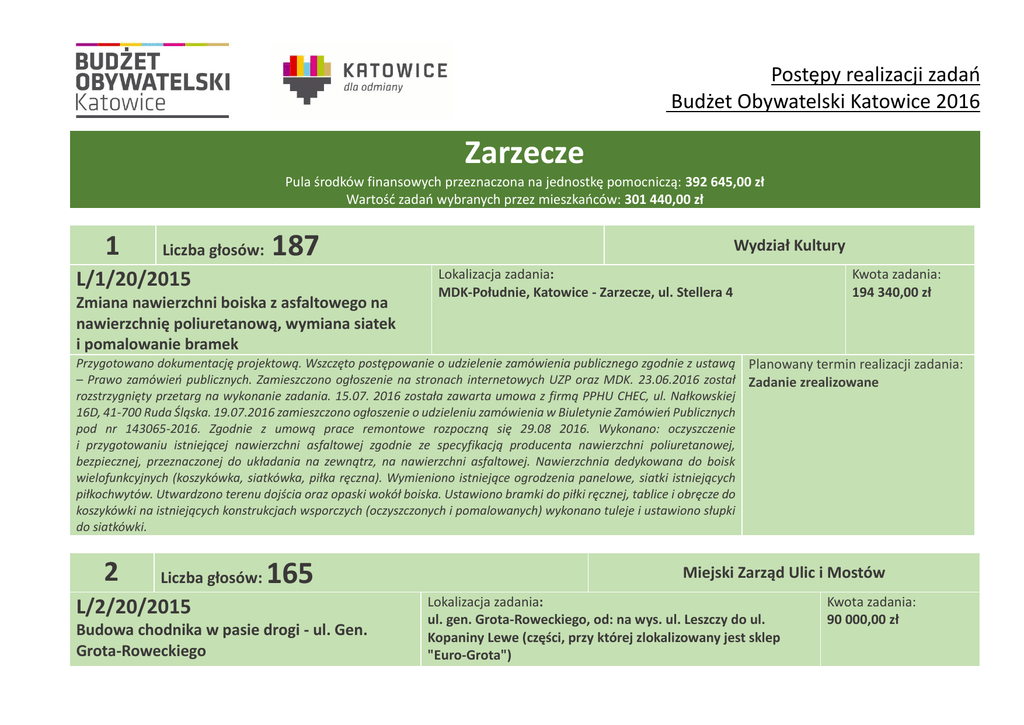 Postępy realizacji zadań Budżet Obywatelski Katowice 2016 Zarzecze Pula środków finansowych przeznaczona na jednostkę pomocniczą: 392 645,00 zł Wartość zadań wybranych przez mieszkańców: 301 440,00 zł 1 Liczba głosów: 187 L/1/20/2015 Zmiana nawierzchni boiska z asfaltowego na nawierzchnię poliuretanową, wymiana siatek i pomalowanie bramek Wydział Kultury Lokalizacja zadania: MDK-Południe, Katowice - Zarzecze, ul. Stellera 4 Kwota zadania: 194 340,00 zł Przygotowano dokumentację projektową. Wszczęto postępowanie o udzielenie zamówienia publicznego zgodnie z ustawą Planowany termin realizacji zadania: – Prawo zamówień publicznych. Zamieszczono ogłoszenie na stronach internetowych UZP oraz MDK. 23.06.2016 został Zadanie zrealizowane rozstrzygnięty przetarg na wykonanie zadania. 15.07. 2016 została zawarta umowa z firmą PPHU CHEC, ul. Nałkowskiej 16D, 41-700 Ruda Śląska. 19.07.2016 zamieszczono ogłoszenie o udzieleniu zamówienia w Biuletynie Zamówień Publicznych pod nr 143065-2016. Zgodnie z umową prace remontowe rozpoczną się 29.08 2016. Wykonano: oczyszczenie i przygotowaniu istniejącej nawierzchni asfaltowej zgodnie ze specyfikacją producenta nawierzchni poliuretanowej, bezpiecznej, przeznaczonej do układania na zewnątrz, na nawierzchni asfaltowej. Nawierzchnia dedykowana do boisk wielofunkcyjnych (koszykówka, siatkówka, piłka ręczna). Wymieniono istniejące ogrodzenia panelowe, siatki istniejących piłkochwytów. Utwardzono terenu dojścia oraz opaski wokół boiska. Ustawiono bramki do piłki ręcznej, tablice i obręcze do koszykówki na istniejących konstrukcjach wsporczych (oczyszczonych i pomalowanych) wykonano tuleje i ustawiono słupki do siatkówki. 2 Liczba głosów: 165 L/2/20/2015 Budowa chodnika w pasie drogi - ul. Gen. Grota-Roweckiego Miejski Zarząd Ulic i Mostów Lokalizacja zadania: ul. gen. Grota-Roweckiego, od: na wys. ul. Leszczy do ul. Kopaniny Lewe (części, przy której zlokalizowany jest sklep "Euro-Grota") Kwota zadania: 90 000,00 zł Zostało zlecone wykonanie dokumentacji technicznej, która została już uzgodniona z wnioskodawcą. Ogłoszenie Planowany termin realizacji zadania: przetargu 15 marca br. Realizacja zadania. Zadanie zrealizowane 3 Liczba głosów: 118 L/4/20/2015 Dzieci i młodzież z Zarzecza - Poznajmy się! Wydział Kultury Lokalizacja zadania: MDK "Południe", Filia nr 3 w Zarzeczu, ul. P. Stellera 4 Kwota zadania: 17 100,00 zł Organizacja bezpłatnych zajęć integracyjnych dla młodego pokolenia dzielnicy Zarzecze. Wśród proponowanych zajęć Planowany termin realizacji zadania: znajdują się: zajęcia artystyczne i plastyczne, sportowe, muzyczne oraz koncerty, spotkania czytelnicze, seanse filmowe, Zadanie zrealizowane spotkania teatralne, warsztaty kulinarne, bal karnawałowy. Zrealizowane imprezy: 1. „Bal karnawałowy dla dzieci” (16.01) 2. „Fascynujące planszówki – spotkanie i prezentacja (31.01) 3. „Klub włóczykijów” - projekcja filmowa dla dzieci (13.02) 4. „Fascynujące planszówki” spotkanie i prezentacja (20.02) 5. „Warsztaty teatralne z teatrem Trip” (5.03) 6. „Wielkanocne warsztaty ozdób świątecznych” (19.03.) 7. „Warsztaty tańca ludowego” (9.04.) 8. „Warsztaty tańca Irlandzkiego” (16.04) 9. „Warsztaty sportowe - karate” (7.05) 10. „Warsztaty sportowe - boks” (14.05) 11. Warsztaty ekologiczno-artystyczne (4.06.) 12. Warsztaty ekologiczno-artystyczne (11.06) 13. Warsztaty wakacyjne (26-27.07) 14. Warsztaty rękodzieła dla dzieci (2-3.08) 15. Warsztaty tańca irlandzkiego (23-24.08) 16. Warsztaty ekologiczne (13.09.) 17. Rękodzieło-malowanie torebek (27.09) 18. Kolorowe różańce (11.10) 19. Spektakl teatralny (25.10) 20. Gry planszowe (8.11.) 21. Andrzejki (22.11.) 22. Spotkanie z Mikołajem (6.12)