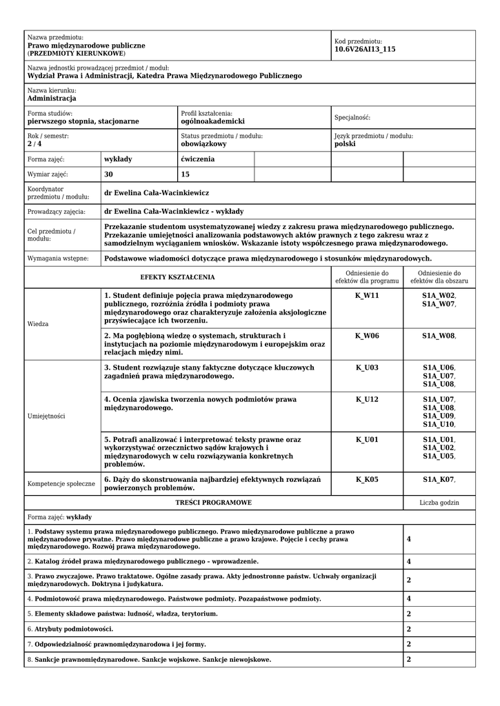 Nazwa przedmiotu: Kod przedmiotu: Prawo międzynarodowe publiczne 10.6V26AI13_115 (PRZEDMIOTY KIERUNKOWE) Nazwa jednostki prowadzącej przedmiot / moduł: Wydział Prawa i Administracji, Katedra Prawa Międzynarodowego Publicznego Nazwa kierunku: Administracja Forma studiów: Profil kształcenia: pierwszego stopnia, stacjonarne ogólnoakademicki Rok / semestr: 2/4 Status przedmiotu / modułu: Język przedmiotu / modułu: obowiązkowy polski Specjalność: Forma zajęć: wykłady ćwiczenia Wymiar zajęć: 30 15 Koordynator przedmiotu / modułu: dr Ewelina Cała-Wacinkiewicz Prowadzący zajęcia: dr Ewelina Cała-Wacinkiewicz - wykłady Cel przedmiotu / modułu: Przekazanie studentom usystematyzowanej wiedzy z zakresu prawa międzynarodowego publicznego. Przekazanie umiejętności analizowania podstawowych aktów prawnych z tego zakresu wraz z samodzielnym wyciąganiem wniosków. Wskazanie istoty współczesnego prawa międzynarodowego. Wymagania wstępne: Podstawowe wiadomości dotyczące prawa międzynarodowego i stosunków międzynarodowych. Odniesienie do efektów dla programu Odniesienie do efektów dla obszaru 1. Student definiuje pojęcia prawa międzynarodowego publicznego, rozróżnia źródła i podmioty prawa międzynarodowego oraz charakteryzuje założenia aksjologiczne przyświecające ich tworzeniu. K_W11 S1A_W02, S1A_W07, 2. Ma pogłębioną wiedzę o systemach, strukturach i instytucjach na poziomie międzynarodowym i europejskim oraz relacjach między nimi. K_W06 S1A_W08, 3. Student rozwiązuje stany faktyczne dotyczące kluczowych zagadnień prawa międzynarodowego. K_U03 S1A_U06, S1A_U07, S1A_U08, 4. Ocenia zjawiska tworzenia nowych podmiotów prawa międzynarodowego. K_U12 S1A_U07, S1A_U08, S1A_U09, S1A_U10, 5. Potrafi analizować i interpretować teksty prawne oraz wykorzystywać orzecznictwo sądów krajowych i międzynarodowych w celu rozwiązywania konkretnych problemów. K_U01 S1A_U01, S1A_U02, S1A_U05, 6. Dąży do skonstruowania najbardziej efektywnych rozwiązań powierzonych problemów. K_K05 S1A_K07, EFEKTY KSZTAŁCENIA Wiedza Umiejętności Kompetencje społeczne TREŚCI PROGRAMOWE Liczba godzin Forma zajęć: wykłady 1. Podstawy systemu prawa międzynarodowego publicznego. Prawo międzynarodowe publiczne a prawo międzynarodowe prywatne. Prawo międzynarodowe publiczne a prawo krajowe. Pojęcie i cechy prawa międzynarodowego. Rozwój prawa międzynarodowego. 4 2. Katalog źródeł prawa międzynarodowego publicznego – wprowadzenie. 4 3. Prawo zwyczajowe. Prawo traktatowe. Ogólne zasady prawa. Akty jednostronne państw. Uchwały organizacji międzynarodowych. Doktryna i judykatura. 2 4. Podmiotowość prawa międzynarodowego. Państwowe podmioty. Pozapaństwowe podmioty. 4 5. Elementy składowe państwa: ludność, władza, terytorium. 2 6. Atrybuty podmiotowości. 2 7. Odpowiedzialność prawnomiędzynarodowa i jej formy. 2 8. Sankcje prawnomiędzynarodowe. Sankcje wojskowe. Sankcje niewojskowe. 2 9. Sądownictwo prawnomiędzynarodowe. Organy sądowe. Organy pozasądowe. 2 10. Międzynarodowy system ochrony praw człowieka. System powszechny (ONZ-owski). System europejski. Inne systemy pozaeuropejskie. 2 11. Organizacje międzynarodowe: NATO, Rada Europy, Unia Europejska, Organizacja Narodów Zjednoczonych. 4 Forma zajęć: ćwiczenia 1. Szybkie powstawanie zwyczaju – aspekt praktyczny (rozwiązywanie stanów faktycznych). 2 2. Budowa umowy międzynarodowej – w teorii prawa międzynarodowego i praktyce organów sądowych. 4 3. Państwa i inne pozapaństwowe podmioty prawa międzynarodowego. 2 4. Analiza wybranych orzeczeń organów ochrony praw człowieka. 2 5. Statuty organizacji międzynarodowych. Status organizacji międzynarodowych. System instytucjonalny organizacji międzynarodowych. Funkcje organizacji międzynarodowych. Prawnomiędzynarodowa działalność organizacji międzynarodowych. 5 Wykłady teoretycznie przedstawiają problematykę z zakresu prawa międzynarodowego publicznego. Oparte są o analizę dokumentów międzynarodowych. Metody kształcenia Ćwiczenia prowadzone są w formie interaktywnej, oparte na poszukiwaniu rozwiązań konkretnych stanów faktycznych. Metody weryfikacji efektów kształcenia Forma i warunki zaliczenia Nr efektu kształcenia z sylabusa * egzamin pisemny 1,2,3,3,4,5,6, Egzamin pisemny, w formie testu jednokrotnego wyboru, składający się z 15 pytań testo-wych zamkniętych. Sposób wyliczenia oceny końcowej: ocena końcowa jest wyliczana na podstawie egzaminu w następujący sposób: - 15 punktów - bardzo dobry. - 14 punktów - dobry plus, - 13 i 12 punktów - dobry, - 11 i 10 punktów - dostateczny plus, - 9 i 8 punktów - dostateczny, - poniżej 7 punktów - niedostateczny. Literatura podstawowa Cała - Wacinkiewicz E., Podgórzańska R., Wacinkiewicz D. (red.) (2011): Encyklopedia zagadnień międzynarodowych. C.H. Beck Daranowski P., Połatyńska J. (2011): Prawo międzynarodowe publiczne (wybór orzecznictwa). C.H. Beck Antonowicz L. (2011): Prawo międzynarodowe publiczne. LexisNexis Polska Cała - Wacinkiewicz E. (2012): Podstawy systemu prawa międzynarodowego: pytania, testy, kazusy, tablice. C.H. Beck Literatura uzupełniająca Cała - Wacinkiewicz E. (2012): System instytucji UE z uwzględnieniem postanowień Traktatu Lizbońskiego: pytania, testy, kazusy, tablice. C.H. Beck Białocerkiewicz J. (2007): Prawo międzynarodowe publiczne. Zarys wykładu. TNOiK Toruń Barcik J., Srogosz T. (2007): Prawo międzynarodowe publiczne. C.H. Beck NAKŁAD PRACY STUDENTA: Liczba godzin Zajęcia dydaktyczne 45 Udział w konsultacjach 15 Zdawanie egzaminu lub/i zaliczenia 4 Przygotowanie się do zajęć 22 Studiowanie literatury 25 Przygotowanie się do egzaminu lub/i zaliczenia 14 ŁĄCZNY nakład pracy studenta w godz. 125 Liczba punktów ECTS 5