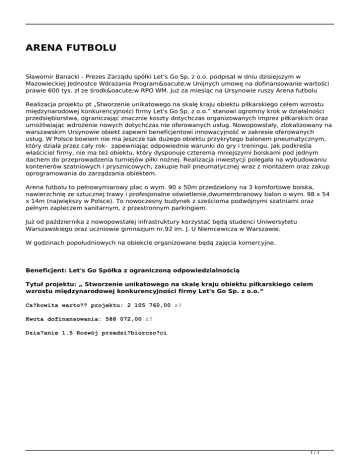 ARENA FUTBOLU Sławomir Banacki - Prezes Zarządu spółki Let's Go Sp. z o.o. podpisał w dniu dzisiejszym w Mazowieckiej Jednostce Wdrażania Programów Unijnych umowę na dofinansowanie wartości prawie 600 tys. zł ze środków RPO WM. Już za miesiąc na Ursynowie ruszy Arena futbolu Realizacja projektu pt „Stworzenie unikatowego na skalę kraju obiektu piłkarskiego celem wzrostu międzynarodowej konkurencyjności firmy Let's Go Sp. z o.o.” stanowi ogromny krok w działalności przedsiębiorstwa, ograniczając znacznie koszty dotychczas organizowanych imprez piłkarskich oraz umożliwiając wdrożenie nowych dotychczas nie oferowanych usług. Nowopowstały, zlokalizowany na warszawskim Ursynowie obiekt zapewni beneficjentowi innowacyjność w zakresie oferowanych usług. W Polsce bowiem nie ma jeszcze tak dużego obiektu przykrytego balonem pneumatycznym, który działa przez cały rok- zapewniając odpowiednie warunki do gry i treningu. Jak podkreśla właściciel firmy, nie ma też obiektu, który dysponuje czterema mniejszymi boiskami pod jednym dachem do przeprowadzenia turniejów piłki nożnej. Realizacja inwestycji polegała na wybudowaniu kontenerów szatniowych i prysznicowych, zakupie hali pneumatycznej wraz z montażem oraz zakup oprogramowania do zarządzania obiektem. Arena futbolu to pełnowymiarowy plac o wym. 90 x 50m przedzielony na 3 komfortowe boiska, nawierzchnię ze sztucznej trawy i profesjonalne oświetlenie,dwumembranowy balon o wym. 98 x 54 x 14m (największy w Polsce). To nowoczesny budynek z sześcioma podwójnymi szatniami oraz pełnym zapleczem sanitarnym, z przestronnym parkingiem. Już od października z nowopowstałej infrastruktury korzystać będą studenci Uniwersytetu Warszawskiego oraz uczniowie gimnazjum nr.92 im. J. U Niemcewicza w Warszawie. W godzinach popołudniowych na obiekcie organizowane będą zajęcia komercyjne. Beneficjent: Let's Go Spółka z ograniczoną odpowiedzialnością Tytuł projektu: „ Stworzenie unikatowego na skalę kraju obiektu piłkarskiego celem wzrostu międzynarodowej konkurencyjności firmy Let's Go Sp. z o.o.” Ca?kowita warto?? projektu: 2 105 760,00 z? Kwota dofinansowania: 588 072,00 z? Dzia?anie 1.5 Rozwój przedsi?biorczo?ci 1/1