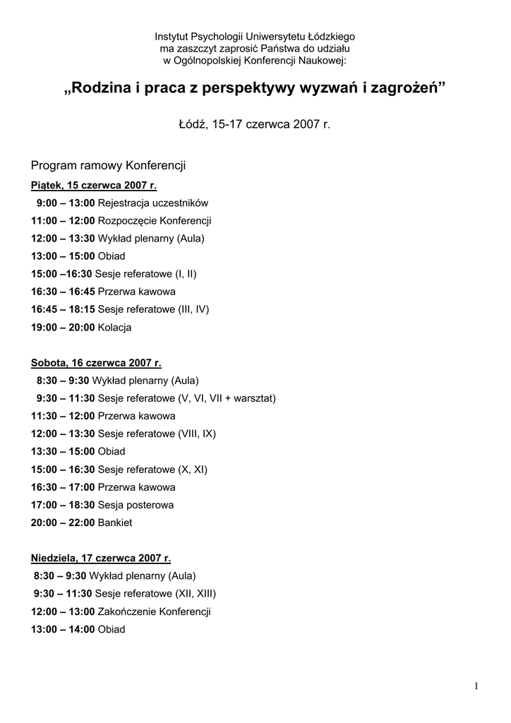Instytut Psychologii Uniwersytetu Łódzkiego ma zaszczyt zaprosić Państwa do udziału w Ogólnopolskiej Konferencji Naukowej: „Rodzina i praca z perspektywy wyzwań i zagrożeń” Łódź, 15-17 czerwca 2007 r. Program ramowy Konferencji Piątek, 15 czerwca 2007 r. 9:00 – 13:00 Rejestracja uczestników 11:00 – 12:00 Rozpoczęcie Konferencji 12:00 – 13:30 Wykład plenarny (Aula) 13:00 – 15:00 Obiad 15:00 –16:30 Sesje referatowe (I, II) 16:30 – 16:45 Przerwa kawowa 16:45 – 18:15 Sesje referatowe (III, IV) 19:00 – 20:00 Kolacja Sobota, 16 czerwca 2007 r. 8:30 – 9:30 Wykład plenarny (Aula) 9:30 – 11:30 Sesje referatowe (V, VI, VII + warsztat) 11:30 – 12:00 Przerwa kawowa 12:00 – 13:30 Sesje referatowe (VIII, IX) 13:30 – 15:00 Obiad 15:00 – 16:30 Sesje referatowe (X, XI) 16:30 – 17:00 Przerwa kawowa 17:00 – 18:30 Sesja posterowa 20:00 – 22:00 Bankiet Niedziela, 17 czerwca 2007 r. 8:30 – 9:30 Wykład plenarny (Aula) 9:30 – 11:30 Sesje referatowe (XII, XIII) 12:00 – 13:00 Zakończenie Konferencji 13:00 – 14:00 Obiad 1 Szczegółowy program Konferencji Piątek, 15 czerwca 2007 r. 9:00 – 13:00 Rejestracja uczestników 11:00 – 12:00 Rozpoczęcie Konferencji 12:00 – 13:30 Wykład plenarny (Aula): prof. Wielisława Warzywoda-Kruszyńska – Rodzina a dziedziczenie nierówności społecznych 13:00 – 15:00 Obiad 15:00 –16:30 Sesje referatowe Sala 4. Aula Sesja I - Pracoholizm - uwarunkowania Sesja II - Wpływ bezrobocia na jakość życia i plany życiowe jednostki Prowadzący: Prof. dr hab. Lucyna Golińska Prowadzący: dr Elżbieta Kasprzak 1. Osobowościowe mechanizmy pracoholizmu 1. Bezrobocie – zagrożenie dla dobrostanu - Lucyna Golińska 2. Fenomen pracoholizmu – niektóre uwarunkowania uzależnienia od pracy – psychicznego człowieka – Elżbieta Kasprzak 2. Poczucie jakości życia u osób długotrwale bezrobotnych - Elżbieta Turska 3. Długoterminowe bezrobocie jako ryzyko Kamila Wojdyło 3. Pracoholik w rodzinie - Dorota StrzelczykMuszyńska wykluczenia społecznego – Elżbieta Szutowicz - Rozwadowska 4. Wymarzona praca czy już religia? Analiza 4. Pomoc osobom bezrobotnym. Na porównawcza oddziaływania na przykładzie działań Biur Aktywizacji pracowników w korporacji i członków w Bezrobotnych – Wojciech Muszyński sekcie destrukcyjnej – Anna Rojewska 5. Plany migracyjne młodzieży – świadomy wybór czy konieczność? – Ewa Sikora 16:30 – 16:45 Przerwa kawowa 16:45 – 18:15 Sesje referatowe Sala 4. Aula Sesja III - Psychospołeczne aspekty Sesja IV - Percepcja konfliktu rodzina – funkcjonowania zawodowego pracowników praca w zależności od płci Prowadzący: dr Agnieszka Lipińska-Grobelny Prowadzący: Prof. Anna Kwiatkowska 1. Postrzeganie sytuacji organizacyjnej przez 1. Życie rodzinne z męskiej perspektywy: pryzmat schematów płci - Agnieszka wartości i przekonania a ocena własnej Lipińska-Grobelny pozycji w związku - Anna Kwiatkowska 2. Zderzenie wizji z rzeczywistością – idealny 2. Klimat życia rodzinnego kobiet aktywnych i 2 obraz organizacji w odbiciu opinii nieaktywnych zawodowo – Lidia Dakowicz, pracowników – Paweł Błaszkiewicz Andrzej Dakowicz 3. Makiawelista w roli przywódcy – Irena Pilch 4. Uwarunkowania dyrektywnego stylu pracy unauczycieli – Grażyna Poraj 5. Kompetencje społeczne u uczestników kursu pilotów wycieczek – Łukasz Krzywoszański 3. Męski konflikt pomiędzy pracą zawodową a życiem rodzinnym - uwarunkowania podmiotowe i społeczne - Nowakowska Agnieszka 4. Rodzinne determinanty społecznozawodowego funkcjonowania kobiet pełniących funkcje kierownicze – Marta Czechowska-Bieluga 5. Wpływ pracy zawodowej i komunikacji małżeńskiej na poczucie satysfakcji ze związku w percepcji kobiet i mężczyzn – Joanna Różańska - Kowal 19:00 – 20:00 Kolacja Sobota, 16 czerwca 2007 r. 8:30 – 9:30 Wykład plenarny (Aula): Prof. dr hab. Anna Zalewska - Konflikty „rodzina-praca” – ich uwarunkowania i skutki (zadowolenie z życia i pracy) u kobiet i mężczyzn 9:30 – 11:30 Sesje referatowe Sala 4. Aula Sesja V - Zagrożenia życia rodzinnego Sesja VI - Stres związany z pracą i wypalenie zawodowe Prowadzący: prof. dr hab. Janusz Mastalski Prowadzący: prof. dr hab. Bohdan Dudek 3 1. Toksyczne interakcje rodzinne w społeczeństwie konsumpcyjnym. Wymiar aksjologiczny - Janusz Mastalski 2. Zasoby społeczne jako źródło zdrowia/choroby w wymiarze psychologicznym – Helena Wrona-Polańska 3. Rodzina z leczącym się alkoholikiem - 1. Stres związany z pracą a Teoria Zachowania Zasobów S.Hobfolla – Bohdan Dudek 2. Stres zawodowy – ujęcie transakcyjne – Dorota Kanafa-Chmielewska 3. Między pracą a rodziną - Bogusława Piasecka 4. Trzy twarze wypalenia zawodowego. charakterystyka zjawiska – Iwona Zagrożenia w zawodzie menedżera – Grzegorzewska Justyna Syroka 4. Separacja małżeńska – Monika Walczak 5. Kohabitacja i samotność z wyboru jako nowe wyzwania i zagrożenia stojące przed współczesną rodziną – Wioletta Szumilas 6. Syndrom Pustego Gniazda. Dezintegracja małżeństwa i rodziny czy etap nowych wyzwań?– Sabina Zalewska 5. Wypalenie zawodowe nauczycieli akademickich – dynamika i uwarunkowania indywidualne – Waldemar Świętochowski 6. Wypalenie zawodowe a PTSD i cechy osobowości u lekarzy i pielęgniarek – Natalia Górska, Martyna Głuszek-Osuch 7. Poziom lęku oraz wsparcie społeczne w grupie strażaków Jednostek Ratowniczo – Gaśniczych w Łodzi – Paweł Rasmus Sala 3 Sesja VII – Pomoc psychologiczna dla rodziny Prowadzący: dr Alicja Maurer 4 1. Test ustawiania figur FAST - jedna z grupy metod diagnozy i terapii zagrożeń w rodzinie i innych małych grupach – Alicja Maurer 2. Nowa wersja Modelu Kołowego D.H.Olsona i kwestionariusz FACES IV jako narzędzie badania rodziny – Andrzej Margasiński 3. Mediacje rodzinne – możliwości i ograniczenia – Małgorzata Artymiak 4. Warszta