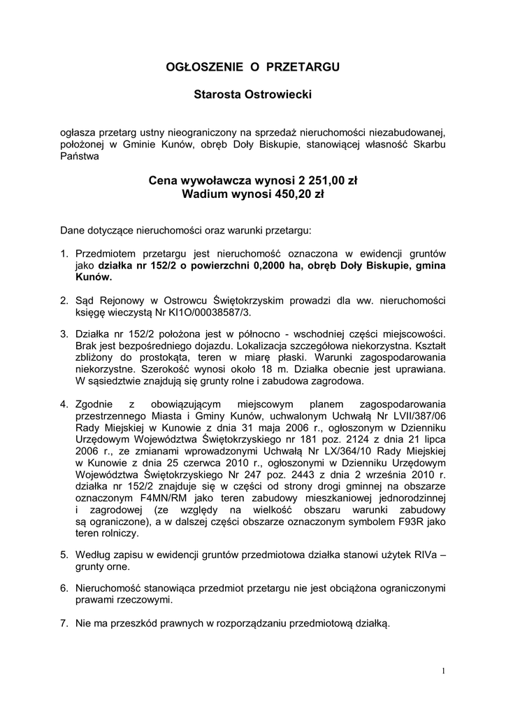 OGŁOSZENIE O PRZETARGU Starosta Ostrowiecki ogłasza przetarg ustny nieograniczony na sprzedaż nieruchomości niezabudowanej, położonej w Gminie Kunów, obręb Doły Biskupie, stanowiącej własność Skarbu Państwa Cena wywoławcza wynosi 2 251,00 zł Wadium wynosi 450,20 zł Dane dotyczące nieruchomości oraz warunki przetargu: 1. Przedmiotem przetargu jest nieruchomość oznaczona w ewidencji gruntów jako działka nr 152/2 o powierzchni 0,2000 ha, obręb Doły Biskupie, gmina Kunów. 2. Sąd Rejonowy w Ostrowcu Świętokrzyskim prowadzi dla ww. nieruchomości księgę wieczystą Nr KI1O/00038587/3. 3. Działka nr 152/2 położona jest w północno - wschodniej części miejscowości. Brak jest bezpośredniego dojazdu. Lokalizacja szczegółowa niekorzystna. Kształt zbliżony do prostokąta, teren w miarę płaski. Warunki zagospodarowania niekorzystne. Szerokość wynosi około 18 m. Działka obecnie jest uprawiana. W sąsiedztwie znajdują się grunty rolne i zabudowa zagrodowa. 4. Zgodnie z obowiązującym miejscowym planem zagospodarowania przestrzennego Miasta i Gminy Kunów, uchwalonym Uchwałą Nr LVII/387/06 Rady Miejskiej w Kunowie z dnia 31 maja 2006 r., ogłoszonym w Dzienniku Urzędowym Województwa Świętokrzyskiego nr 181 poz. 2124 z dnia 21 lipca 2006 r., ze zmianami wprowadzonymi Uchwałą Nr LX/364/10 Rady Miejskiej w Kunowie z dnia 25 czerwca 2010 r., ogłoszonymi w Dzienniku Urzędowym Województwa Świętokrzyskiego Nr 247 poz. 2443 z dnia 2 września 2010 r. działka nr 152/2 znajduje się w części od strony drogi gminnej na obszarze oznaczonym F4MN/RM jako teren zabudowy mieszkaniowej jednorodzinnej i zagrodowej (ze względy na wielkość obszaru warunki zabudowy są ograniczone), a w dalszej części obszarze oznaczonym symbolem F93R jako teren rolniczy. 5. Według zapisu w ewidencji gruntów przedmiotowa działka stanowi użytek RIVa – grunty orne. 6. Nieruchomość stanowiąca przedmiot przetargu nie jest obciążona ograniczonymi prawami rzeczowymi. 7. Nie ma przeszkód prawnych w rozporządzaniu przedmiotową działką. 1 8. Cenę nieruchomości ustalono na podstawie wartości określonej przez rzeczoznawcę majątkowego i przy uwzględnieniu kosztów związanych ze sporządzeniem operatu szacunkowego. Sprzedaż nieruchomości podlega zwolnieniu od podatku VAT na podstawie art. 43 ust. 1 pkt 9 ustawy o podatku od towarów i usług z dnia 11 marca 2004 r. (tekst jedn. Dz. U. z 2011, Nr 177, poz. 1054 ze zm.). 9. Cena wywoławcza nieruchomości wynosi 2 251,00 zł netto (słownie złotych: dwa tysiące dwieście pięćdziesiąt jeden 00/100), bez podatku VAT. 10. Przetarg odbędzie się w dniu 23 marca 2015 r. o godzinie 10:00 w budynku Starostwa Powiatowego w Ostrowcu Świętokrzyskim przy ul. Iłżeckiej 37, sala konferencyjna (parter). 11. Warunkiem przystąpienia do przetargu jest wniesienie wadium w pieniądzu w wysokości 20 % ceny wywoławczej, tj. 450,20 zł netto (słownie złotych: czterysta pięćdziesiąt 20/100) na konto Starostwa Powiatowego w Ostrowcu Bank Spółdzielczy O/Ostrowiec Św. Nr 78 8507 0004 2001 0047 5042 0003 - Wydział Finansowy Starostwa Powiatowego w Ostrowcu Św., w terminie najpóźniej do dnia 19 marca 2015 r. 12. W tytule przelewu należy podać nr działki, będącej przedmiotem sprzedaży, oraz imię, nazwisko i adres osoby biorącej udział w przetargu. 13. Wadium wpłacone przez uczestników, którzy przetargu nie wygrali, zostanie zwrócone niezwłocznie po odwołaniu, zamknięciu, unieważnieniu lub zakończeniu przetargu wynikiem negatywnym, jednak nie później niż przed upływem 3 dni od dnia odwołania, zamknięcia, unieważnienia lub zakończenia przetargu wynikiem negatywnym, przelewem bankowym na wskazane konto. Natomiast wadium wniesione przez uczestnika, który przetarg wygra, zaliczone zostanie na poczet ceny nabycia nieruchomości. W przypadku uchylenia się od zawarcia umowy sprzedaży nieruchomości, wpłacone wadium nie podlega zwrotowi. Uchylenie się od zawarcia umowy stanowi w szczególności niestawienie się uczestnika, który przetarg wygrał, w miejscu i terminie wyznaczonym przez organizatora przetargu w celu zawarcia umowy sprzedaży. 14. Postąpienie powyżej ceny wywoławczej nie może wynosić mniej niż 1% ceny wywoławczej, z zaokrągleniem w górę do pełnych dziesiątek złotych. 15. Uczestnik przetargu winien przedłożyć Komisji Przetargowej dowód wniesienia wadium na rachunek bankowy lub pokwitowanie z kasy Starostwa Powiatowego w Ostrowcu Św. 16. Osoba reprezentująca w przetargu uczestników winna się okazać stosownym pełnomocnictwem. 17. Cena uzyskana w przetargu (pomniejszona o wcześniej wpłacone wadium) podlega zapłacie w całości na konto Starostwa Powiatowego w Ostrowcu Świętokrzyskim najpóźniej w dniu zawarcia notarialnej umowy sprzedaży. 2 W dniu zawarcia ww. umowy, kwota równa cenie uzyskanej w przetargu, powinna być zaksięgowana na rachunku bankowym Starosta Powiatowego w Ostrowcu Świętokrzyskim. 18. Sprzedaż ww. nieruchomości nie podlega opodatkowaniu podatkiem od towarów i usług VAT co wynika z art. 43 ust.1 pkt 9 ustawy o podatku od towarów i usług z dnia 11 marca 2004 r. (tekst jedn. Dz. U. z 2011, Nr 177, poz. 1054 ze zm.). 19. Koszty zawarcia aktu notarialnego ponosi nabywca. 20. Nieruchomość można oglądać po uprzednim uzgodnieniu terminu w Wydziale Gospodarki Nieruchomościami pod nr telefonu: 41 247-52-78. 21. Dodatkowych informacji na temat: a) nieruchomości, będącej przedmiotem przetargu, udziela Wydział Gospodarki Nieruchomościami Starostwa Powiatowego w Ostrowcu Św. z siedzibą przy ul. Iłżeckiej 37, III piętro, pokój nr 304 lub pod nr telefonu 41 247-52-78, b) warunków przetargu udziela Wydział Rozwoju Powiatu Referat Zamówień Publicznych i Przetargów Starostwa Powiatowego w Ostrowcu Św. z siedzibą przy ul. Iłżeckiej 37, pokój nr 214 lub pod nr telefonu 41 247-64-68. 3