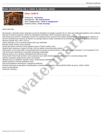 Informacje o produkcie Utworzono 07-03-2017 Kelo (skontaktuj się z nami w sprawie ceny) Cena : 0,00 zł Producent : Saunalux Dostępność : Na zamówienie Stan magazynowy : brak w magazynie Średnia ocena : brak recenzji Sauna dom Kelo. w at er m ar k Na zewnątrz i wewnątrz ściany wykonane są ręcznie obrabiane na okrągłe o grubości 25 cm. Kelo jest rzadkie i szczególnie cenny materiał. Kelo jest to drewno uzyskane z warkocza (najczęściej sosnowego), które ma patyna srebro-szary. Kelo drewno jest setki lat i następujący wzrost Truk, powolny proces suszenia trwa kolejne kilkadziesiąt lat. Jego właściwości odporne na warunki atmosferyczne oznacza, że drewna nie wymaga żadnych boazeri wewnętrzne lub zewnętrzne, ani żadnych środków ochronnchi. Wymiary SxGxW: 407 x 445 x 276 cm Ściany wykonane z 25 cm grubości kabiny Kelo Log, handmade Kelo jest rzadki i bardzo cenny materiał W Kelo jest stałym martwych drzew (głównie sosny) z Patyna srebrny szary Wnętrze Dach wykonany z desek 2cm Kelo, 100 mm izolacji mineralnej wełny skalnej Siding dachu 10 mm płyty OSB z 2-warstwowej bitumicznej pad ze wzmocnieniem z włókna szklanego o grubości 7,5 mm grubości 6 mm mat ochronnych wykonanych z granulatu gumowego związanego Odkryty edycja 2-4 cm grubości wielokątne Alta kwarcytu szary Sauna Drzwi: Pełne Drzwi przednie i okna wykonane są ze szkła hartowanego o grubości 10 mm z przezroczystego szkła systemy sprzętowe nadają się do użytku na zewnątrz Wnętrze sauny ze stabilnych banków z Aspe i nowoczesnym oświetleniem System grzewczy: Firetube woodstove Suuri Dwa Feuerungstüren wewnętrzne i zewnętrzne widoczne Firetube piece koza są specjalnie zmodyfikowane i przetestowane zgodnie z normą DIN EN 15821 do sauny, 13240 i 13229 Sauna na zamówienie Producent: Saunalux Wygenerowano w programie www.oscGold.com