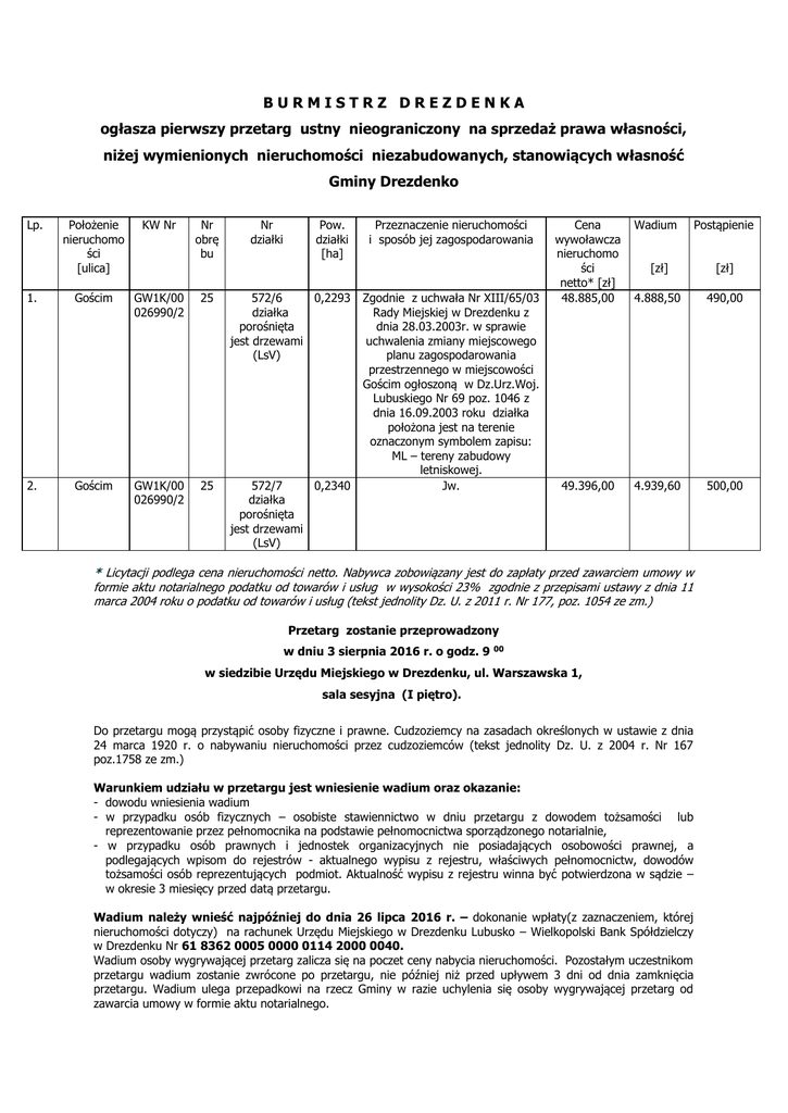 BURMISTRZ DREZDENKA ogłasza pierwszy przetarg ustny nieograniczony na sprzedaż prawa własności, niżej wymienionych nieruchomości niezabudowanych, stanowiących własność Gminy Drezdenko Lp. Położenie nieruchomo ści [ulica] KW Nr Nr obrę bu Nr działki Pow. działki [ha] 1. Gościm GW1K/00 026990/2 25 572/6 0,2293 działka porośnięta jest drzewami (LsV) 2. Gościm GW1K/00 026990/2 25 572/7 0,2340 działka porośnięta jest drzewami (LsV) Przeznaczenie nieruchomości i sposób jej zagospodarowania Zgodnie z uchwała Nr XIII/65/03 Rady Miejskiej w Drezdenku z dnia 28.03.2003r. w sprawie uchwalenia zmiany miejscowego planu zagospodarowania przestrzennego w miejscowości Gościm ogłoszoną w Dz.Urz.Woj. Lubuskiego Nr 69 poz. 1046 z dnia 16.09.2003 roku działka położona jest na terenie oznaczonym symbolem zapisu: ML – tereny zabudowy letniskowej. Jw. Cena wywoławcza nieruchomo ści netto* [zł] 48.885,00 Wadium 49.396,00 [zł] [zł] 4.888,50 490,00 4.939,60 500,00 * Licytacji podlega cena nieruchomości netto. Nabywca zobowiązany jest do zapłaty przed zawarciem umowy w formie aktu notarialnego podatku od towarów i usług w wysokości 23% zgodnie z przepisami ustawy z dnia 11 marca 2004 roku o podatku od towarów i usług (tekst jednolity Dz. U. z 2011 r. Nr 177, poz. 1054 ze zm.) Przetarg zostanie przeprowadzony w dniu 3 sierpnia 2016 r. o godz. 9 Postąpienie 00 w siedzibie Urzędu Miejskiego w Drezdenku, ul. Warszawska 1, sala sesyjna (I piętro). Do przetargu mogą przystąpić osoby fizyczne i prawne. Cudzoziemcy na zasadach określonych w ustawie z dnia 24 marca 1920 r. o nabywaniu nieruchomości przez cudzoziemców (tekst jednolity Dz. U. z 2004 r. Nr 167 poz.1758 ze zm.) Warunkiem udziału w przetargu jest wniesienie wadium oraz okazanie: - dowodu wniesienia wadium - w przypadku osób fizycznych – osobiste stawiennictwo w dniu przetargu z dowodem tożsamości lub reprezentowanie przez pełnomocnika na podstawie pełnomocnictwa sporządzonego notarialnie, - w przypadku osób prawnych i jednostek organizacyjnych nie posiadających osobowości prawnej, a podlegających wpisom do rejestrów - aktualnego wypisu z rejestru, właściwych pełnomocnictw, dowodów tożsamości osób reprezentujących podmiot. Aktualność wypisu z rejestru winna być potwierdzona w sądzie – w okresie 3 miesięcy przed datą przetargu. Wadium należy wnieść najpóźniej do dnia 26 lipca 2016 r. – dokonanie wpłaty(z zaznaczeniem, której nieruchomości dotyczy) na rachunek Urzędu Miejskiego w Drezdenku Lubusko – Wielkopolski Bank Spółdzielczy w Drezdenku Nr 61 8362 0005 0000 0114 2000 0040. Wadium osoby wygrywającej przetarg zalicza się na poczet ceny nabycia nieruchomości. Pozostałym uczestnikom przetargu wadium zostanie zwrócone po przetargu, nie później niż przed upływem 3 dni od dnia zamknięcia przetargu. Wadium ulega przepadkowi na rzecz Gminy w razie uchylenia się osoby wygrywającej przetarg od zawarcia umowy w formie aktu notarialnego. INFORMACJE DODATKOWE 1) 2) 3) 4) 5) 6) 7) 8) 9) Cena nieruchomości gruntowej osiągnięta w przetargu, powiększona o podatek od towarów i usług płatna jest jednorazowo przed zawarciem umowy w formie aktu notarialnego. Nieruchomości położone w Gościmiu opisane w poz. 1-2 tabeli znajdują się w obszarze objętym miejscowym planem zagospodarowania przestrzennego. Zgodnie z uchwała Nr VIII/65/03 Rady Miejskiej w Drezdenku z dnia 28.03.2003 roku w sprawie uchwalenia zmiany miejscowego planu zagospodarowania przestrzennego w miejscowości Gościm ogłoszoną w Dz. Urz. Woj. Lubuskiego Nr 69 poz. 1046 z dnia 16.09.2003r. działki położone są na terenie oznaczonym symbolem zapisu: ML- tereny zabudowy letniskowej. Nieruchomości są wolne od jakichkolwiek obciążeń. Termin do złożenia wniosku przez osoby, którym przysługuje pierwszeństwo w nabyciu nieruchomości na podstawie art. 34 ust.1 pkt 1 i 2 ustawy o gospodarce nieruchomościami upłynął dla nieruchomości opisanych w powyższej tabeli : poz. 1 do 2 – 17.05.2016 r. Opłaty notarialne i sądowe związane z zawarciem umowy w formie aktu notarialnego oraz założeniem i wpisem do księgi wieczystej, koszty związane z okazaniem granic w całości ponosi nabywca nieruchomości. Burmistrz Drezdenka stosownie do art. 41 ust. 1 ustawy z dnia 21 sierpnia 1997 r. o gospodarce nieruchomościami (tekst jednolity Dz. U. z 2015 r. poz. 1774 ze zm.) obowiązany jest w terminie 21 dni od dnia rozstrzygnięcia przetargu, zawiadomić osobę ustaloną jako nabywca nieruchomości o miejscu i terminie zawarcia umowy w formie aktu notarialnego. O miejscu i terminie zawarcia umowy w formie aktu notarialnego nabywca zostanie powiadomiony odrębnym pismem. Jeżeli osoba ustalona jako nabywca nieruchomości nie przystąpi bez usprawiedliwienia do zawarcia umowy w miejscu i terminie podanym w zawiadomieniu, Burmistrz Drezdenka może odstąpić od zawarcia umowy, a wpłacone wadium nie podlega zwrotowi. Z dniem podpisania umowy w formie aktu notarialnego na nabywcę przechodzą wszelkie ciężary i korzyści związane z nieruchomością. Nabywca nieruchomości zobowiązany jest przed rozpoczęciem inwestycji dokonać wyłączenia gruntów z produkcji leśnej i uiścić stosowne opłaty. Przed przystąpieniem do przetargu należy zapoznać się z warunkami przetargu Informacje można uzyskać w Urzędzie Miejskim w Drezdenku, w Referacie Gospodarki Nieruchomościami i Rolnictwa pok. Nr 12 tel. 95 762 29 68. Ogłoszenia o przetargu zostaną wywieszone na tablicy ogłoszeń w siedzibie Urzędu Miejskiego w Drezdenku oraz na stronie internetowej Urzędu i na stronie www.bip.drezdenko.pl, w miejscowości gdzie położona jest nieruchomość. Zastrzega się prawo odwołania przetargu w przypadku zaistnienia uzasadnionych przyczyn. Burmistrz /-/ Maciej Pietruszak