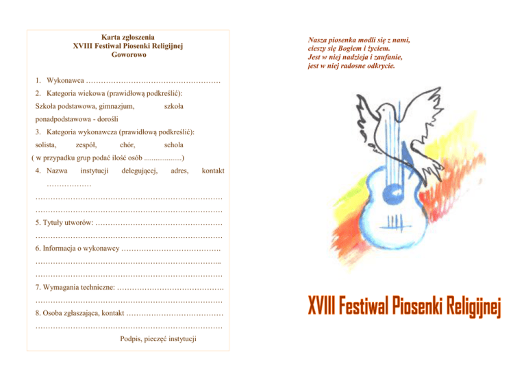 Karta zgłoszenia XVIII Festiwal Piosenki Religijnej Goworowo Nasza piosenka modli się z nami, cieszy się Bogiem i życiem. Jest w niej nadzieja i zaufanie, jest w niej radosne odkrycie. 1. Wykonawca ……………………………………………… 2. Kategoria wiekowa (prawidłową podkreślić): Szkoła podstawowa, gimnazjum, szkoła ponadpodstawowa - dorośli 3. Kategoria wykonawcza (prawidłową podkreślić): solista, zespół, chór, schola ( w przypadku grup podać ilość osób ....................) 4. Nazwa instytucji delegującej, adres, kontakt ……………… ………………………………………………………………… ………………………………………………………………… 5. Tytuły utworów: …………………………………………… ………………………………………………………………… 6. Informacja o wykonawcy …………………………………. ………………………………………………………………... ………………………………………………………………… 7. Wymagania techniczne: ……………………………………. ………………………………………………………………… 8. Osoba zgłaszająca, kontakt ………………………………… ………………………………………………………………… Podpis, pieczęć instytucji ………………………….