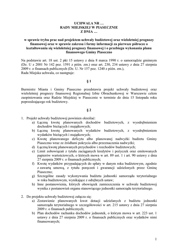 UCHWAŁA NR … RADY MIEJSKIEJ W PIASECZNIE Z DNIA … w sprawie trybu prac nad projektem uchwały budżetowej oraz wieloletniej prognozy finansowej oraz w sprawie zakresu i formy informacji za pierwsze półrocze o kształtowaniu się wieloletniej prognozy finansowej i o przebiegu wykonania planu finansowego Gminy Piaseczno Na podstawie art. 18 ust. 2 pkt 15 ustawy z dnia 8 marca 1990 r. o samorządzie gminnym (Dz. U z 2001 Nr 142 poz. 1591 z późn. zm.) oraz art. 230, 234 ustawy z dnia 27 sierpnia 2009 r. o finansach publicznych (Dz. U. Nr 157 poz. 1240 z późn. zm.), Rada Miejska uchwala, co następuje: §1 Burmistrz Miasta i Gminy Piaseczno przedstawia projekt uchwały budżetowej oraz wieloletniej prognozy finansowej Regionalnej Izbie Obrachunkowej w Warszawie celem zaopiniowania oraz Radzie Miejskiej w Piasecznie w terminie do dnia 15 listopada roku poprzedzającego rok budżetowy. §2 1. Projekt uchwały budżetowej powinien określać: a) Łączną kwotę planowanych dochodów budżetowych, z wyodrębnieniem dochodów bieżących i majątkowych; b) Łączną kwotę planowanych wydatków budżetowych, z wyodrębnieniem wydatków bieżących i majątkowych; c) Kwotę planowanego deficytu albo planowanej nadwyżki budżetu Gminy Piaseczno wraz ze źródłami pokrycia albo przeznaczenia nadwyżki; d) Łączną kwotę planowanych przychodów i rozchodów budżetowych; e) Limit zobowiązań z tytułu zaciąganych kredytów i pożyczek oraz emitowanych papierów wartościowych, o których mowa w art. 89 ust. 1 i art. 90 ustawy z dnia 27 sierpnia 2009 r. o finansach publicznych; f) Kwotę wydatków przypadających do spłaty w danym roku budżetowym, zgodnie z zawartą umową, z tytułu poręczeń i gwarancji udzielonych przez Gminę Piaseczno; g) Szczególne zasady wykonywania budżetu jednostki samorządu terytorialnego w roku budżetowym, wynikające z odrębnych ustaw; h) Inne postanowienia, których obowiązek zamieszczenia w uchwale budżetowej wynika z postanowień organu stanowiącego jednostki samorządu terytorialnego. 2. Do projektu uchwały budżetowej załącza się: a) Zestawienie planowanych kwot dotacji udzielanych z budżetu jednostki samorządu terytorialnego w szczegółowości w art. 215 ustawy z dnia 27 sierpnia 2009 r. o finansach publicznych; b) Plan dochodów rachunku dochodów jednostek, o którym mowa w art. 223 ust. 1 ustawy z dnia 27 sierpnia 2009 r. o finansach publicznych oraz wydatków nimi finansowanych; 1 3. Do projektu uchwały budżetowej dołącza się zestawienie tabelaryczne obejmujące: a) Dochody i wydatki budżetowe; b) Przychody i rozchody budżetowe; c) Dochody i wydatki związane ze szczególnymi zasadami wykonywania budżetu jednostki samorządu terytorialnego w roku budżetowym, wynikającymi z odrębnych ustaw; d) Dochody i wydatki związane z realizacją zadań z zakresu administracji rządowej i innych zadań zleconych odrębnymi ustawami; e) Dochody i wydatki związane z realizacją zadań na mocy porozumień z organami administracji rządowej; f) Dochody i wydatki związane z realizacją zadań wykonywanych w drodze umów lub porozumień między jednostkami samorządu terytorialnego; w szczegółowości zgodnej z art., 235 i 236 ustawy z dnia 27 sierpnia 2009 r. o finansach publicznych; 4. Projekt budżetu oraz wieloletniej prognozy finansowej burmistrz podaje do publicznej wiadomości poprzez wyłożenie w Biurze Rady Miejskiej, o czym informuje się mieszkańców na stronie internetowej. 5. W terminie 7 dni od daty przekazania projektu budżetu oraz wieloletniej prognozy finansowej Radzie Miejskiej, Burmistrz przekazuje podległym jednostkom informację niezbędne do opracowania ich planów finansowych. 6. Burmistrz Miasta i Gminy Piaseczno przedstawia wraz z projektem uchwały budżetowej projekt planu wydatków budżetowych w ujęciu zadaniowym. 7. Radni Rady Miejskiej w Piasecznie i komisje problemowe zgłaszają wnioski dotyczące budżetu oraz wieloletniej prognozy finansowej do dnia 15 września. §3 1. Przewodniczący rady miejskiej po otrzymaniu projektu budżetu oraz wieloletniej prognozy finansowej wraz z materiałami informacyjnymi, niezwłocznie przesyła go członkom stałych komisji rady do zaopiniowania. 2. Komisje rady w terminie do 21 dni odbywają posiedzenia i przekazują na piśmie swoje opinie i wnioski do komisji finansów rady, najpóźniej w ciągu 2 dni od dnia posiedzenia komisji. 3. W przypadku zgłoszenia propozycji wprowadzenia do budżetu nowego wydatku lub zwiększenia wydatku przewidzianego w projekcie, istnieje obowiązek wskazania przez komisję źródła jego finansowania. 4. Komisja finansów w terminie do 7 dni od daty otrzymania wniosków i opinii stałych komisji rady rozpatruje je i formułuje ostateczną opinię o projekcie budżetu. §4 1. Niezwłocznie, najpóźniej następnego dnia po sporządzeniu przez komisję finansów opinii na piśmie, jest ona przekazywana Burmistrzowi. 2 §5 Przy sporządzaniu projektu porządku obrad sesji rady miejskiej, na której rozpatrywany będzie projekt budżetu, powinny być uwzględnione następujące punkty: 1) 2) 3) 4) odczytanie projektu uchwały budżetowej wraz z uzasadnieniem, odczytanie opinii i wniosków komisji finansów i inwestycji, odczytanie opinii Regionalnej Izby Obrachunkowej w Warszawie, dyskusja oraz głosowanie nad projektem uchwały budżetowej. §6 1. Rada miejska uchwala budżet do dnia 31 grudnia roku poprzedzającego rok budżetowy. 2. W przypadku nie uchwalenia budżetu przez radę do końca roku poprzedzającego rok budżetowy w szczególnie uzasadnionych przypadkach, przedstawiony przez burmistrza projekt budżetu stanowi podstawę gospodarki budżetowej na okres nie dłuższy niż do 31 stycznia roku budżetowego. 3. W sytuacji określonej w ust. 2 nie mogą być realizowane wydatki dotyczące nowo rozpoczynanych zadań inwestycyjnych, które negatywnie zaopiniowała komisja finansów. 4. Dokonywanie zmian w budżecie w ciągu 