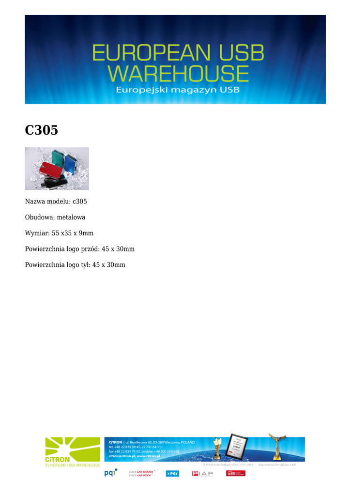 C305 Nazwa modelu: c305 Obudowa: metalowa Wymiar: 55 x35 x 9mm Powierzchnia logo przód: 45 x 30mm Powierzchnia logo tył: 45 x 30mm