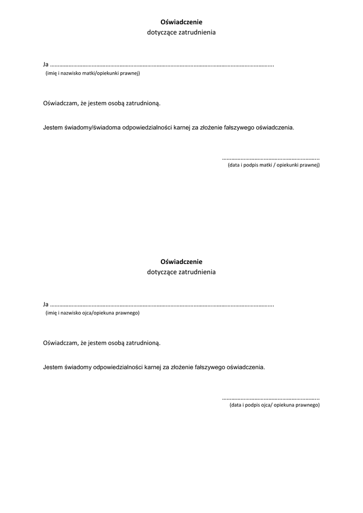Oświadczenie dotyczące zatrudnienia Ja ………………………………………………………………………………………………………………………………. (imię i nazwisko matki/opiekunki prawnej) Oświadczam, że jestem osobą zatrudnioną. Jestem świadomy/świadoma odpowiedzialności karnej za złożenie fałszywego oświadczenia. ……………………………………………………... (data i podpis matki / opiekunki prawnej) Oświadczenie dotyczące zatrudnienia Ja ………………………………………………………………………………………………………………………………. (imię i nazwisko ojca/opiekuna prawnego) Oświadczam, że jestem osobą zatrudnioną. Jestem świadomy odpowiedzialności karnej za złożenie fałszywego oświadczenia. ……………………………………………………... (data i podpis ojca/ opiekuna prawnego)