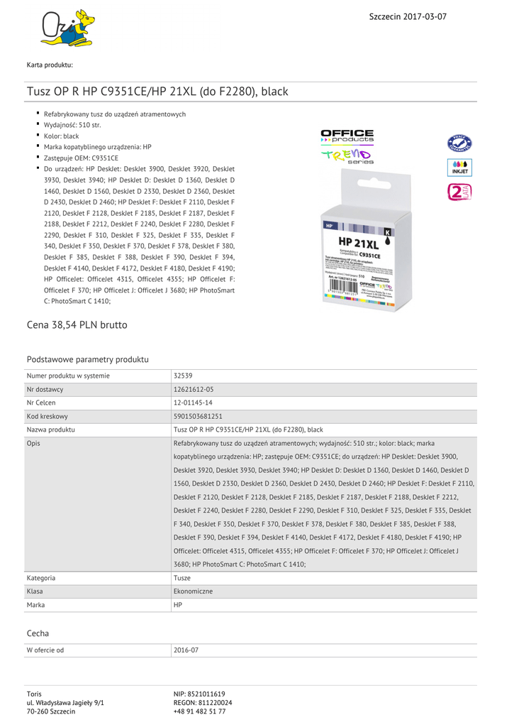 Szczecin 2017-03-07 Karta produktu: Tusz OP R HP C9351CE/HP 21XL (do F2280), black Refabrykowany tusz do uządzeń atramentowych Wydajność: 510 str. Kolor: black Marka kopatyblinego urządzenia: HP Zastępuje OEM: C9351CE Do urządzeń: HP DeskJet: DeskJet 3900, DeskJet 3920, DeskJet 3930, DeskJet 3940; HP DeskJet D: DeskJet D 1360, DeskJet D 1460, DeskJet D 1560, DeskJet D 2330, DeskJet D 2360, DeskJet D 2430, DeskJet D 2460; HP DeskJet F: DeskJet F 2110, DeskJet F 2120, DeskJet F 2128, DeskJet F 2185, DeskJet F 2187, DeskJet F 2188, DeskJet F 2212, DeskJet F 2240, DeskJet F 2280, DeskJet F 2290, DeskJet F 310, DeskJet F 325, DeskJet F 335, DeskJet F 340, DeskJet F 350, DeskJet F 370, DeskJet F 378, DeskJet F 380, DeskJet F 385, DeskJet F 388, DeskJet F 390, DeskJet F 394, DeskJet F 4140, DeskJet F 4172, DeskJet F 4180, DeskJet F 4190; HP OfficeJet: OfficeJet 4315, OfficeJet 4355; HP OfficeJet F: OfficeJet F 370; HP OfficeJet J: OfficeJet J 3680; HP PhotoSmart C: PhotoSmart C 1410; Cena 38,54 PLN brutto Podstawowe parametry produktu Numer produktu w systemie 32539 Nr dostawcy 12621612-05 Nr Celcen 12-01145-14 Kod kreskowy 5901503681251 Nazwa produktu Tusz OP R HP C9351CE/HP 21XL (do F2280), black Opis Refabrykowany tusz do uządzeń atramentowych; wydajność: 510 str.; kolor: black; marka kopatyblinego urządzenia: HP; zastępuje OEM: C9351CE; do urządzeń: HP DeskJet: DeskJet 3900, DeskJet 3920, DeskJet 3930, DeskJet 3940; HP DeskJet D: DeskJet D 1360, DeskJet D 1460, DeskJet D 1560, DeskJet D 2330, DeskJet D 2360, DeskJet D 2430, DeskJet D 2460; HP DeskJet F: DeskJet F 2110, DeskJet F 2120, DeskJet F 2128, DeskJet F 2185, DeskJet F 2187, DeskJet F 2188, DeskJet F 2212, DeskJet F 2240, DeskJet F 2280, DeskJet F 2290, DeskJet F 310, DeskJet F 325, DeskJet F 335, DeskJet F 340, DeskJet F 350, DeskJet F 370, DeskJet F 378, DeskJet F 380, DeskJet F 385, DeskJet F 388, DeskJet F 390, DeskJet F 394, DeskJet F 4140, DeskJet F 4172, DeskJet F 4180, DeskJet F 4190; HP OfficeJet: OfficeJet 4315, OfficeJet 4355; HP OfficeJet F: OfficeJet F 370; HP OfficeJet J: OfficeJet J 3680; HP PhotoSmart C: PhotoSmart C 1410; Kategoria Tusze Klasa Ekonomiczne Marka HP Cecha W ofercie od 2016-07 Toris ul. Władysława Jagieły 9/1 70-260 Szczecin NIP: 8521011619 REGON: 811220024 +48 91 482 51 77 Szczecin 2017-03-07 Karta katalogowa produktu cd. Tusz OP R HP C9351CE/HP 21XL (do F2280), black Produkt HP Typ Refabrykowany Wspólny słownik zamówień CPV 30192113-6 Wkłady drukujące Kolor Kolor Black Certyfikaty Nowy produkt w ofercie Standard Hit Standard Zastosowanie Zastosowanie Do urządzeń atramentowych Serdecznie zapraszamy do współpracy Toris zespół. Toris ul. Władysława Jagieły 9/1 70-260 Szczecin NIP: 8521011619 REGON: 811220024 +48 91 482 51 77