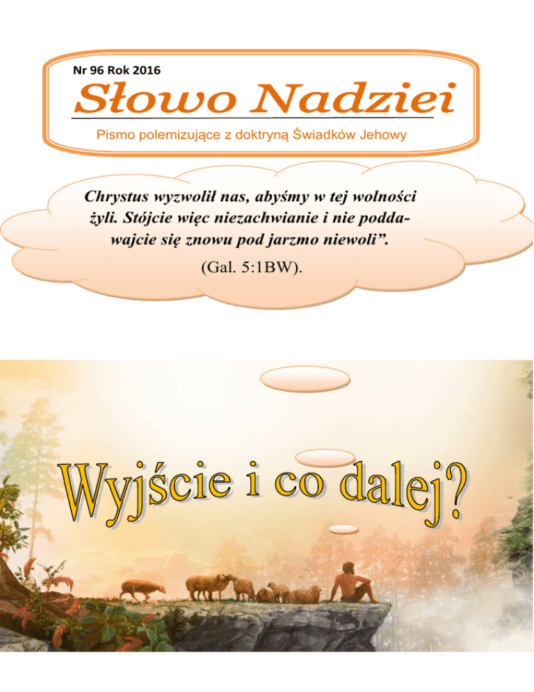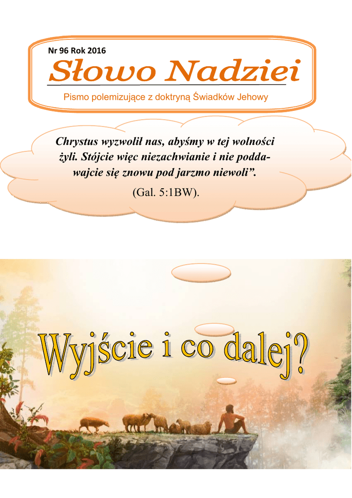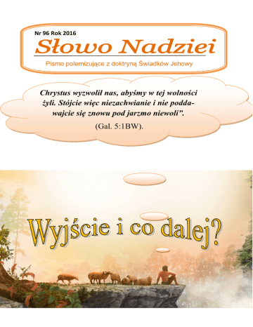 Nr 96 Rok 2016 Pismo polemizujące z doktryną Świadków Jehowy Chrystus wyzwolił nas, abyśmy w tej wolności żyli. Stójcie więc niezachwianie i nie poddawajcie się znowu pod jarzmo niewoli”. (Gal. 5:1BW). Fundacja Słowo Nadziei NR 96 ROK 2016 1 Co niektórych tak do nich ciągnie? Głównymi potencjalnymi ofiarami nauk Świadków Jehowy są Katolicy. Na pierwszych spotkaniach zadają im proste pytania takie jak: Czy chrześcijanie powinni prowadzić wojny między sobą? Po drugie: skoro Biblia zakazuje czczenia różnych obrazów i figur, dlaczego kościoły je czczą, oraz modlą się do ludzi, których sami ogłosili świętymi? Czy powinni modlić się za zamarłych niejako przekupywać Boga za ich grzechy? Choć większość tych ludzi nie zna Biblii, kierując się sumieniem poprawnie, czyli biblijnie odpowiada na te pytania (Rzym 2:14-16). Nigdy nie planowali zostać Świadkami, ale zaczęli szukać odpowiedzi na nurtujące ich pytania, ale nie otrzymali ich od duchownych, ani przyjaciół. Pamiętam, jak niektórzy czekali na kolendę i zapraszali nas, bo chcieli zobaczyć jak będzie wyglądać konfrontacja między księdzem a świadkami. Księża z reguły reagowali bardzo agresywnie i opuszczali dany dom. Pamiętam jak młody ksiądz podjął się tego tematu, i zaczął się z nami spotykać, ale po dwóch miesiącach przenieśli go do innej parafii. Marcina ksiądz najprawdopodobniej z powodu niedostatecznej wiedzy zachęcił do odmawiania różańca, zamiast dać mu dowody z Biblii aby obalić nauki świadków. Szukał pomocy, ale od wszystkich dostawał tę samą radę: daj sobie z nimi spokój – to sekta. Ale on walcząc z nimi opierał się na katechizmie, a nie na Biblii, dlatego poległ, ponieważ wtedy o tym nie wiedział. Świadkowie go nie wyśmiali, ale katolickie dogmaty jeden po drugim obali Biblią. Marcin wtedy nie wiedział, że Biblia mówi o dwóch Zakonach – Zakonie Mojżeszowym i Zakonie łaski. (Jer. 31: 31-34). Zakon Mojżeszowy był dany Żydom i został zniesiony podczas Ostatniej Wieczerzy, kiedy Pan Jezus zawarł Nowe Przymierze z apostołami. (Mat. 26: 2-29) i z wszystkimi, którzy uwierzą w Chrystusa (Dzieje Ap. 2:39). Niewolnik wierny i rozumny Przekonywali go, że Jezus w 1914 roku ustanowił niewolnika o którym czytamy: „Kto rzeczywiście jest niewolnikiem wiernym i roztropnym, którego pan ustanowił nad członkami czeladzi swojej, aby im dawał pokarm we właściwym czasie? Szczęśliwy ów niewolnik, jeśli jego pan, przybywszy, zastanie go tak czyniącego! Zaprawdę wam mówię: Ustanowi go nad całym swoim mieniem”. (Mat. 24:4547PNś). Ale Marcin nie znał na tyle Biblii, aby ich przekonać, że Pan Jezus nie ustanowił niewolnika, ale: „jednych apostołami, drugich prorokami, innych ewangelistami, a innych pasterzami i nauczycielami, aby przygotować świętych do dzieła posługiwania, do budowania ciała Chrystusowego”. (Efez. 4:11,12 BW). Wtedy nie wiedział, że ich niewolnik wyrywa teksty z kontekstu, oraz miesza Zakon Mojżeszowy z Zakonem łaski i wyprowadza Pan Jezus w przypowieści o dobrym i złym niewolniku mówił o swym powtórnym przyjściu. Kiedy przeczytamy Mat. 24:45-51 to ów niewolnik i rok 1914 ginie. Głosiciele Fundacja Słowo Nadziei NR 96 ROK 2016 2 jak i nowo zainteresowani nie są świadomi, że są manipulowani, dlatego te kłamstwa powielają. Głosząc te teorie, które niewolnik nazwał ‘prawda’ zrywają tym samym stare znajomości, a kiedy zaczynają zauważać, że wiele nauk Strażnicy przeczy Biblii, nie mają do kogo wrócić, bojąc się ośmieszenia. Pan Jezus do swoich uczniów nie powiedział że od 1914 roku, ale od chwili wniebowstąpienia jest ze swoimi naśladowcami: „Bo gdzie są dwaj albo trzej zebrani w imię moje, tam jestem pośród nich”. (Mat. 18:20 BT). „Jeśli kto Mnie miłuje, będzie przestrzegał mojej nauki. A Ojciec mój umiłuje go i przyjdziemy do niego i będziemy mieszkać u niego”. (Jan 14:23BP). Trwanie w Słowie Chrystusa, a nie niewolnika daje życie wieczne: „Jeżeli trwacie przy mojej nauce, jesteście naprawdę moimi uczniami. I poznacie prawdę, a prawda was wyzwoli”. (Jan 8:31,32BP). „Odpowiedział Mu Szymon Piotr: «Panie, do kogóż pójdziemy? Ty masz słowa życia wiecznego"( Jan 6:68 BT ). Żaden nowicjusz nie jest świadomy tego, że ‘niewolnik Strażnicy’ nie toleruje żadnych prywatnych wykładni. Podkreśla to w każdej publikacji. Takiego nauczania nie znajdziemy w Nowym Przymierzu gdzie czytamy: „Nikt już nie będzie pouczał swojego rodaka ani swego brata, mówiąc: Poznaj Pana! Albowiem wszyscy będą mnie znali, od najmłodszego do najstarszego”. (Hebr. 8:10-11BP). Pan Jezus zapowiedział, że Duch Święty, a nie niewolnik Strażnicy, czy inni ‘nauczyciele będą uczyć wiernych: „A kiedy On, Duch prawdy przyjdzie, będzie waszym przewodnikiem w drodze do pełnej prawdy. Nie będzie bowiem mówił od siebie, ale powie, co usłyszy, i oznajmi wam to, co ma nastąpić”. (Jan 16:13). Pierwsze pytania Marcin podczas głoszenia od domu do domu spotykał ludzi, którzy byli zainteresowani naukami świadków, ale od nich odeszli. Dobrze pamiętają co im głosili. Marcin nie zauważył u nich nienawiści do świadków, tak jak to czytał w Strażnicy, raczej smutek, że niewolnik nie opamiętał się, i nadal oszukuje ludzi. Zaczął przesiadywać w Zborowej biblioteczce, któregoś razu jeden starszy zapytał go, czego szuka? Odpowiedział, że wcześniejszych nauk głoszonych przez niewolnika. Ale ten straszy, odpowiedział mu zgodnie z wytycznymi niewolnika, aby dał sobie z tym spokój i przyjmował nowe światło. Ale to jeszcze bardziej nie dawało mu spokoju, bo przecież światło Słowa Bożego nie ulega zmianom ,,Niebo i ziemia przeminą, ale moje słowa nie przeminą" (Łuk 21:33 BP). Poszuki- wanie to przekonało go, że ci ludzie mówili prawdę o roku 1975, czy o Pokoleniu roku 1914, które ni