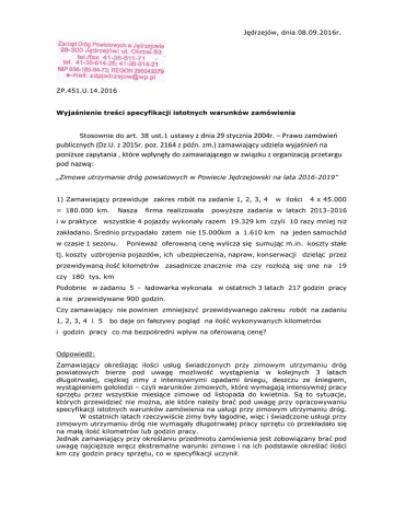 Jędrzejów, dnia 08.09.2016r. ZP.451.U.14.2016 Wyjaśnienie treści specyfikacji istotnych warunków zamówienia Stosownie do art. 38 ust.1 ustawy z dnia 29 stycznia 2004r. – Prawo zamówień publicznych (Dz.U. z 2015r. poz. 2164 z późn. zm.) zamawiający udziela wyjaśnień na poniższe zapytania , które wpłynęły do zamawiającego w związku z organizacją przetargu pod nazwą: „Zimowe utrzymanie dróg powiatowych w Powiecie Jędrzejowski na lata 2016-2019” 1) Zamawiający przewiduje zakres robót na zadanie 1, 2, 3, 4 = 180.000 km. Nasza firma realizowała w ilości 4 x 45.000 powyższe zadania w latach 2013-2016 i w praktyce wszystkie 4 pojazdy wykonały razem 19.329 km czyli 10 razy mniej niż zakładano. Średnio przypadało zatem nie 15.000km a 1.610 km na jeden samochód w czasie 1 sezonu. Ponieważ oferowaną cenę wylicza się sumując m.in. koszty stałe tj. koszty uzbrojenia pojazdów, ich ubezpieczenia, napraw, konserwacji dzieląc przez przewidywaną ilość kilometrów zasadnicze znacznie ma czy rozłożą się one na 19 czy 180 tys. km Podobnie w zadaniu 5 - ładowarka wykonała w ostatnich 3 latach 217 godzin pracy a nie przewidywane 900 godzin. Czy zamawiający nie powinien zmniejszyć przewidywanego zakresu robót na zadaniu 1, 2, 3, 4 i 5 bo daje on fałszywy pogląd na ilość wykonywanych kilometrów i godzin pracy co ma bezpośredni wpływ na oferowaną cenę? Odpowiedź: Zamawiający określając ilości usług świadczonych przy zimowym utrzymaniu dróg powiatowych bierze pod uwagę możliwość wystąpienia w kolejnych 3 latach długotrwałej, ciężkiej zimy z intensywnymi opadami śniegu, deszczu ze śniegiem, wystąpieniem gołoledzi – czyli warunków zimowych, które wymagają intensywnej pracy sprzętu przez wszystkie miesiące zimowe od listopada do kwietnia. Są to sytuacje, których przewidzieć nie można, ale które należy brać pod uwagę przy opracowywaniu specyfikacji istotnych warunków zamówienia na usługi przy zimowym utrzymaniu dróg. W ostatnich latach rzeczywiście zimy były łagodne, więc i świadczone usługi przy zimowym utrzymaniu dróg nie wymagały długotrwałej pracy sprzętu co przekładało się na małą ilość kilometrów lub godzin pracy. Jednak zamawiający przy określaniu przedmiotu zamówienia jest zobowiązany brać pod uwagę najcięższe wręcz ekstremalne warunki zimowe i na ich podstawie określać ilości km czy godzin pracy sprzętu, co w specyfikacji uczynił. 2) Jednym z warunków udziału w postępowaniu jest zatrudnienie na podstawie umowy o pracę osób wykonujących zamówienie. Zgodnie z danymi powyżej jeden kierowca przejechał średnio 1610 km na sezon czyli około 268 km miesięcznie. Na jaką część etatu należy zatrudnić kierowcę ? naszych wyliczeń Wg na 0,05 etatu. Czy w związku z tym Zamawiający zamierza wprowadzić wynagrodzenie ryczałtowe za gotowość do pracy od 1listopada do 30 kwietnia (tj, okres 6 m-cy)? Jeśli nie, wymóg zatrudnienia na umowę o pracę, gdy tej pracy jest kilka godzin w m-cu wydaje się absurdalny. Odpowiedź: Informujemy, że warunki udziału w postępowaniu zostały określone w Rozdziale 7 specyfikacji i żaden z nich nie dotyczy zatrudnienia na podstawie umowy o pracę osób wykonujących zamówienie. Wymóg zatrudnienia przez wykonawcę lub podwykonawcę na podstawie umowy o pracę osób wykonujących wskazane przez zamawiającego czynności w zakresie realizacji zamówienia, został narzucony zamawiającemu przez ustawodawcę jako obowiązek do stosowania zgodnie z art. 29, ust. 3a ustawy z dnia 29 stycznia 2004r. – Prawo zamówień publicznych (Dz.U. z 2015r. poz. 2164 z późn. zm.).