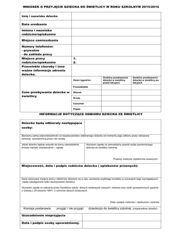 WNIOSEK O PRZYJĘCIE DZIECKA DO ŚWIETLICY W ROKU SZKOLNYM 2015/2016 Imię i nazwisko dziecka Data urodzenia Imiona i nazwiska rodziców/opiekunów Miejsce zamieszkania Numery telefonów: - prywatne - do zakładu pracy Miejsce pracy rodziców/opiekunów Przewlekłe choroby i inne ważne informacje zdrowiu dziecka. 1. 2. Dzień tygodnia Godziny przebywania dziecka w świetlicy przed lekcjami Godziny przebywania dziecka w świetlicy po lekcjach Poniedziałek Czas przebywania dziecka w świetlicy Wtorek Środa Czwartek Piątek INFORMACJE DOTYCZĄCE ODBIORU DZIECKA ZE ŚWIETLICY Dziecko będą odbierały następujące osoby: Bierzemy pełną odpowiedzialność za bezpieczeństwo odebranego dziecka od momentu jego odbioru przez wskazana powyżej, upoważnioną przez nas osobę. Jeżeli dziecko będzie wracało do domu samodzielnie proszę napisać oświadczenie – zgodę: Wyrażam zgodę na samodzielny powrót wyżej wymienionego dziecka ze świetlicy szkolnej. Podpisy rodziców (opiekunów prawnych) Miejscowość, data i podpis rodziców dziecka ( opiekunów prawnych): Dane dotyczące miejsca pracy i telefonów zbierane są w celu uzyskania szybkiego kontaktu w sytuacjach tego wymagających i będą udostępnione tylko nauczycielom świetlicy. Wyrażam zgodę na zebranie przez Dyrektora szkoły danych osobowych naszych i dziecka oraz osób upoważnionych zgodnie z ustawą z 29 sierpnia 1997r. o ochronie danych osobowych. Data i podpis rodziców ( opiekunów ) dziecka Komisja postanawia przyjąć / nie przyjąć Uzasadnienie nieprzyjęcia Data i podpis osoby upoważnionej. dziecko(a) do świetlicy szkolnej. (niepotrzebne skreślić)