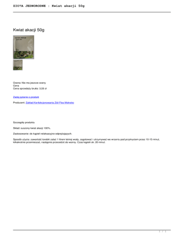 ZIO?A JEDNORODNE : Kwiat akacji 50g Kwiat akacji 50g Ocena: Nie ma jeszcze oceny Cena Cena sprzedaży brutto: 3,50 zł Zadaj pytanie o produkt Producent: Zakład Konfekcjonowania Ziół Flos Mokrsko Szczegóły produktu Skład: suszony kwiat akacji 100%. Zastosowanie: do kąpieli relaksacyjno-odprężających. Sposób użycia: zawartość torebki zalać 1 litrem letniej wody, zagotować i utrzymywać we wrzeniu pod przykryciem przez 10-15 minut, kilkakrotnie przemieszać, następnie przecedzić do wanny. Czas kąpieli ok. 20 minut. 1 / 1 Powered by TCPDF (www.tcpdf.org)