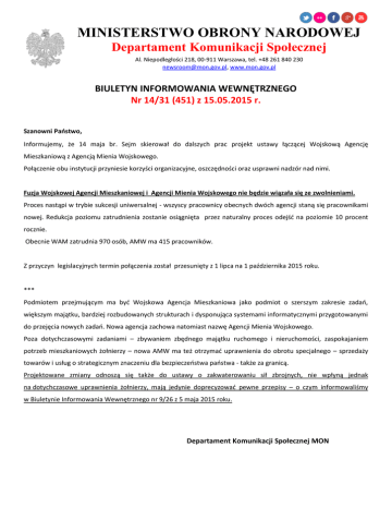 MINISTERSTWO OBRONY NARODOWEJ Departament Komunikacji Społecznej Al. Niepodległości 218, 00-911 Warszawa, tel. +48 261 840 230 [email protected], www.mon.gov.pl BIULETYN INFORMOWANIA WEWNĘTRZNEGO Nr 14/31 (451) z 15.05.2015 r. Szanowni Państwo, Informujemy, że 14 maja br. Sejm skierował do dalszych prac projekt ustawy łączącej Wojskową Agencję Mieszkaniową z Agencją Mienia Wojskowego. Połączenie obu instytucji przyniesie korzyści organizacyjne, oszczędności oraz usprawni nadzór nad nimi. Fuzja Wojskowej Agencji Mieszkaniowej i Agencji Mienia Wojskowego nie będzie wiązała się ze zwolnieniami. Proces nastąpi w trybie sukcesji uniwersalnej - wszyscy pracownicy obecnych dwóch agencji staną się pracownikami nowej. Redukcja poziomu zatrudnienia zostanie osiągnięta przez naturalny proces odejść na poziomie 10 procent rocznie. Obecnie WAM zatrudnia 970 osób, AMW ma 415 pracowników. Z przyczyn legislacyjnych termin połączenia został przesunięty z 1 lipca na 1 października 2015 roku. *** Podmiotem przejmującym ma być Wojskowa Agencja Mieszkaniowa jako podmiot o szerszym zakresie zadań, większym majątku, bardziej rozbudowanych strukturach i dysponująca systemami informatycznymi przygotowanymi do przejęcia nowych zadań. Nowa agencja zachowa natomiast nazwę Agencji Mienia Wojskowego. Poza dotychczasowymi zadaniami – zbywaniem zbędnego majątku ruchomego i nieruchomości, zaspokajaniem potrzeb mieszkaniowych żołnierzy – nowa AMW ma też otrzymać uprawnienia do obrotu specjalnego – sprzedaży towarów i usług o strategicznym znaczeniu dla bezpieczeństwa państwa - także za granicą. Projektowane zmiany odnoszą się także do ustawy o zakwaterowaniu sił zbrojnych, nie wpłyną jednak na dotychczasowe uprawnienia żołnierzy, mają jedynie doprecyzować pewne przepisy – o czym informowaliśmy w Biuletynie Informowania Wewnętrznego nr 9/26 z 5 maja 2015 roku. Departament Komunikacji Społecznej MON