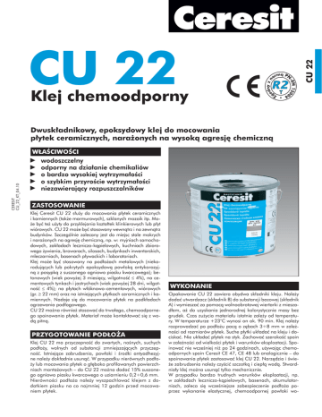 Klej chemoodporny CERESIT CU_22_KT_04.10 Dwuskładnikowy, epoksydowy klej do mocowania płytek ceramicznych, narażonych na wysoką agresję chemiczną WŁAŚCIWOŚCI wodoszczelny odporny na działanie chemikaliów o bardzo wysokiej wytrzymałości o szybkim przyroście wytrzymałości niezawierający rozpuszczalników ZASTOSOWANIE Klej Ceresit CU 22 służy do mocowania płytek ceramicznych i kamiennych (także marmurowych), szklanych mozaik itp. Może być też użyty do przyklejania kształtek klinkierowych lub płyt wiórowych. CU 22 może być stosowany wewnątrz i na zewnątrz budynków. Szczególnie zalecany jest do miejsc stale mokrych i narażonych na agresję chemiczną, np. w: myjniach samochodowych, zakładach leczniczo-kąpielowych, kuchniach zbiorowego żywienia, browarach, silosach, budynkach inwentarskich, mleczarniach, basenach pływackich i laboratoriach. Klej może być stosowany na podłożach metalowych (niekorodujących lub pokrytych epoksydową powłoką antykorozyjną z posypką z suszonego ogniowo piasku kwarcowego); betonowych (wiek powyżej 3 miesięcy, wilgotność 4%), na cementowych tynkach i jastrychach (wiek powyżej 28 dni, wilgotność 4%); na płytach włóknowo-cementowych, wiórowych (gr. ³ 22 mm) oraz na istniejących płytkach ceramicznych i kamiennych. Nadaje się do mocowania płytek na podkładach ogrzewania podłogowego. CU 22 można również stosować do trwałego, chemoodpornego spoinowania płytek. Materiał może kontaktować się z wodą pitną. PRZYGOTOWANIE PODŁOŻA Klej CU 22 ma przyczepność do zwartych, nośnych, suchych podłoży, wolnych od substancji zmniejszających przyczepność. Istniejące zabrudzenia, powłoki i środki antyadhezyjne należy dokładnie usunąć. W przypadku nierównych podłoży lub mocowania płytek o głęboko profilowanych powierzchniach montażowych – do CU 22 można dodać 15% suszonego ogniowo piasku kwarcowego o uziarnieniu 0,2÷0,6 mm. Nierówności podłoża należy wyszpachlować klejem z dodatkiem piasku na co najmniej 12 godzin przed mocowaniem płytek. WYKONANIE Opakowanie CU 22 zawiera obydwa składniki kleju. Należy dodać utwardzacz (składnik B) do substancji bazowej (składnik A) i wymieszać za pomocą wolnoobrotowej wiertarki z mieszadłem, aż do uzyskania jednorodnej kolorystycznie masy bez grudek. Czas zużycia materiału istotnie zależy od temperatury. W temperaturze +23°C wynosi on ok. 90 min. Klej należy rozprowadzać po podłożu pacą o zębach 3÷8 mm w zależności od rozmiarów płytek. Suche płytki układać na kleju i dociskać. Nie układać płytek na styk. Zachować szerokość spoin w zależności od wielkości płytek i warunków eksploatacji. Spoinować nie wcześniej niż po 24 godzinach, używając chemoodpornych spoin Ceresit CE 47, CE 48 lub analogicznie – do spoinowania płytek zastosować klej CU 22. Narzędzia i świeże zabrudzenia należy czyścić szczotką i ciepłą wodą. Stwardniały klej można usunąć tylko mechanicznie. W przypadku bardzo trudnych warunków eksploatacji, np. w zakładach leczniczo-kąpielowych, basenach, akumulatorniach, zaleca się wcześniejsze zabezpieczenie podłoża poprzez wykonanie elastycznej, chemoodpornej powłoki wo- CU 22 CU 22 UWAGA Prace należy wykonywać w suchych warunkach, przy temperaturze powietrza i podłoża od +10°C do +25C. Wszelkie dane odnoszą się do temperatury +23C i wilgotności względnej powietrza 50%. W innych warunkach należy uwzględnić krótszy lub dłuższy czas twardnienia materiału. Materiał zawiera substancje szkodliwe dla zdrowia. Nieutwardzona żywica może powodować odczyny alergiczne. Zabrudzenia zmywać wodą. Stosować rękawice i okulary ochronne. W przypadku kontaktu z oczami płukać je obficie wodą i zasięgnąć porady lekarza. W pomieszczeniach zapewnić odpowiednią wentylację. Chronić przed dziećmi. ZALECENIA Niniejsza karta techniczna określa zakres stosowania materiału i sposób prowadzenia robót, ale nie może zastąpić zawodowego przygotowania wykonawcy. Oprócz podanych informacji prace należy wykonywać zgodnie ze sztuką budowlaną i zasadami BHP. Producent gwarantuje jakość wyrobu, natomiast nie ma wpływu na warunki i sposób jego użycia. W przypadku wątpliwości należy wykonać własne próby stosowania. Wraz z ukazaniem się tej karty technicznej tracą ważność karty wcześniejsze. DANE TECHNICZNE Baza: żywica epoksydowa z mineralnymi wypełniaczami i dodatkami Kolor: szary Gęstość świeżego kleju: 1,6 kg/dm3 Proporcje mieszania: 3 części wagowe składnika A na 1 część składnika B Temperatura stosowania: od +10°C do +25°C Czas zużycia: ok. 90 min Czas otwarty (wg normy PN-EN 12004): Spoinowanie: po 24 godz. Spływ (wg normy PN-EN 12004): 0,5 mm Przyczepność (wg normy PN-EN 12004): - początkowa: 2,0 MPa - po zanurzeniu w wodzie: 2,0 MPa Wytrzymałość na ścinanie po szoku termicznym (wg normy PN-EN 12004): Odporność chemiczna: SKŁADOWANIE Do 12 miesięcy od daty produkcji przy składowaniu w suchych warunkach i w oryginalnych, nieuszkodzonych opakowaniach. Chronić przed mrozem! OPAKOWANIA Pojemniki metalowe 8 kg, zawierające obydwa składniki. przyczepność 0,5 N/mm2 po czasie nie krótszym niż 20 min 2,0 MPa po 7 dniach, zgodnie z tabelą odporności chemicznej materiałów Ceresit Odporność na temperaturę po całkowitym utwardzeniu: - warunki suche: od -30°C do +100C - warunki wilgotne: od -30°C do +70C Orientacyjne zużycie: wymiar zębów pacy [mm] 3 mm 4 mm 6 mm 8 mm Wyrób zgodny z normą PN-EN 12004:2008. Henkel Polska Sp. z o.o. ul. Domaniewska 41, 02-672 Warszawa Centralny Dział Obsługi Klienta: Tel. (+48) 41 371 01 00 • Fax (+48) 41 374 22 22 www.ceresit.pl • infolinia: 800 120 241 Buduj korzystając z profesjonalnych rozwiązań. ilość CU 22 [kg/m2] 1,9 2,2 2,8 3,4 CERESIT CU_22_KT_04.10 CU 22 doszczelnej. Aby uzyskać wodoszczelność w narożach, na krawędziach i w szczelinach dylatacyj